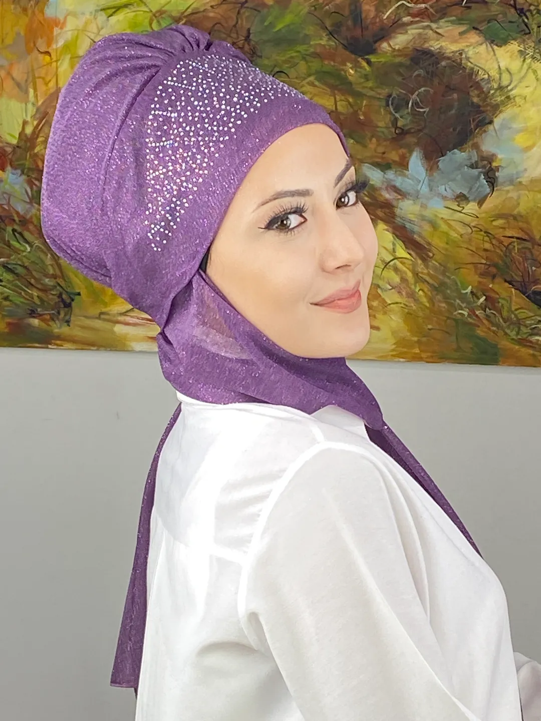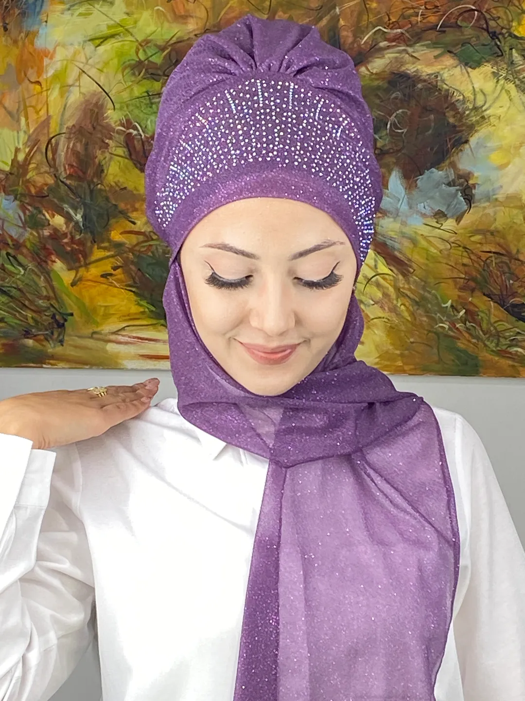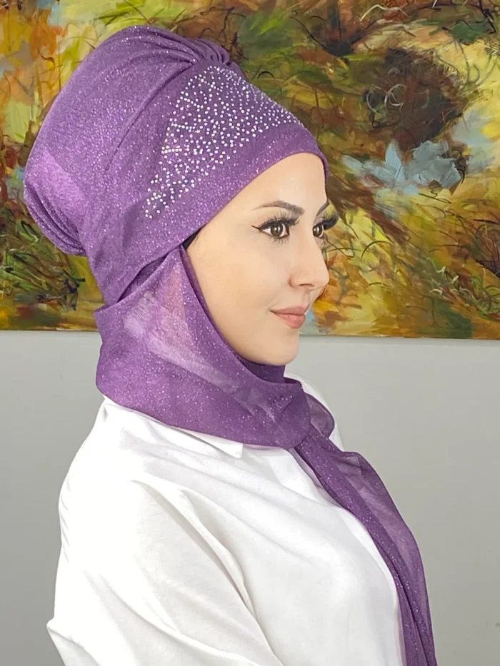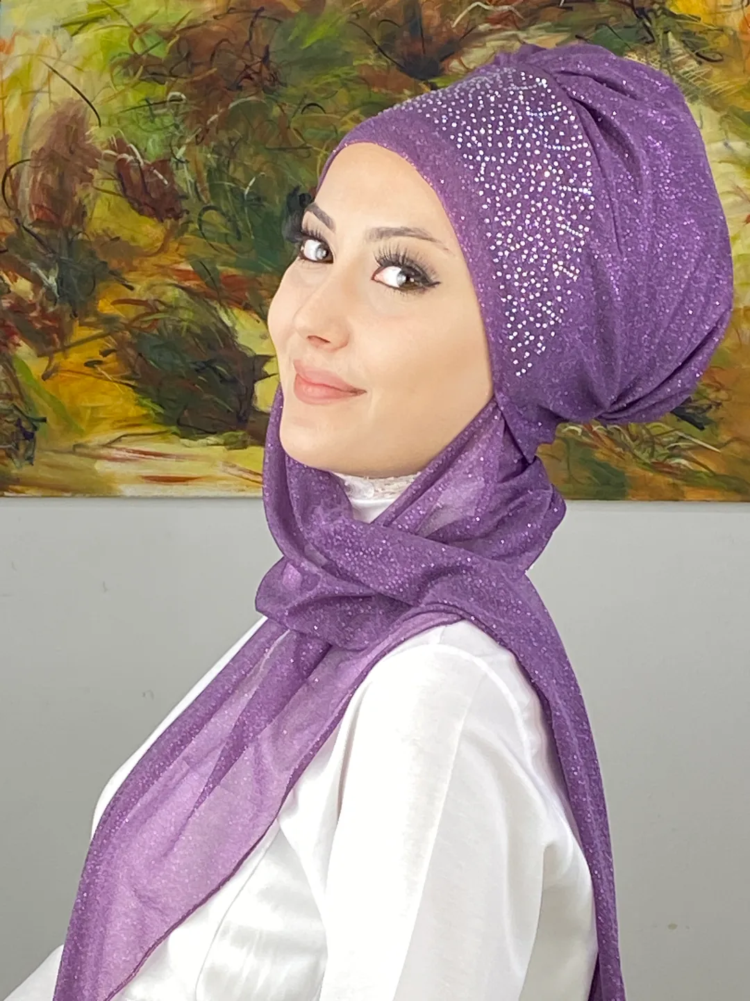 Güneş Model Taşlı Abiye Atkılı Bone Şal – Leylak