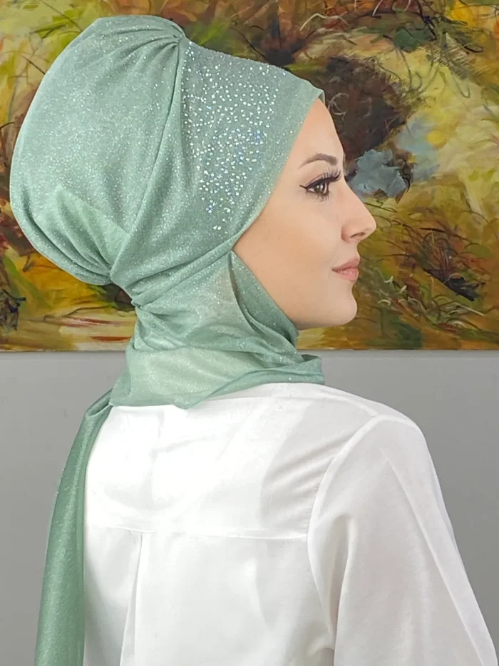 Güneş Model Taşlı Abiye Atkılı Bone Şal – Mint Yeşili,
