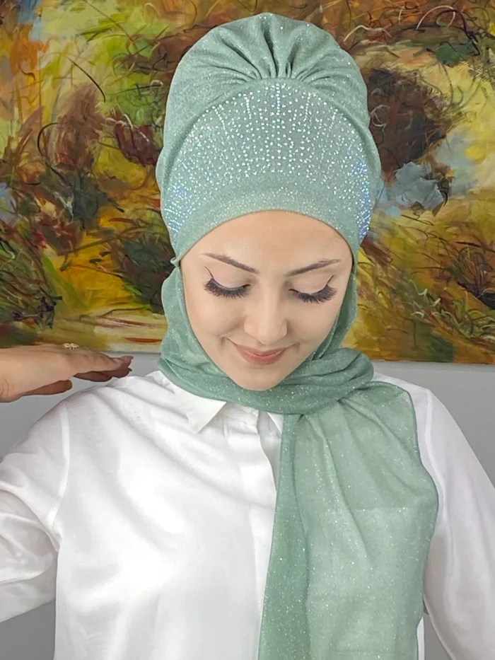 Güneş Model Taşlı Abiye Atkılı Bone Şal – Mint Yeşili