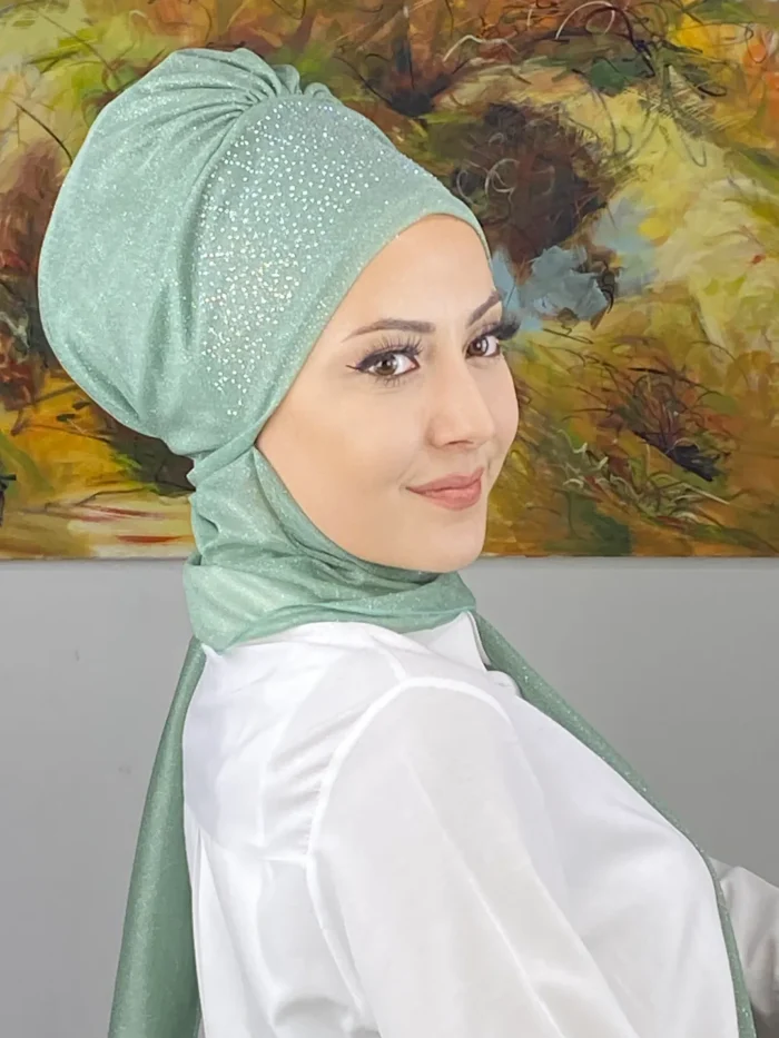 Güneş Model Taşlı Abiye Atkılı Bone Şal – Mint Yeşili ile zarif duruşunuzu taçlandırın.