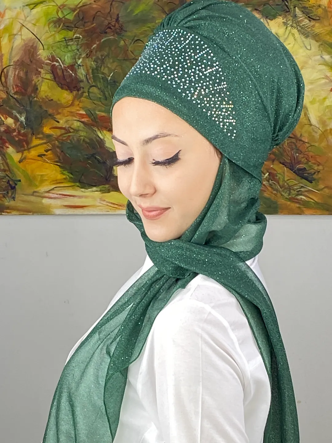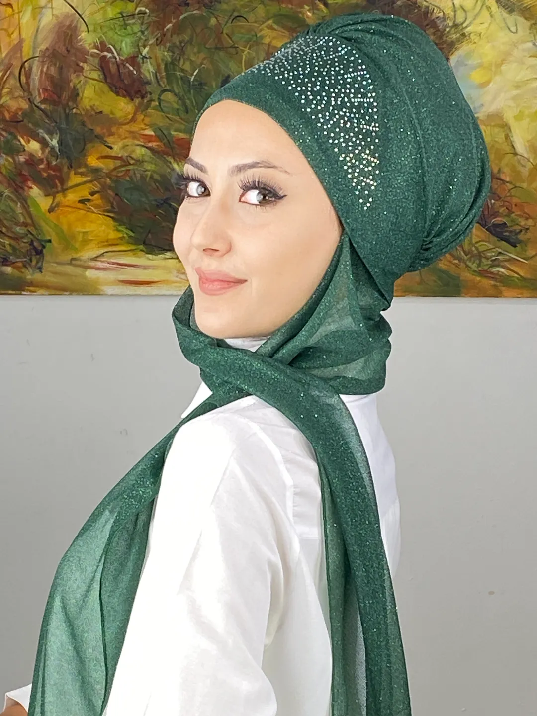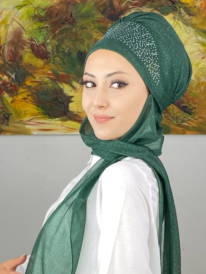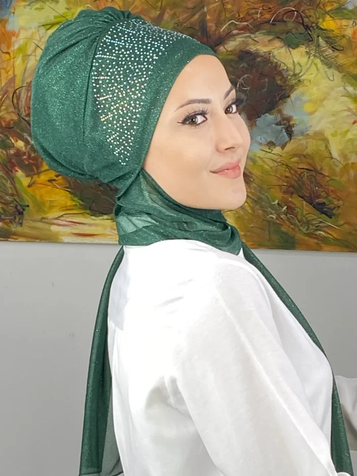 Güneş Model Taşlı Abiye Atkılı Bone Şal – Zümrüt Yeşili,