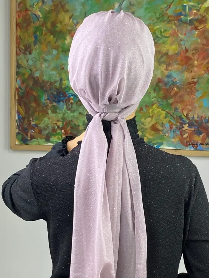 Simli dokusu, açık lila rengin pastel tonlarıyla birleşerek soft bir ışıltı yaratır.