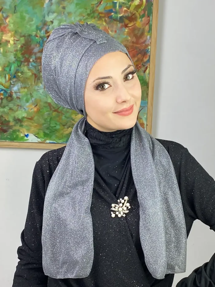 Simli detaylarıyla ışığı zarifçe yansıtan bu abiye bone, her stile uyum sağlayan sofistike bir parıltı sunar.