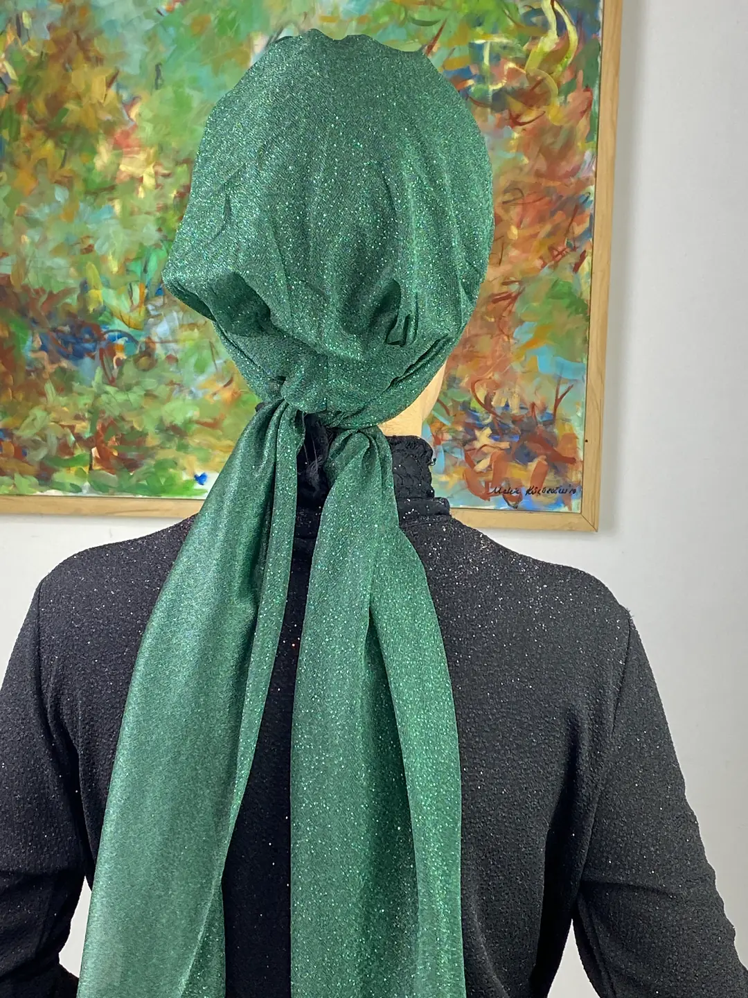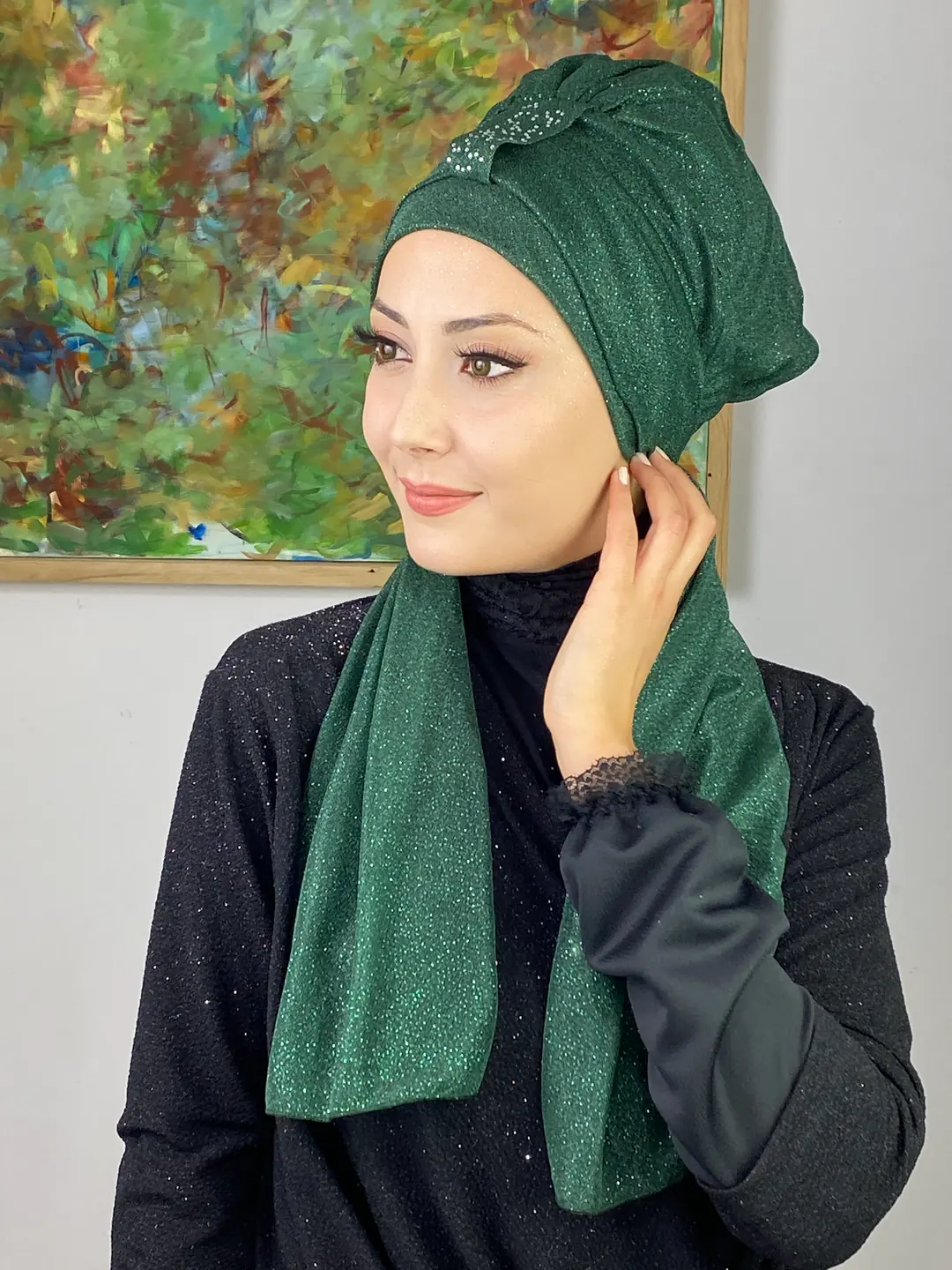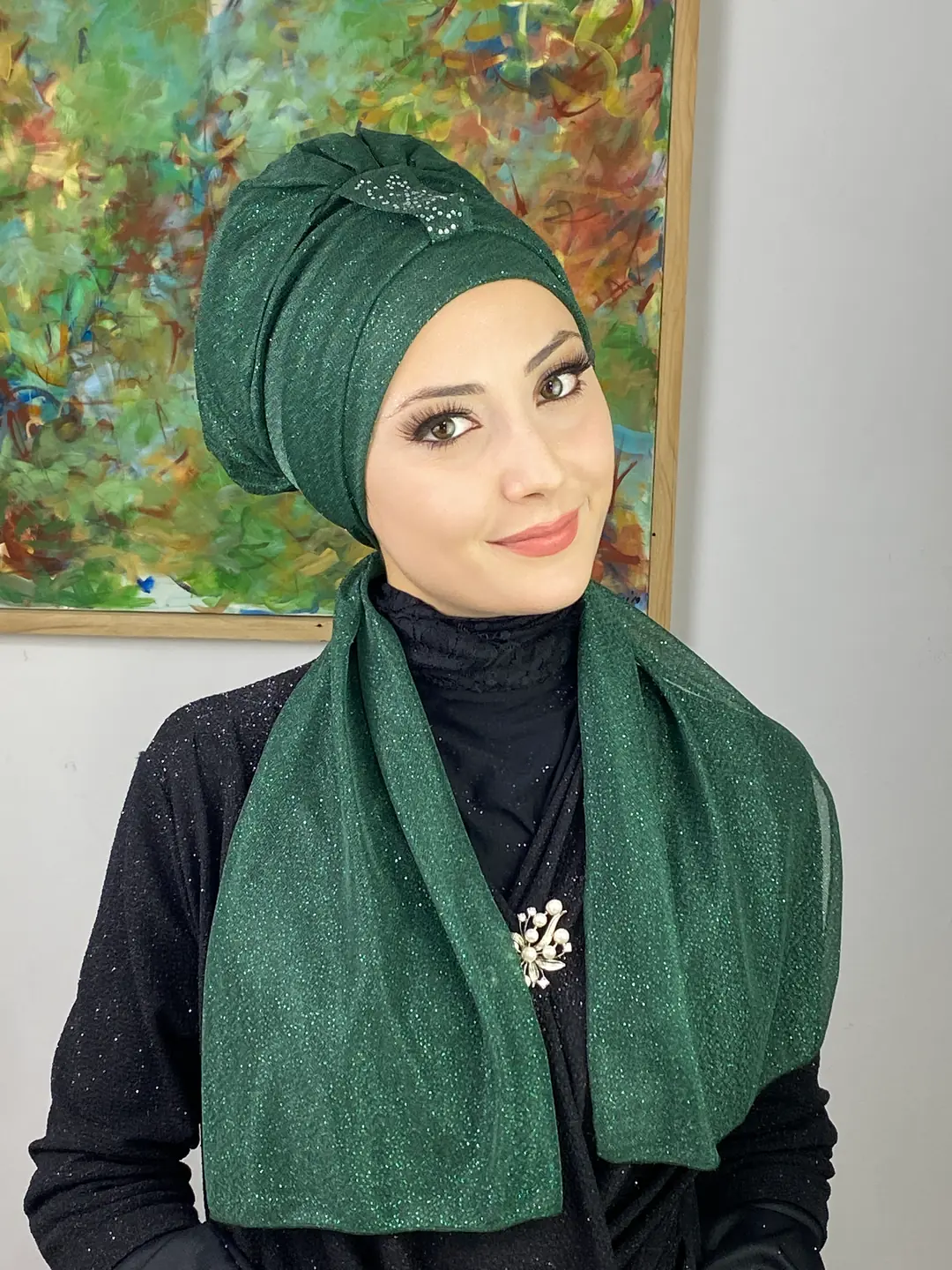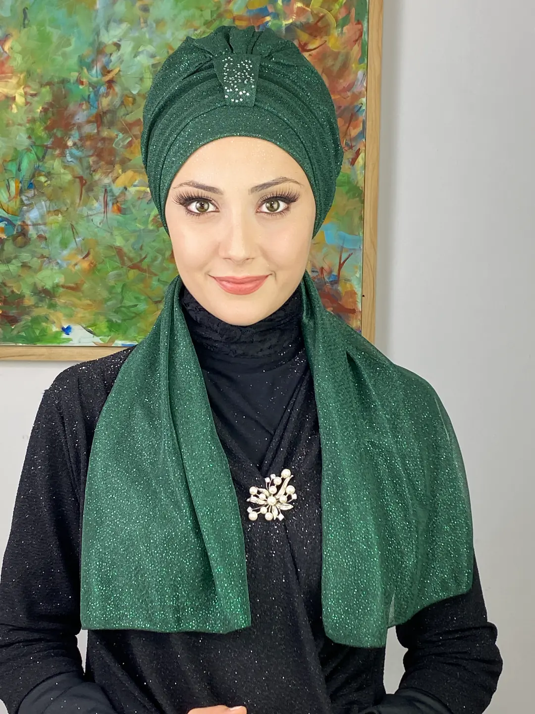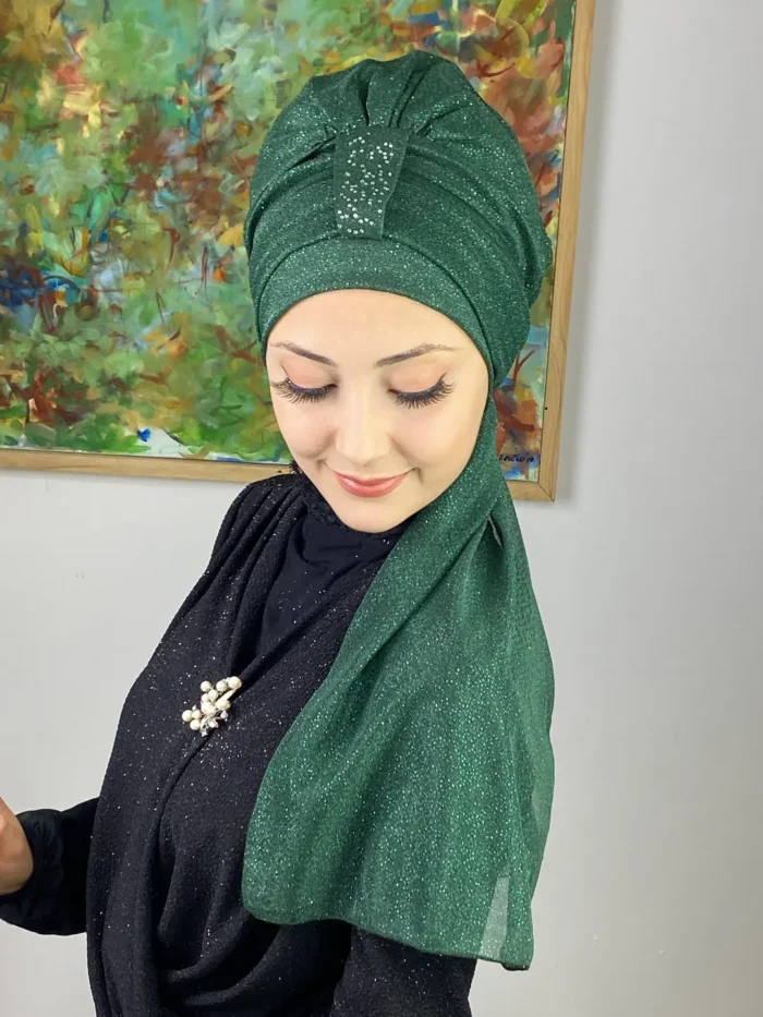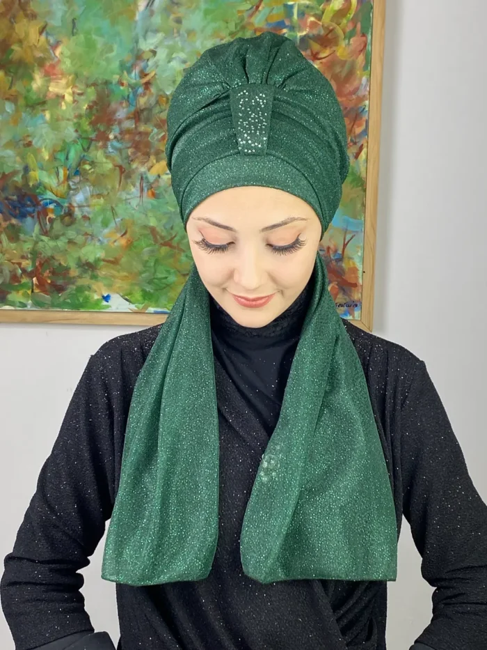 Derin zümrüt tonunun büyüleyici ışıltısı, bu abiye bone modelinde zarafetle buluşuyor.