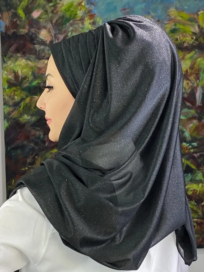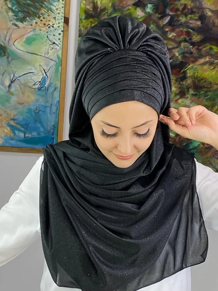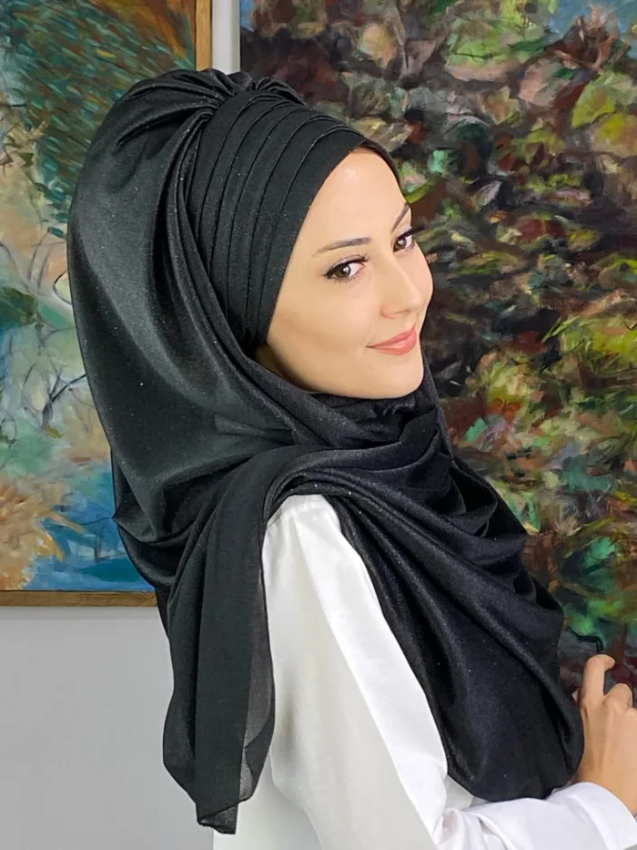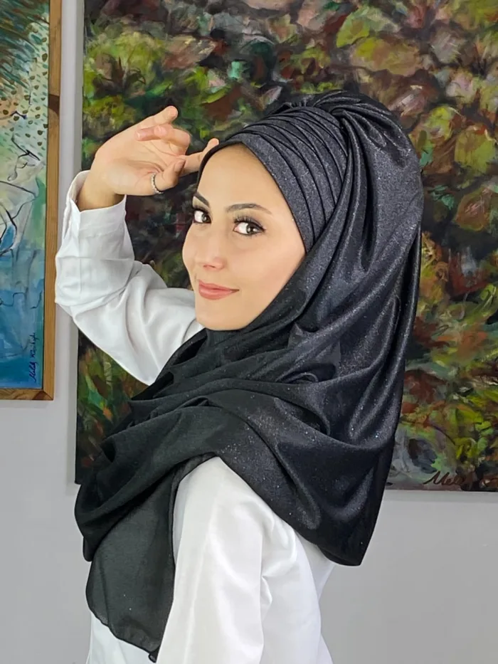 Siyah her zaman güçlü, elegan ve etkileyici… Işıltı Model Drapeli Simli Abiye Şal – Siyah; şıklığını zirveye taşımak isteyen kadınlar için kusursuz bir seçimdir. Işıltılı sim dokusu, siyahın derinliğiyle birleşerek göz kamaştırıcı bir bütünlük sunar.