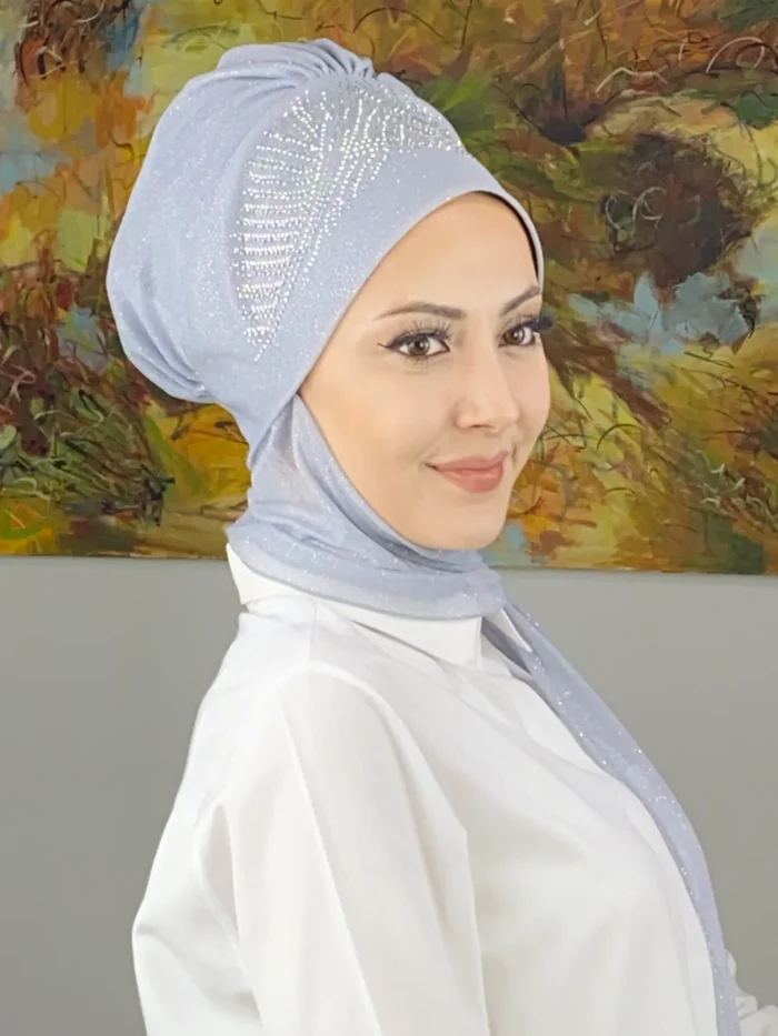 Kristal taç formundaki taş dizilimi, her ışıkta göz alıcı bir parıltı sunar. Atkılı tasarımı sayesinde hem bone hem şal olarak pratik kullanım sağlar.