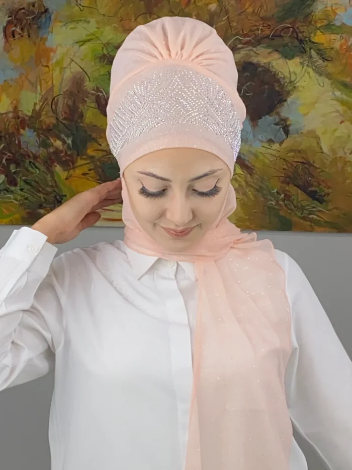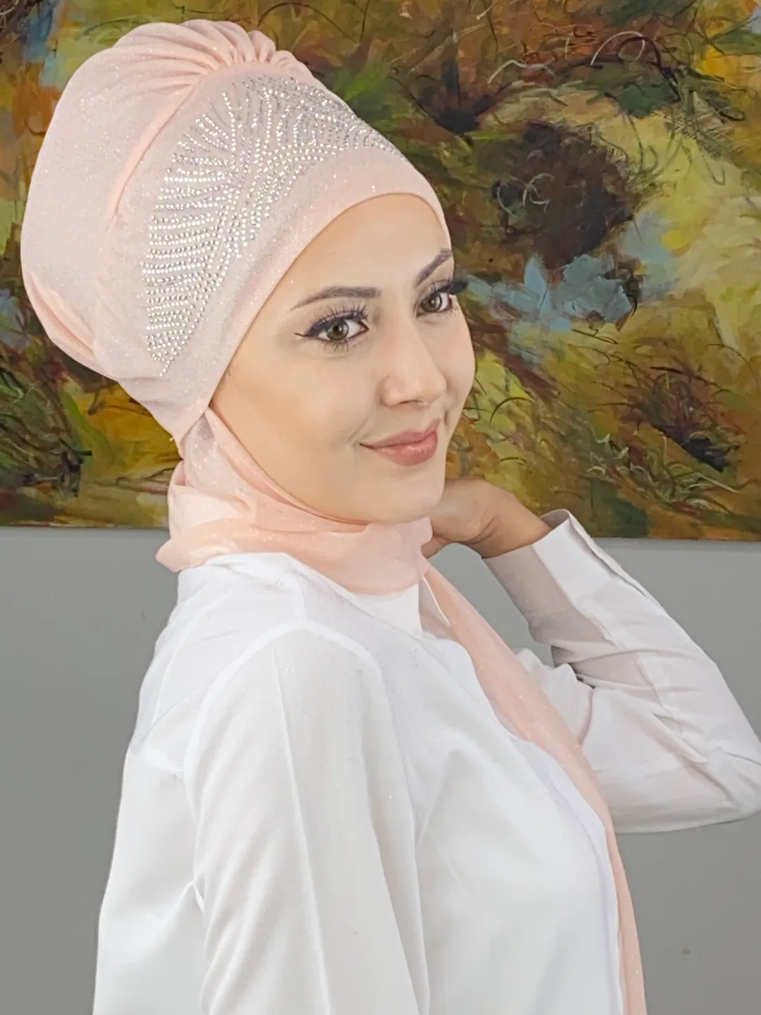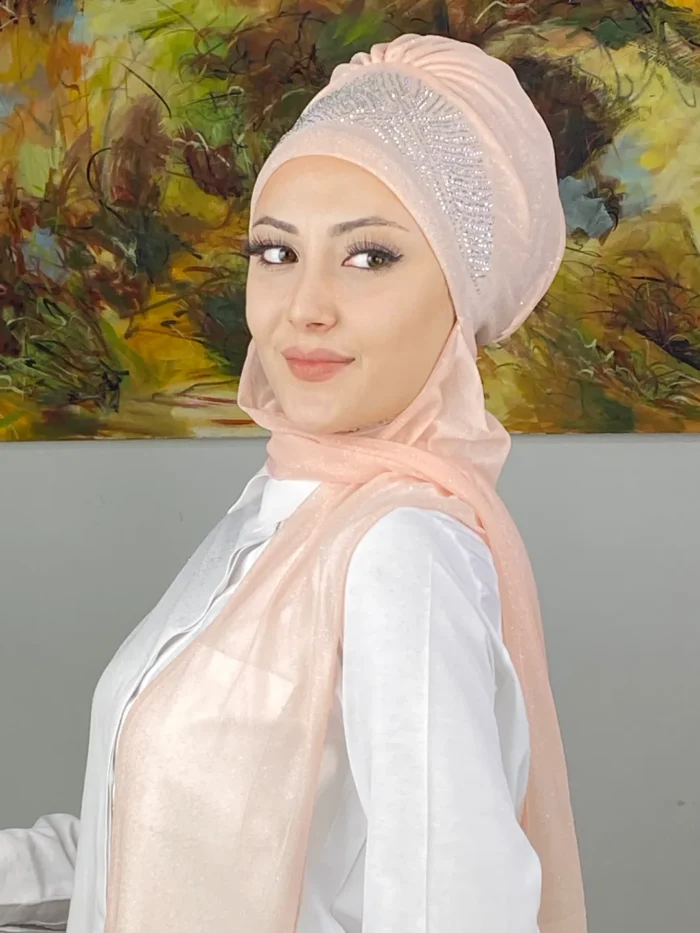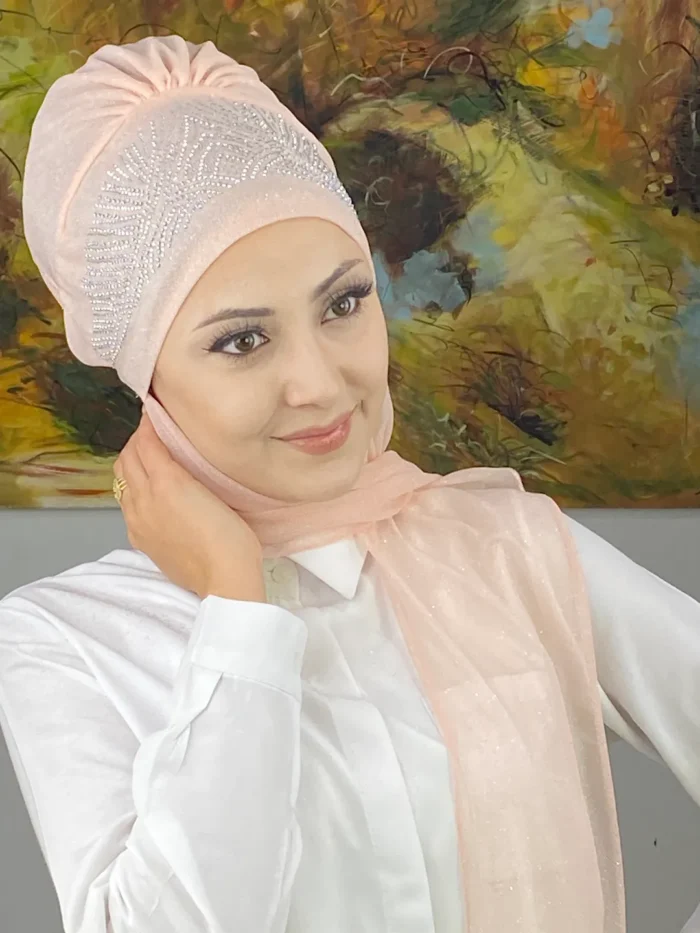 Kristal Taç Model Taşlı Abiye Atkılı Bone Şal – Açık Somon Zarafeti