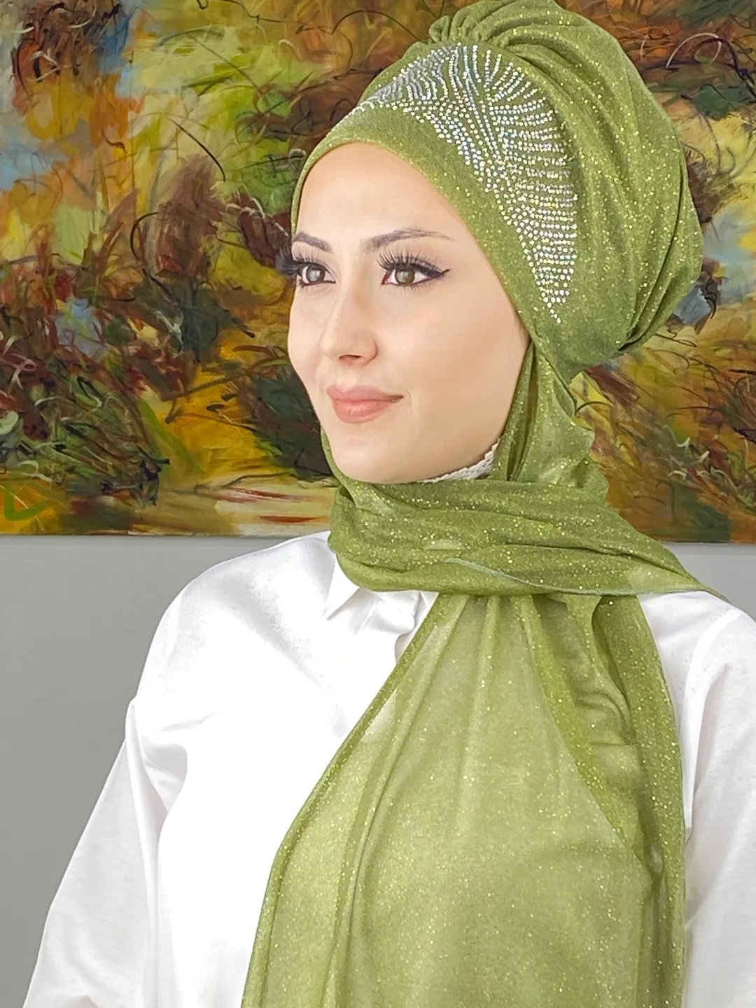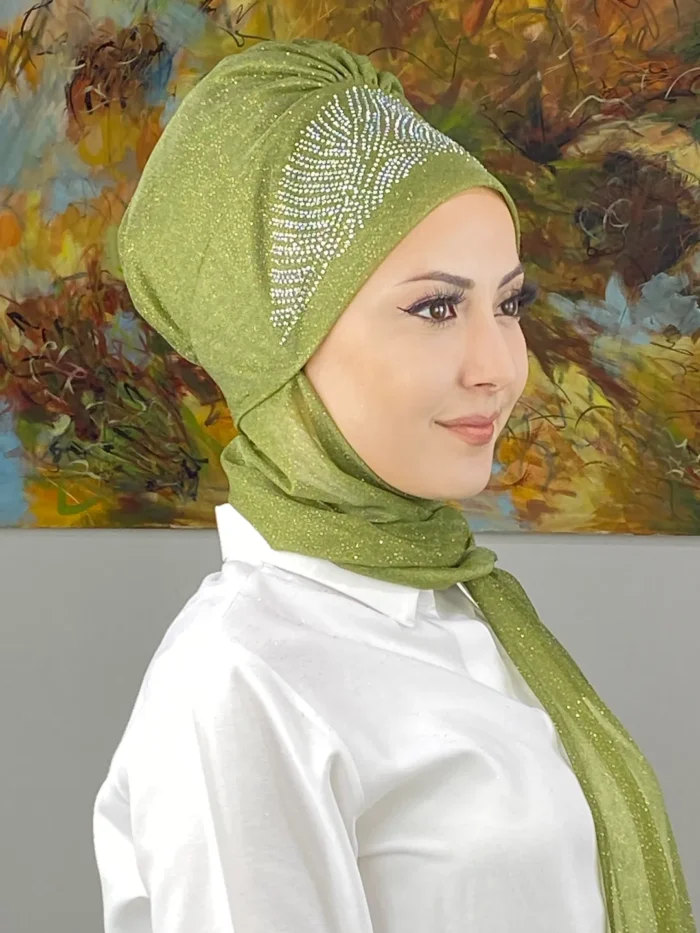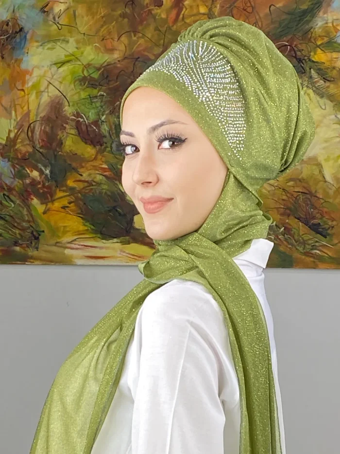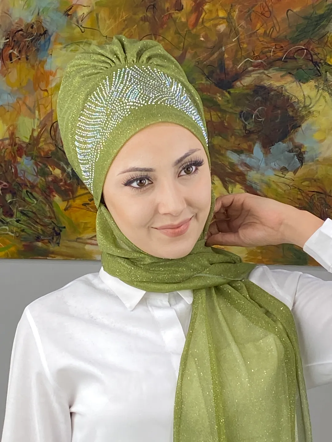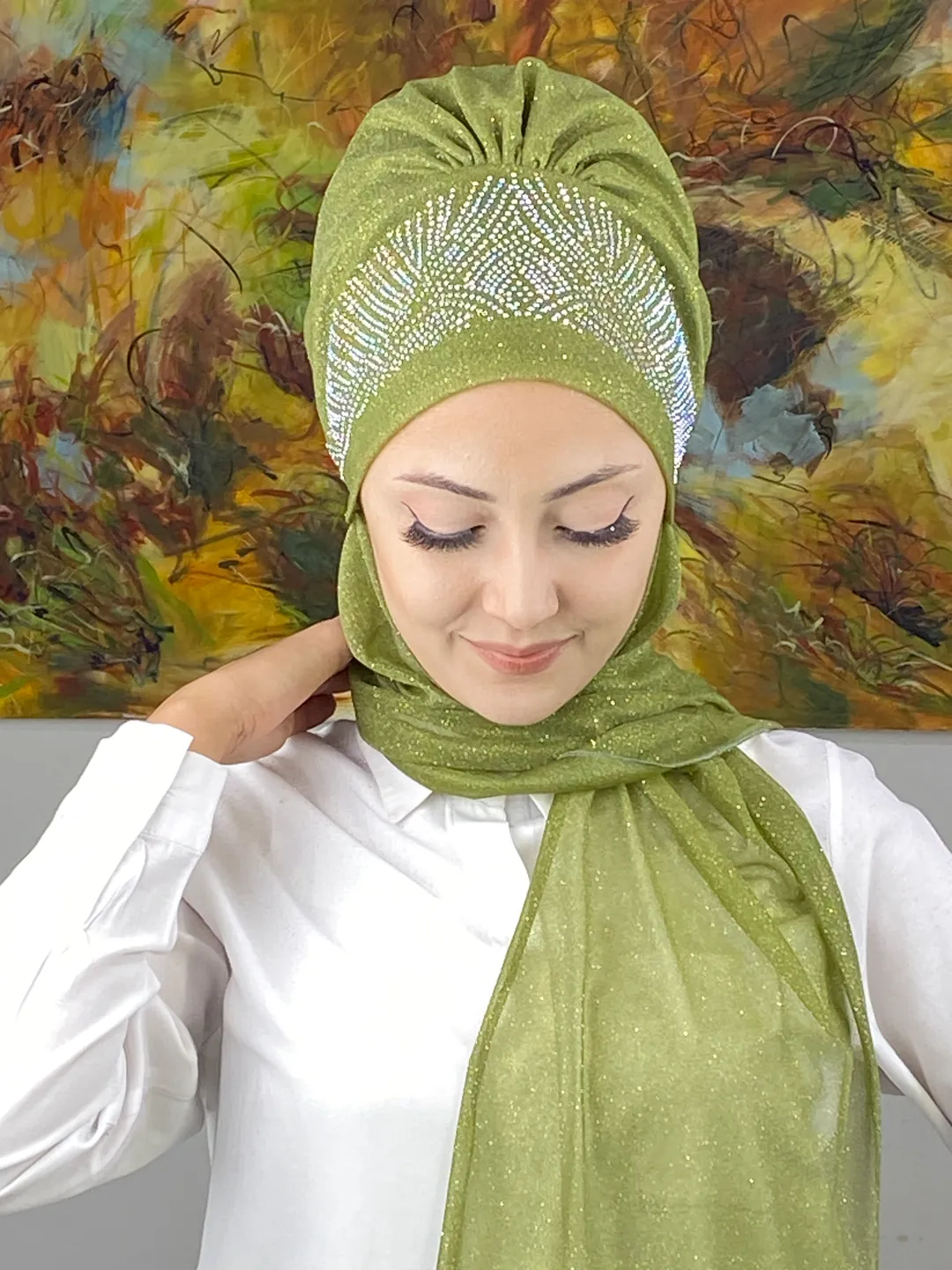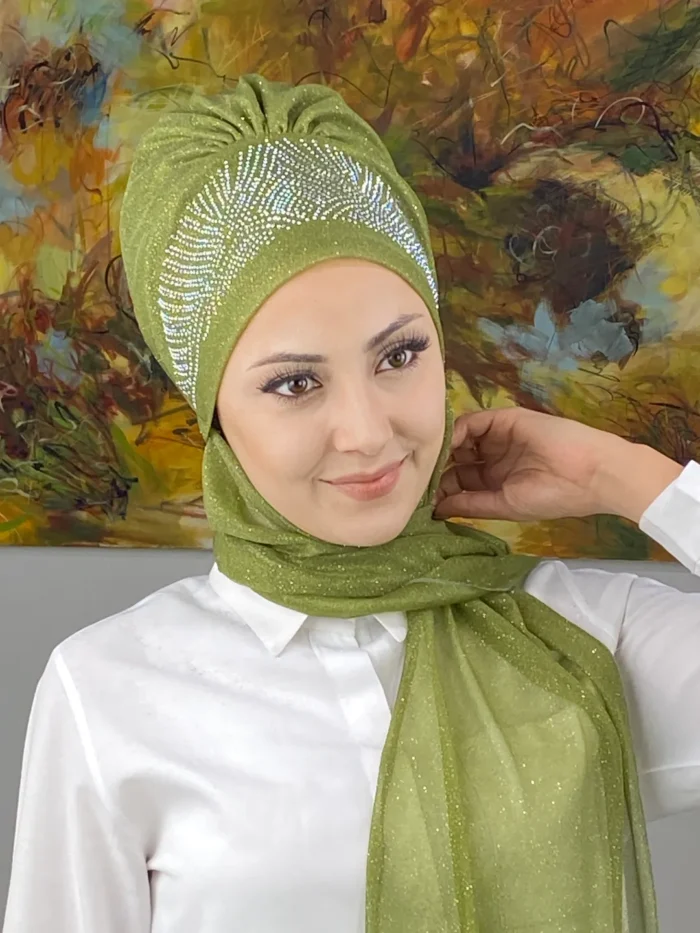 Kristal Taç Model Taşlı Abiye Atkılı Bone Şal – Açık Yağ Yeşili, bu doğallığı taşlı detaylarla birleştirerek özel günlerde ferah ve asil bir görünüm sunar.