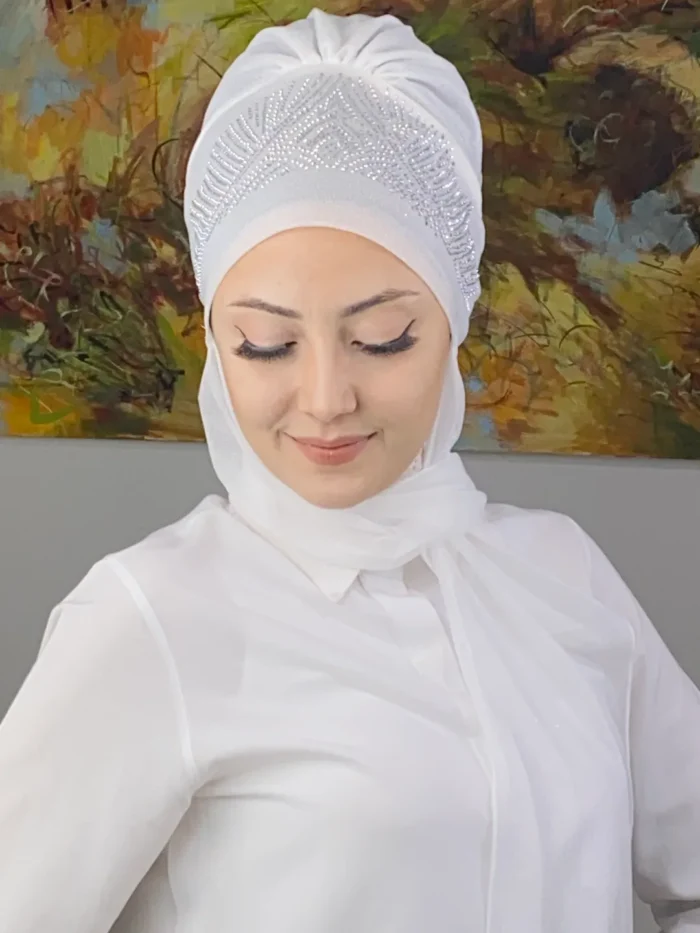 Kristal Taç Model Taşlı Abiye Atkılı Bone Şal – Beyaz