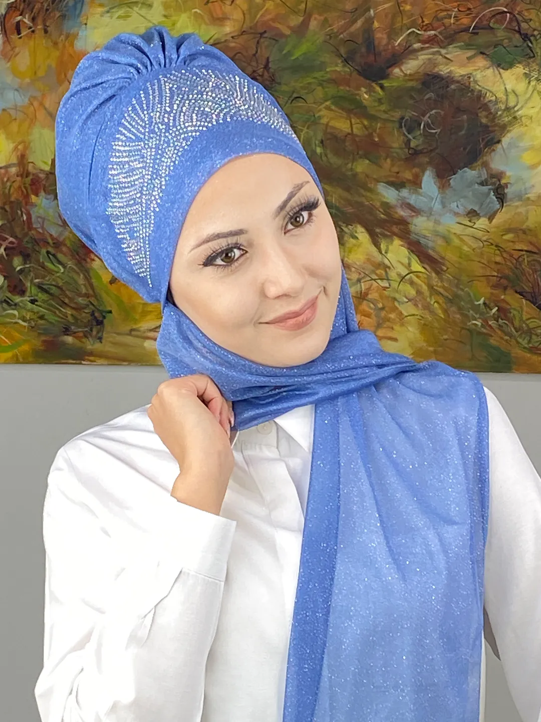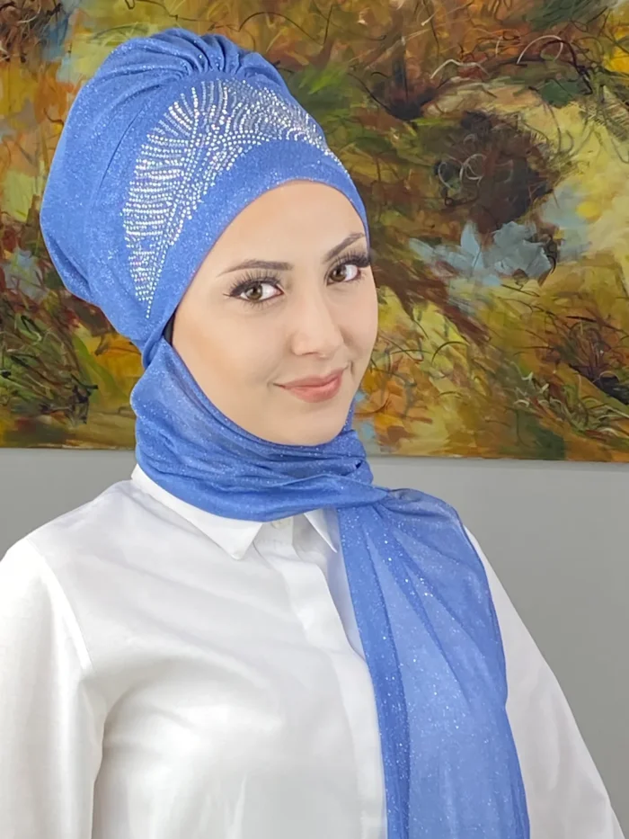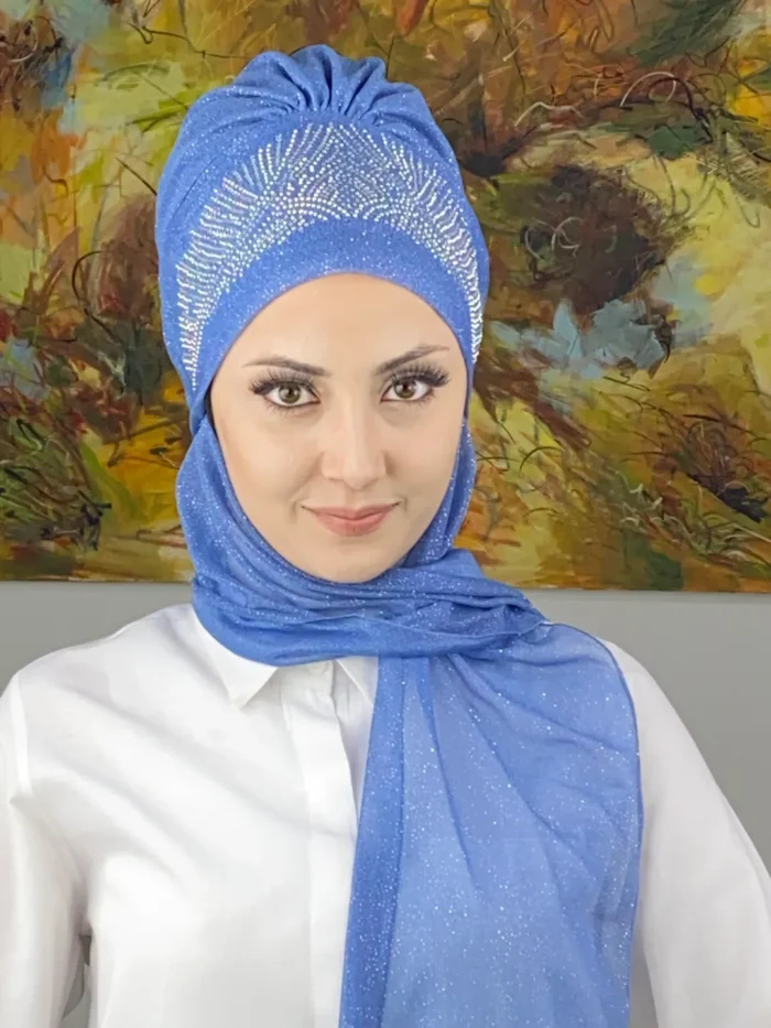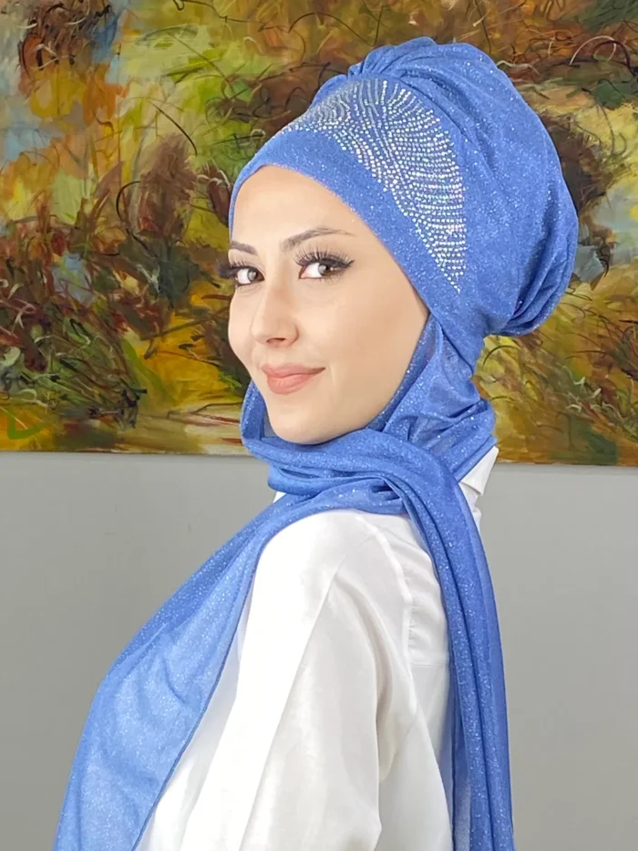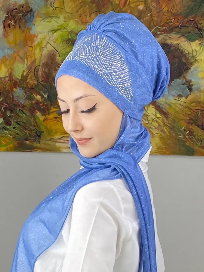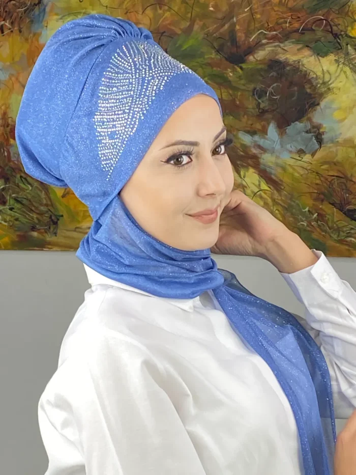 Kristal Taç Model Taşlı Abiye Atkılı Bone Şal – İndigo Mavi, bu etkileyici rengi kristal taşlarla birleştirerek zamansız bir zarafet sunar.