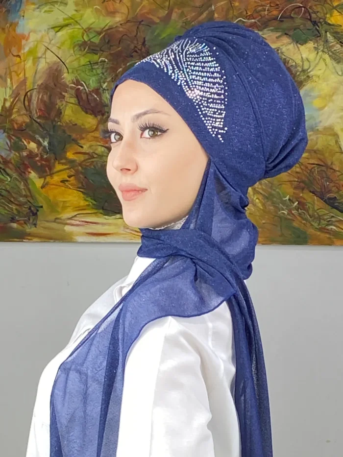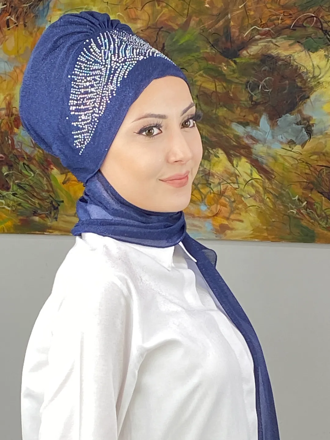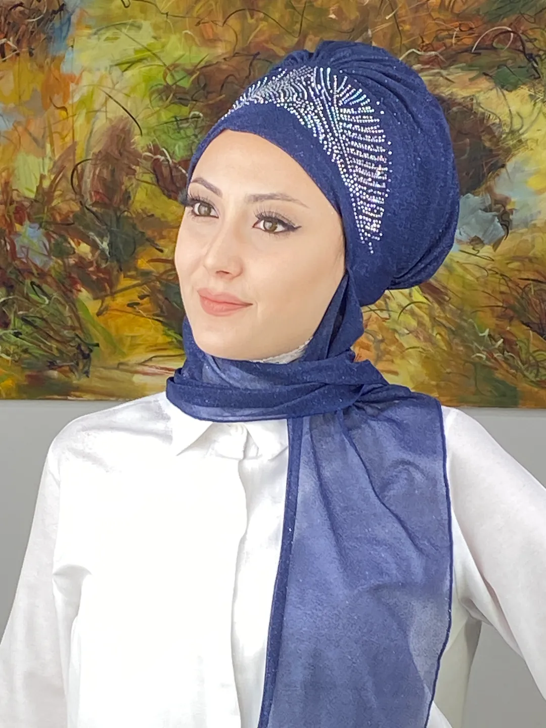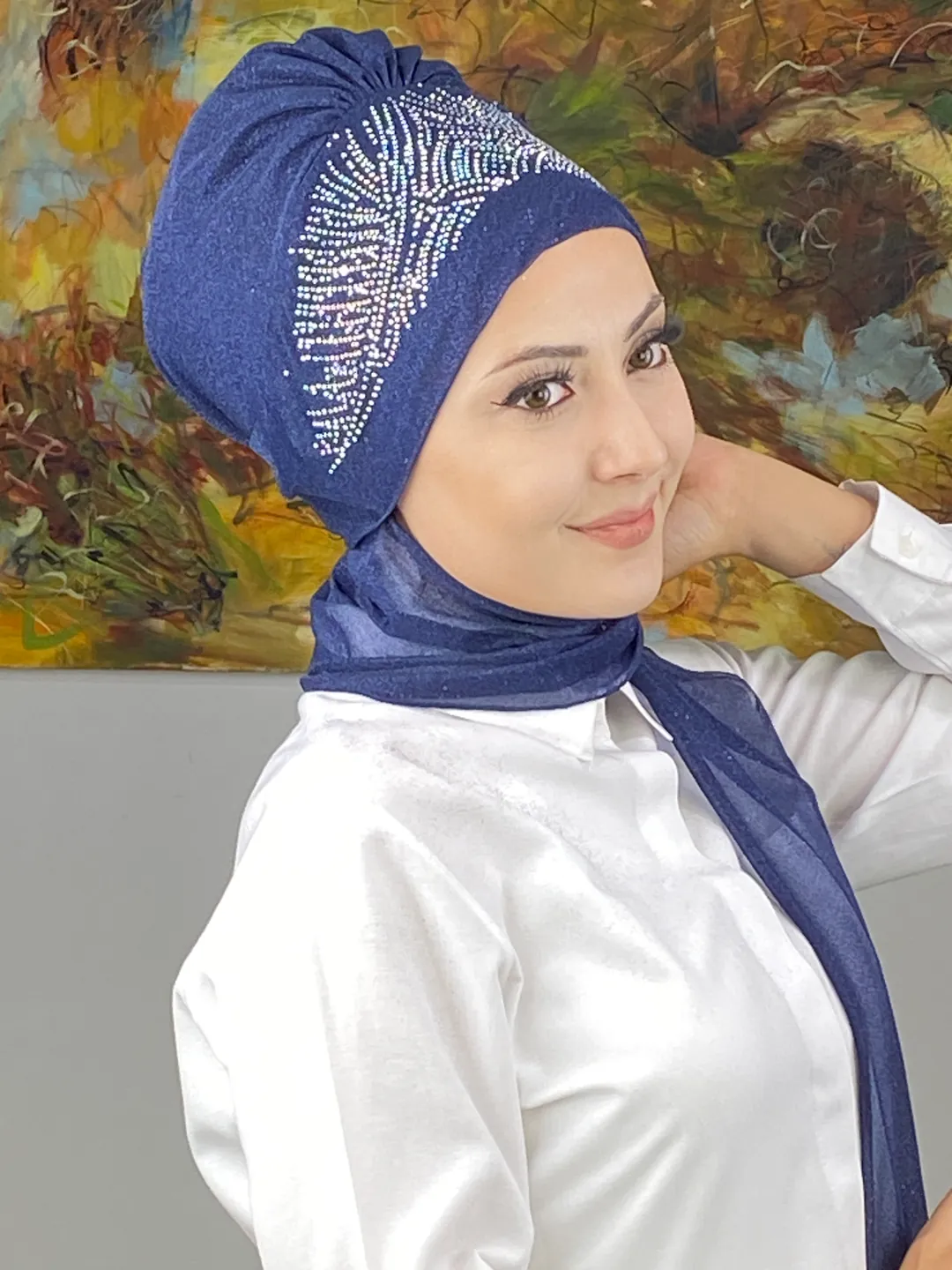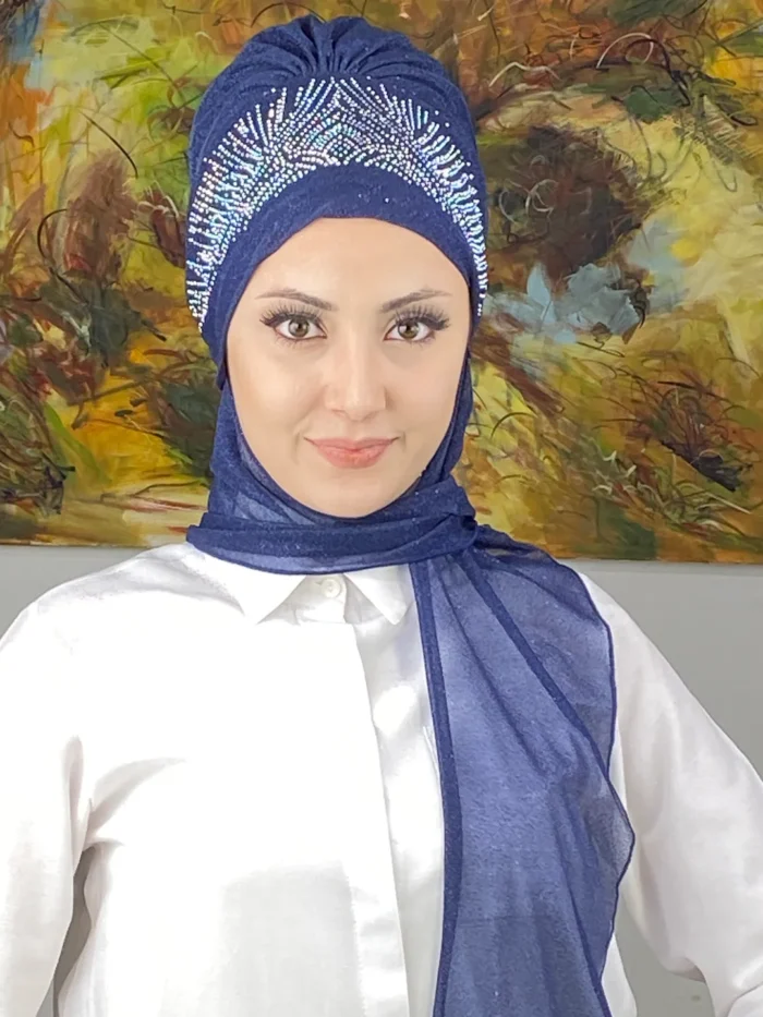 Kristal Taç Model Taşlı Abiye Atkılı Bone Şal – Koyu Lacivert