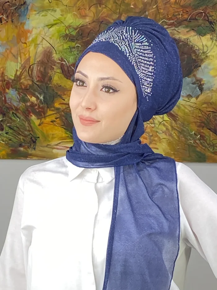 Kristal taşlı taç detayı, baş bölgesine dikkat çeken bir zarafet kazandırır. Bu model, klasik şallardan farklı olarak ışığı her hareketinizde yansıtır. Atkılı tasarımı sayesinde kolay kullanım sunar; dağılma ya da kayma yapmaz.