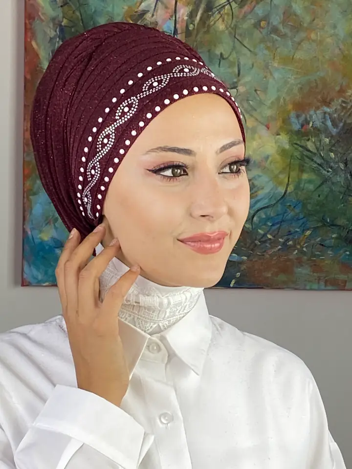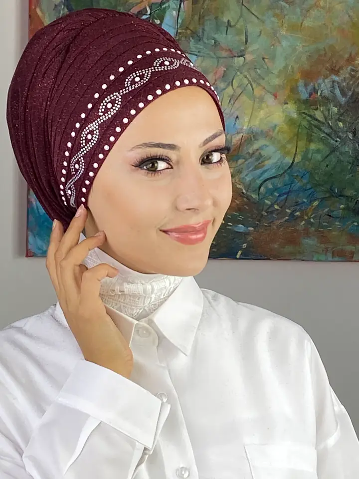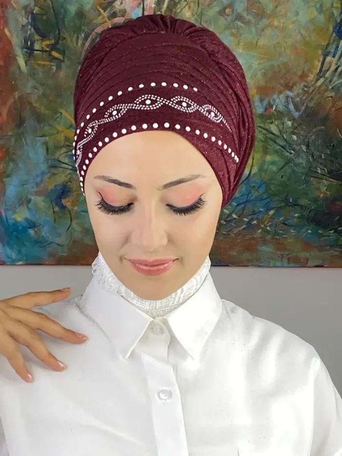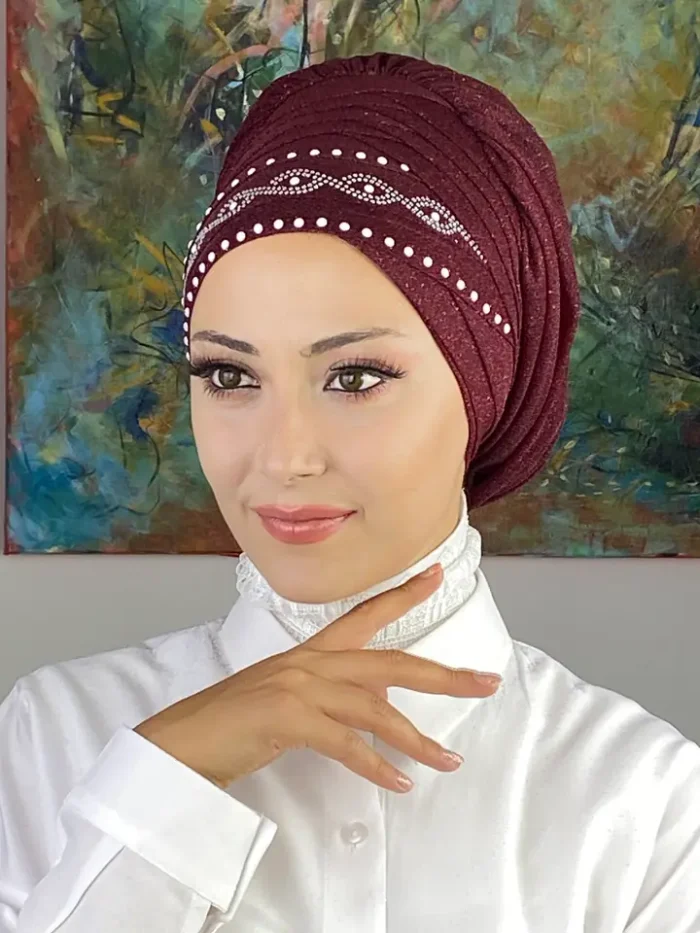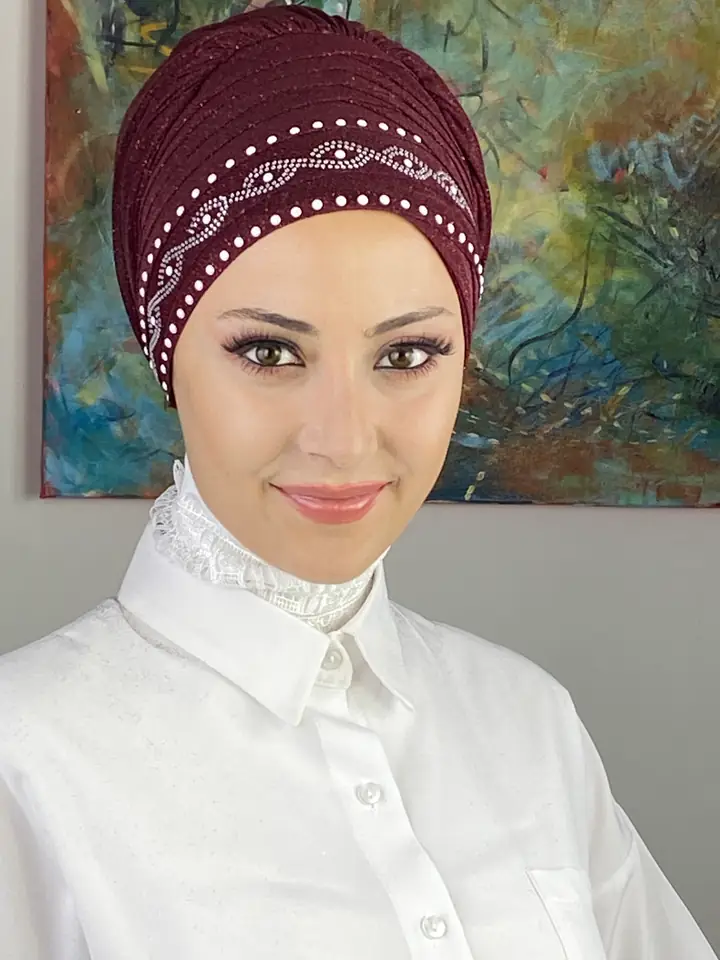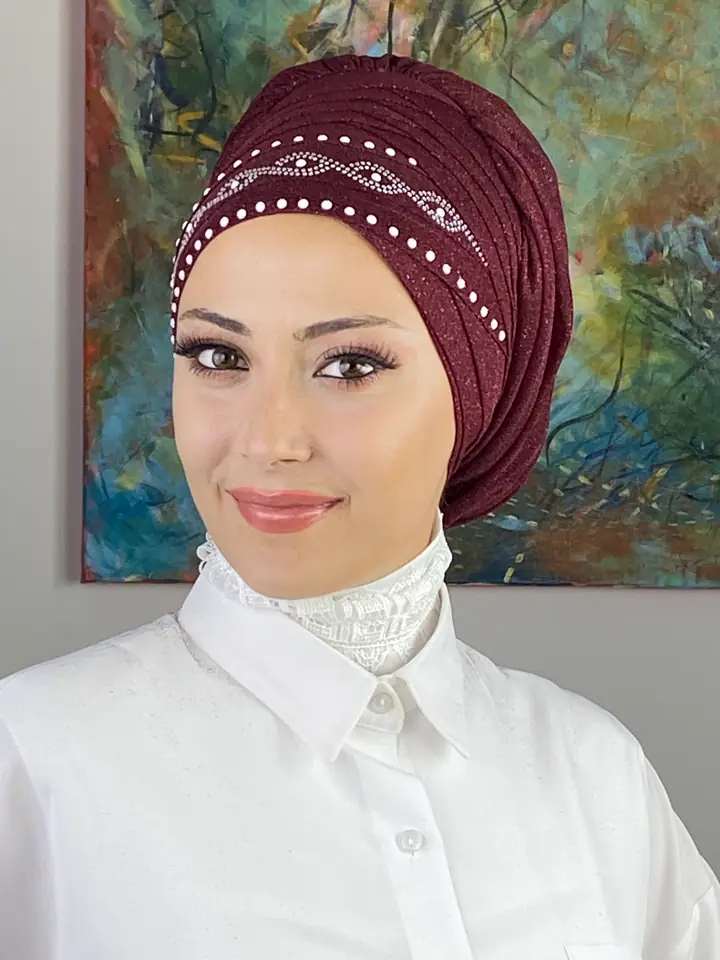 Şıklığınızı tamamlamak için Kuşgözü Model Gümüş Taşlı İnci Detaylı Simli Şifon Bone Şal – Bordo’yu hemen sipariş edin!