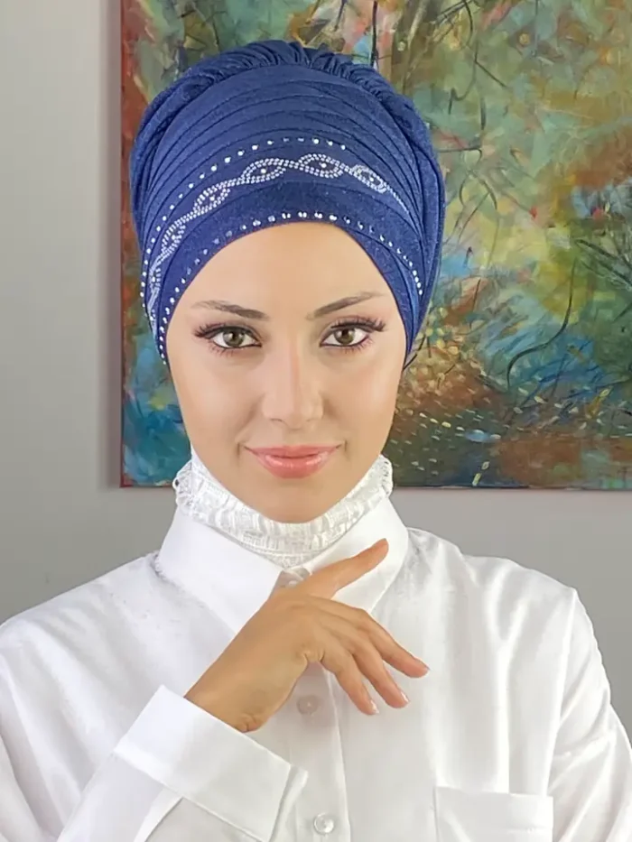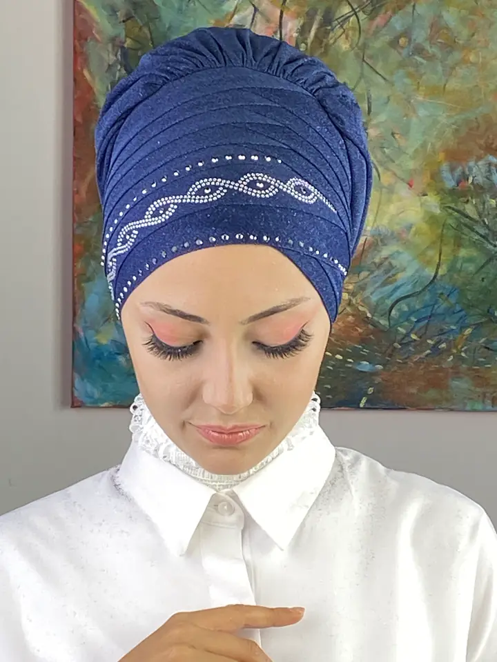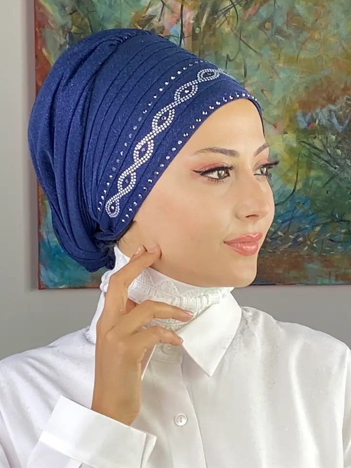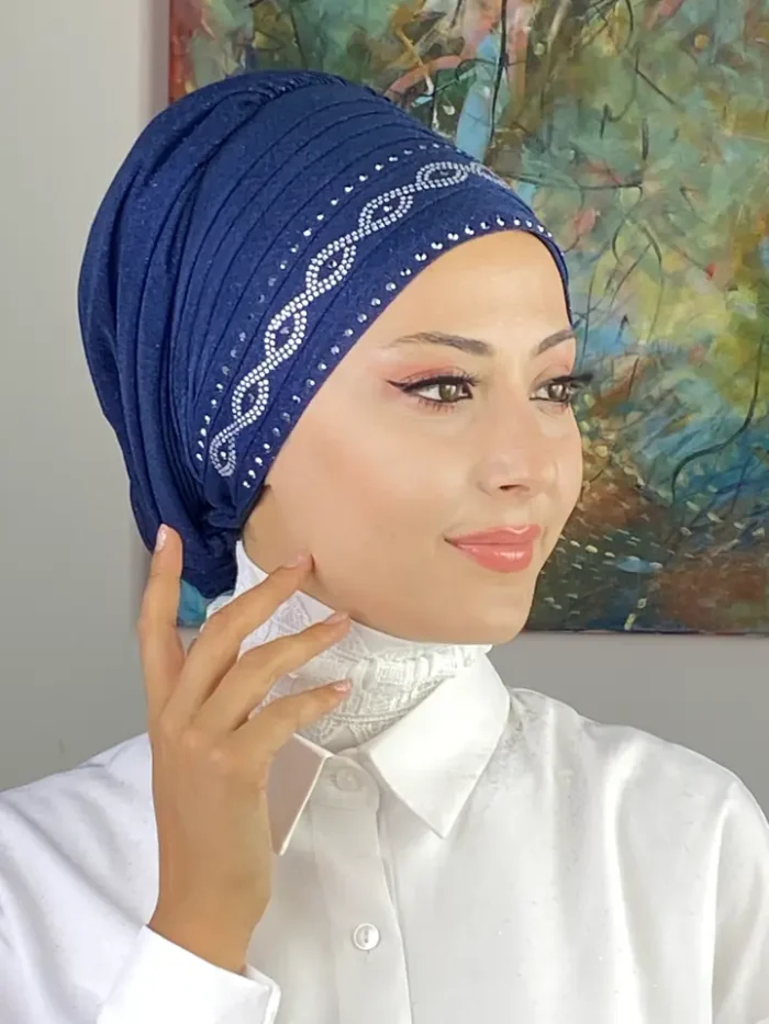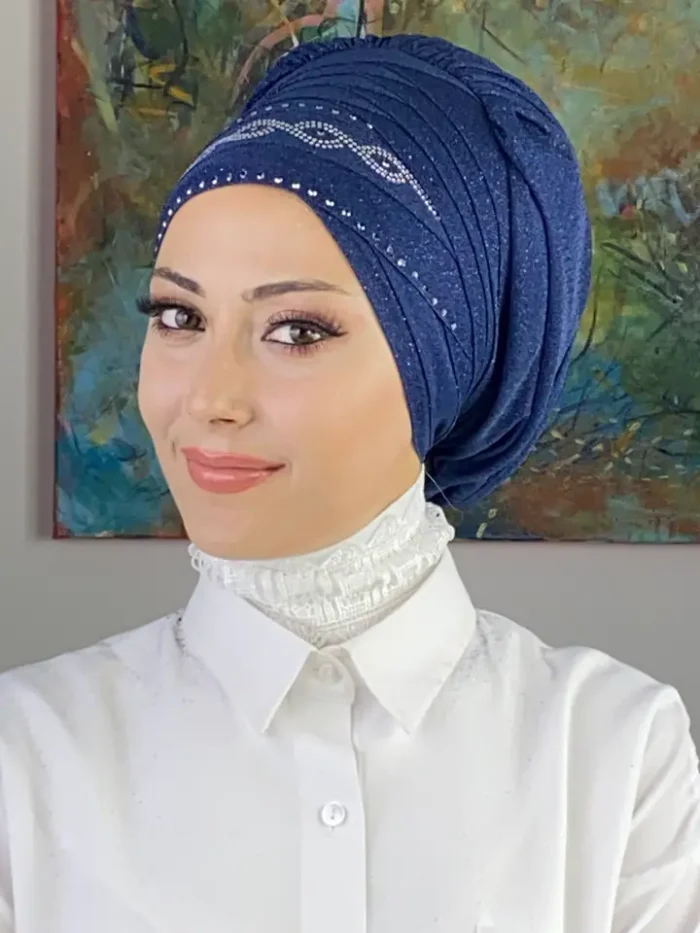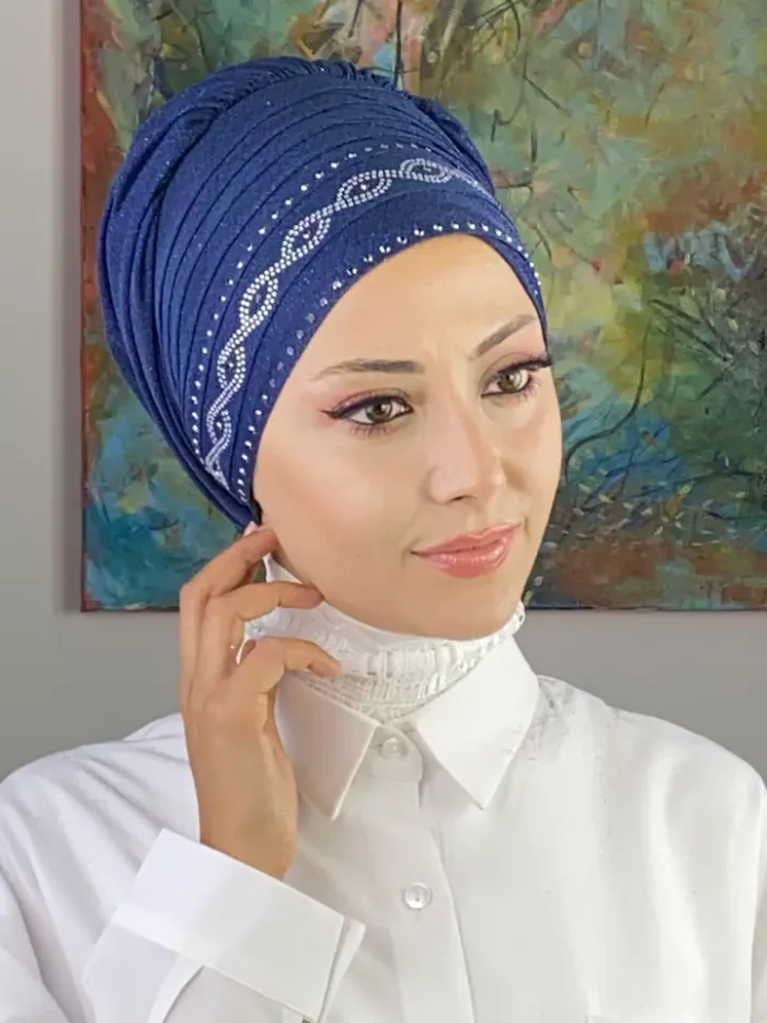 Kuşgözü Model Gümüş Taşlı ve Konik Ortası Siyah Taşlı Simli Şifon Bone Şal – Lacivert 💙