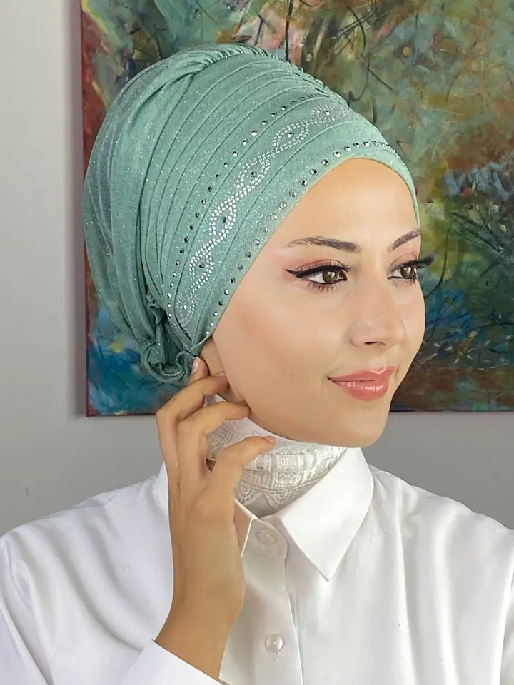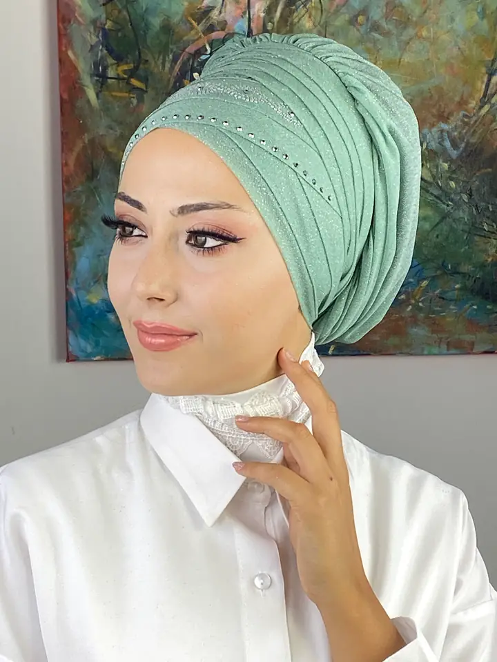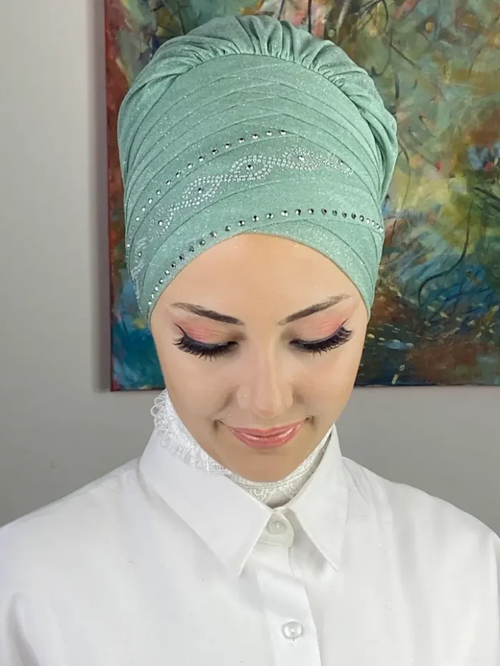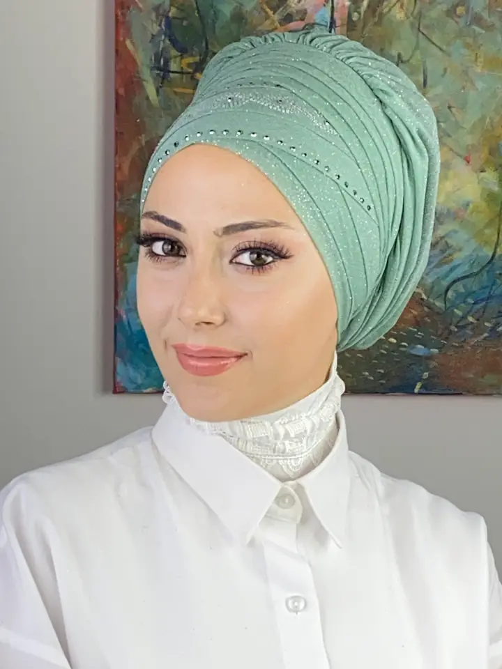 Hayalinizdeki şıklığı yakalamak için Kuşgözü Model Gümüş Taşlı ve Konik Ortası Siyah Taşlı Simli Şifon Bone Şal – Mint Yeşili‘ni hemen sipariş edin!