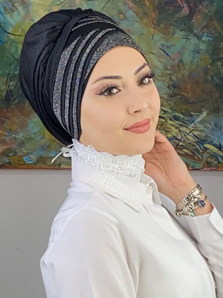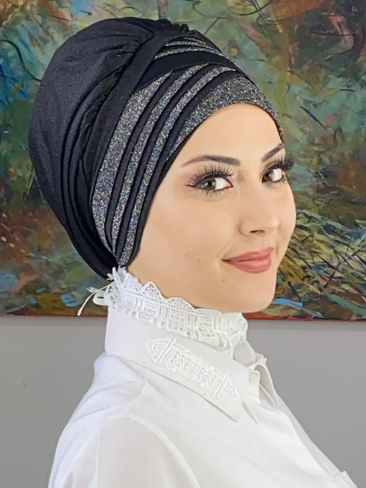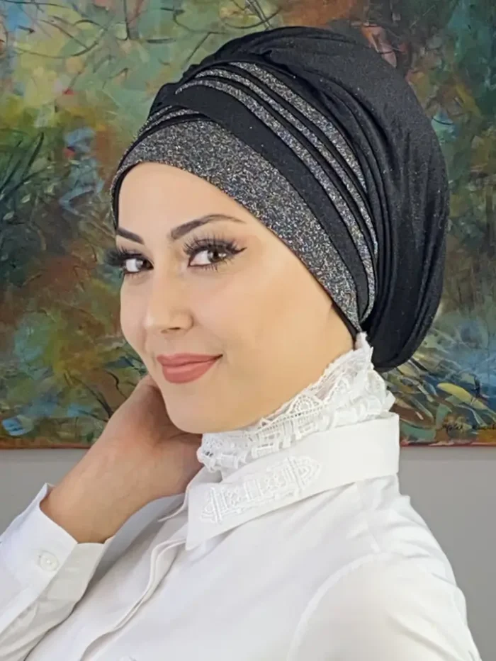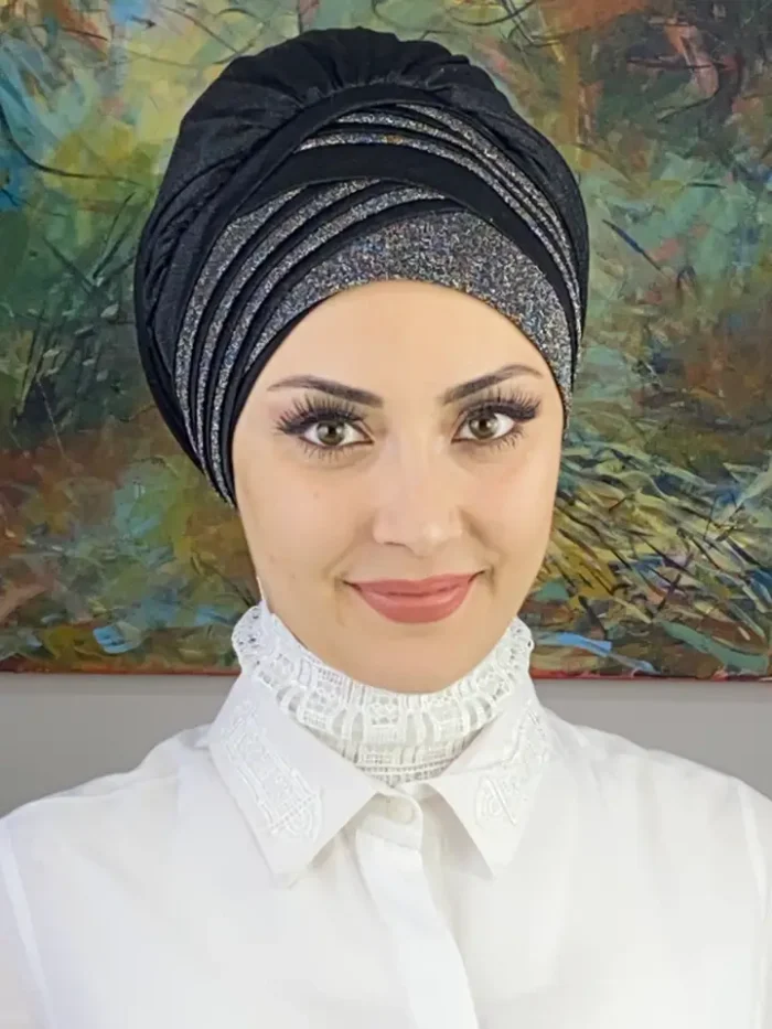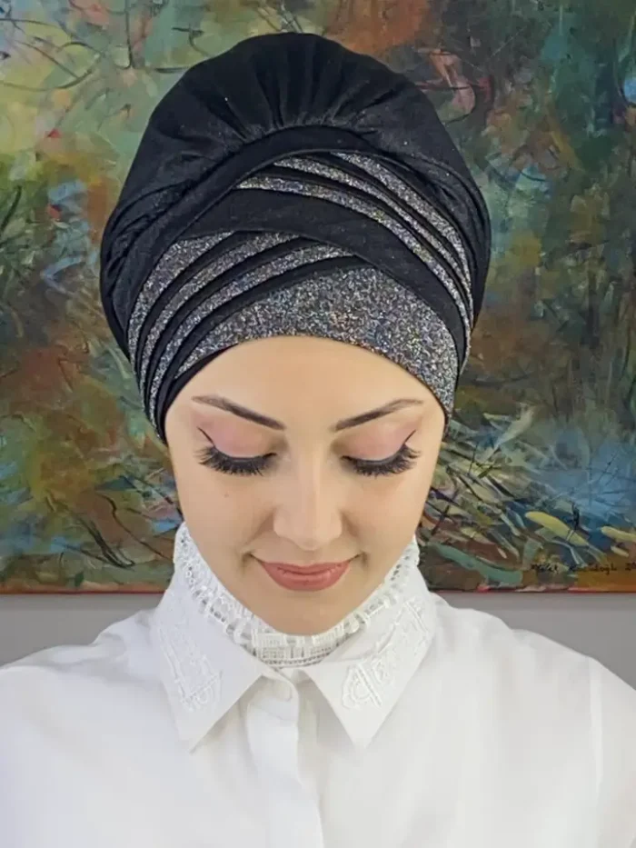 Siyah ve gri şıklığını yakalamak için Lüks Drapeli Abiye Bone Şal – Siyah – Gri’yi hemen sipariş edin!