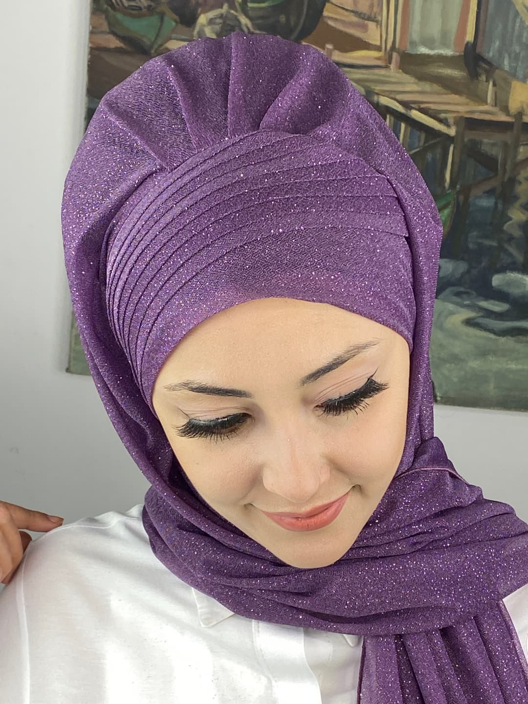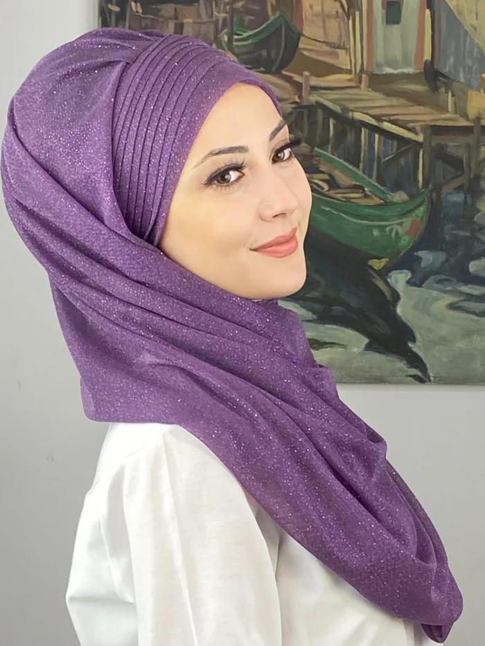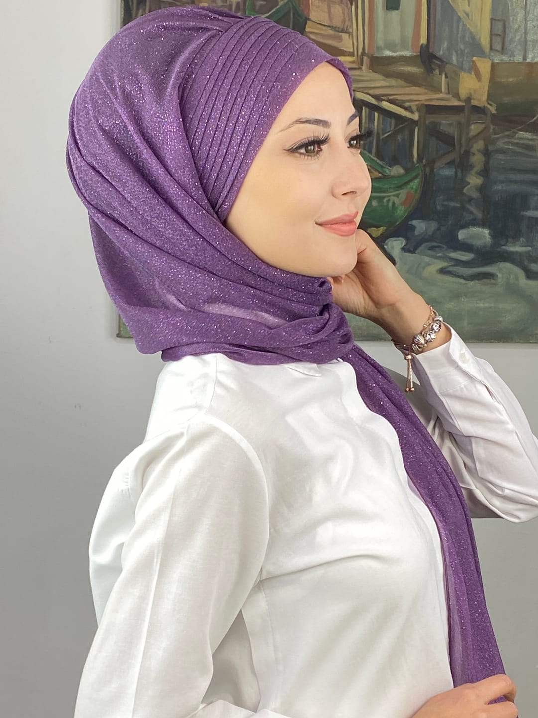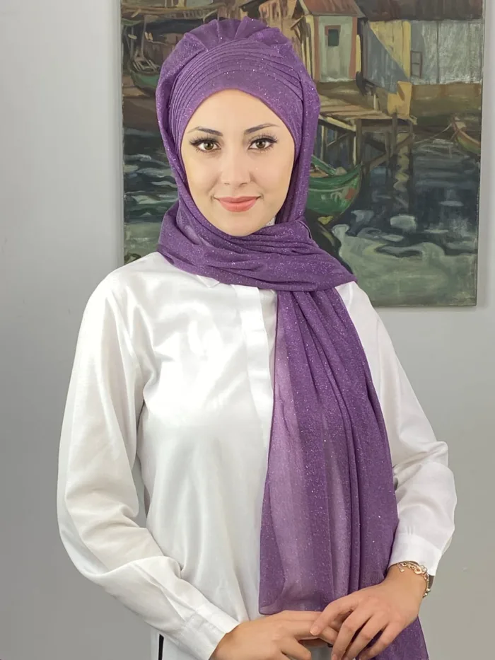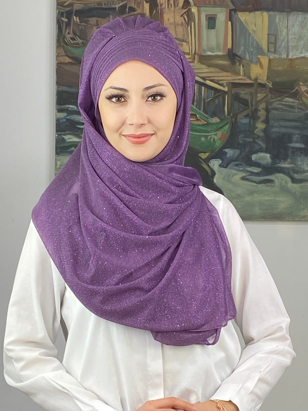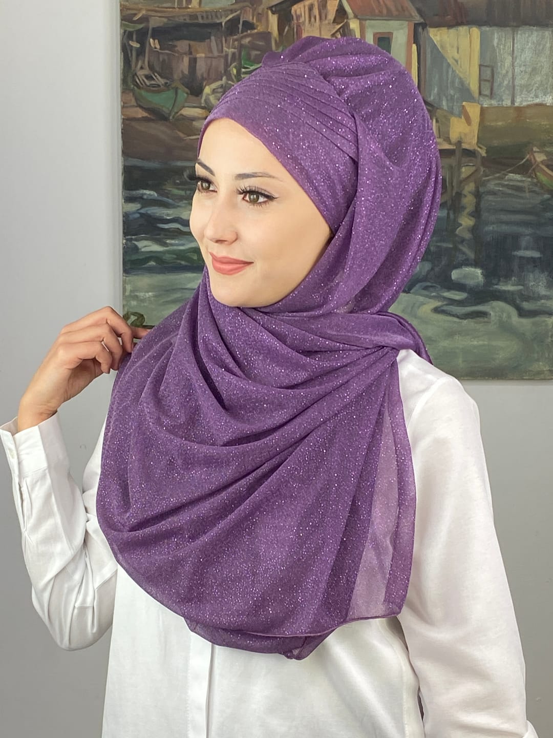 Saray Model Drapeli Simli Şifon Hazır Şal – Leylak, gardırobunuzda mutlaka bulunması gereken romantik ve zarif bir parçadır.