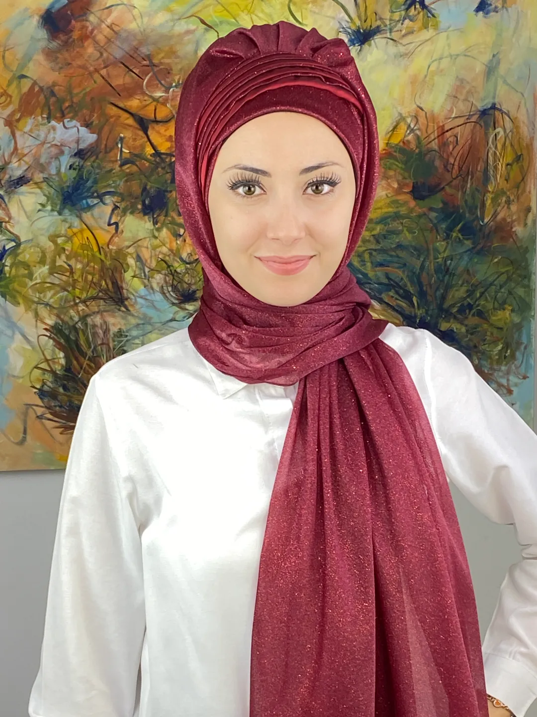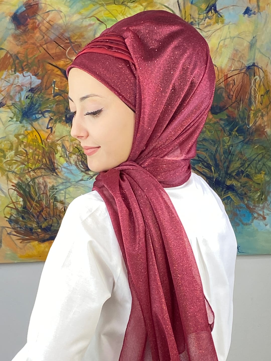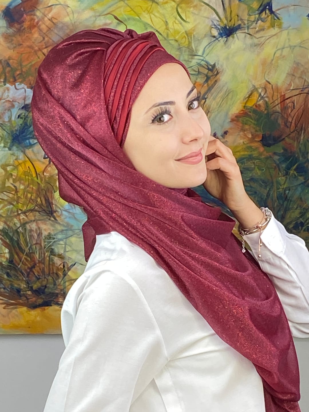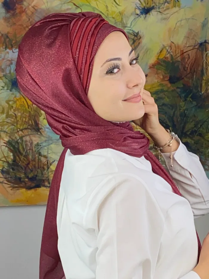 Derin ve sofistike bir ton olan bordo, özel gün şıklığının en güçlü yorumlarından biridir. Bu model; simli doku ve drape kesimi ile birleşerek kusursuz bir zarafet vadeder. Şık bir duruş isteyen kadınların favorisi olacak.