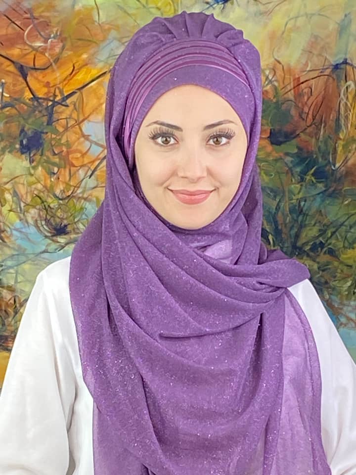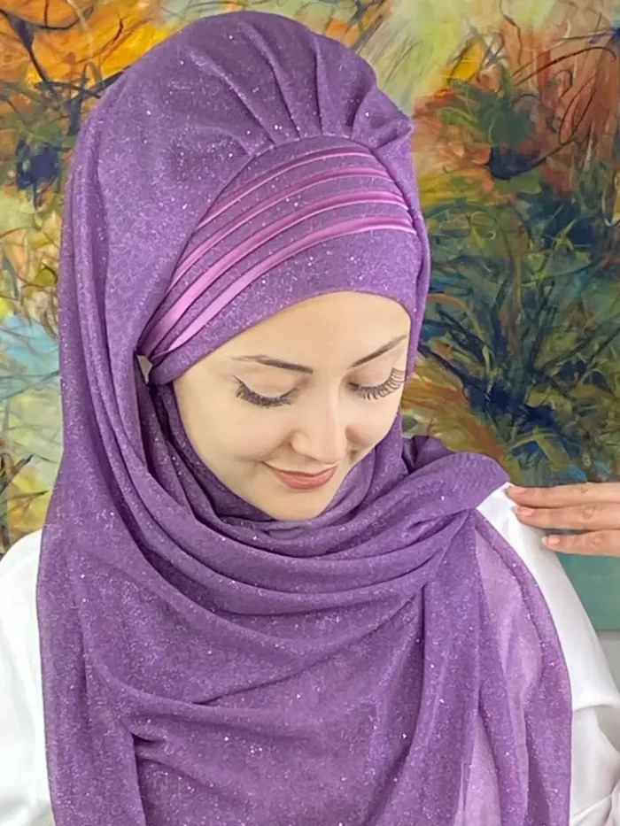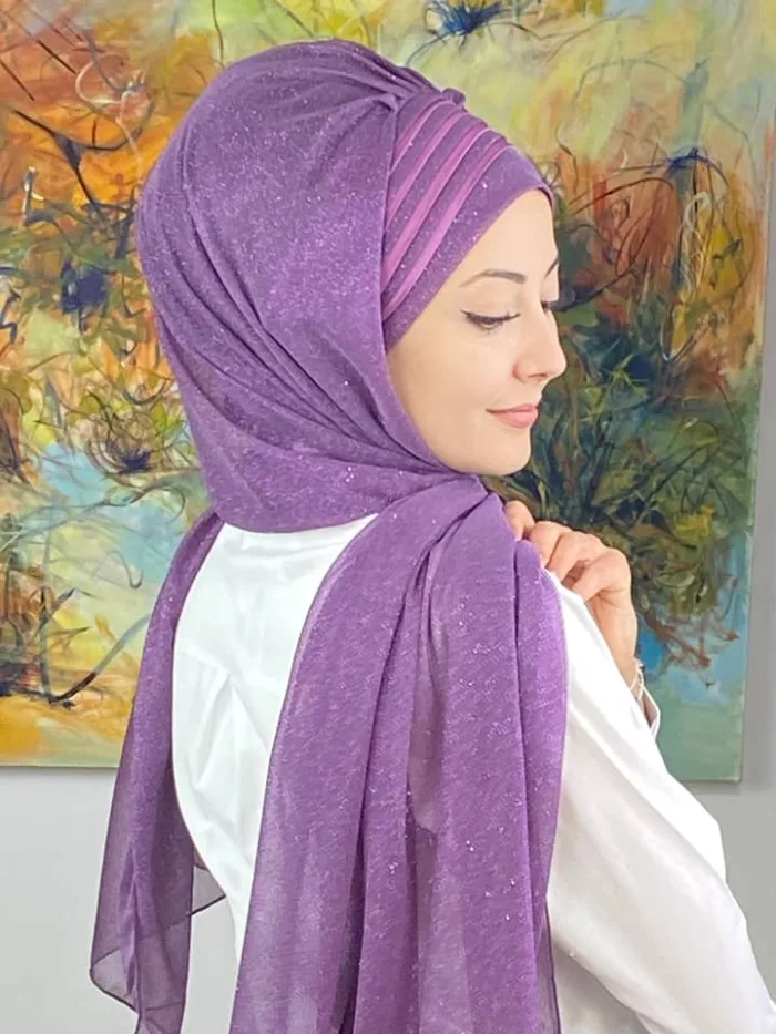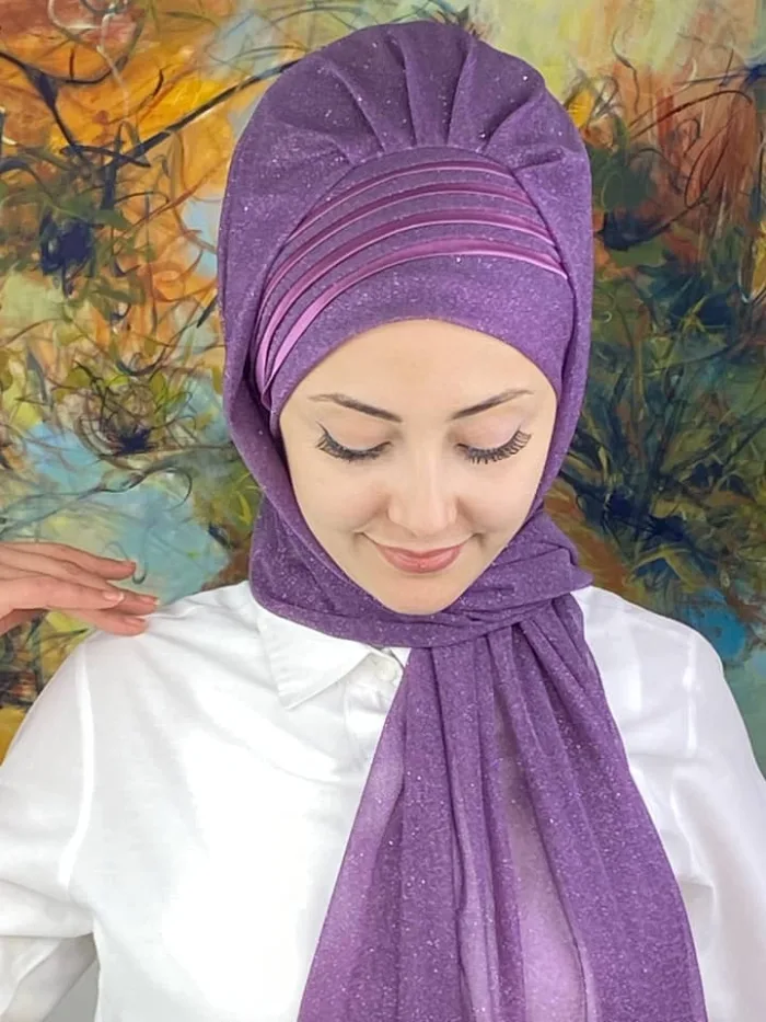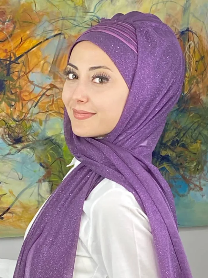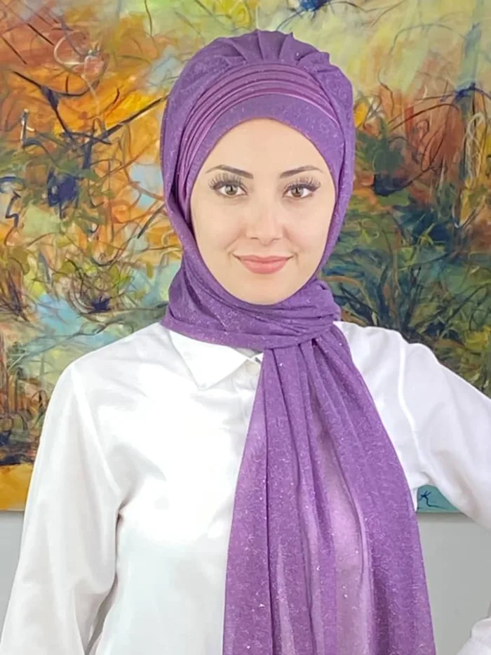 Leylak tonları, zarif ve sakin bir şıklığı simli detaylarla canlandırır. Drape form, yüz hatlarını çok daha estetik gösterir.