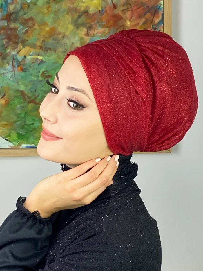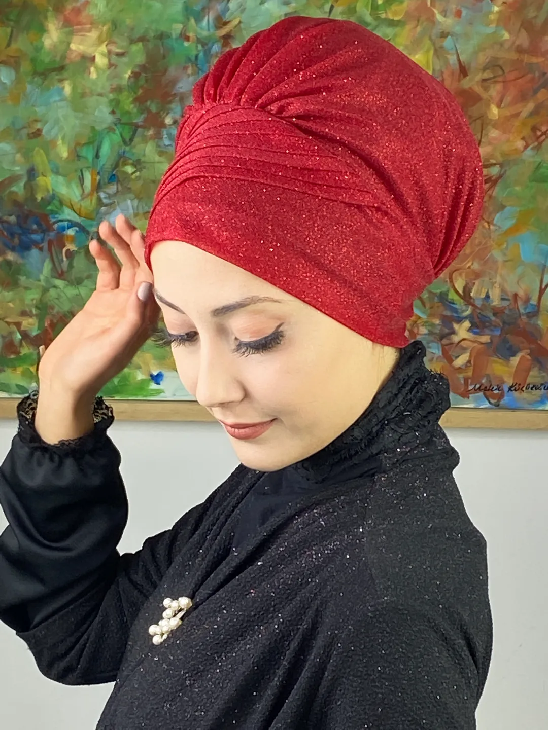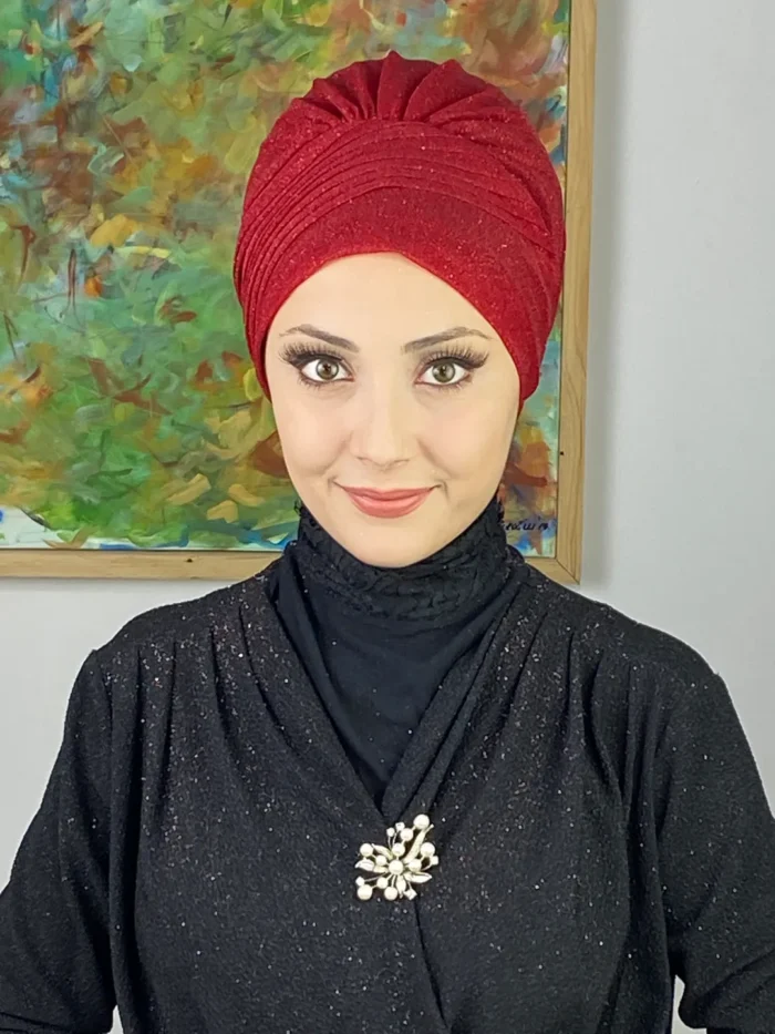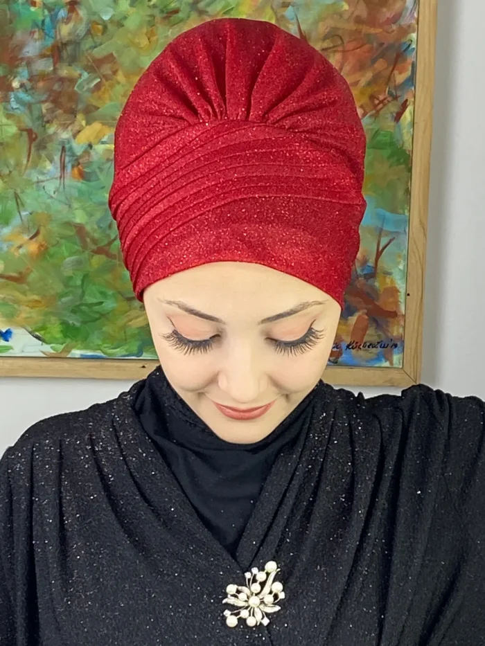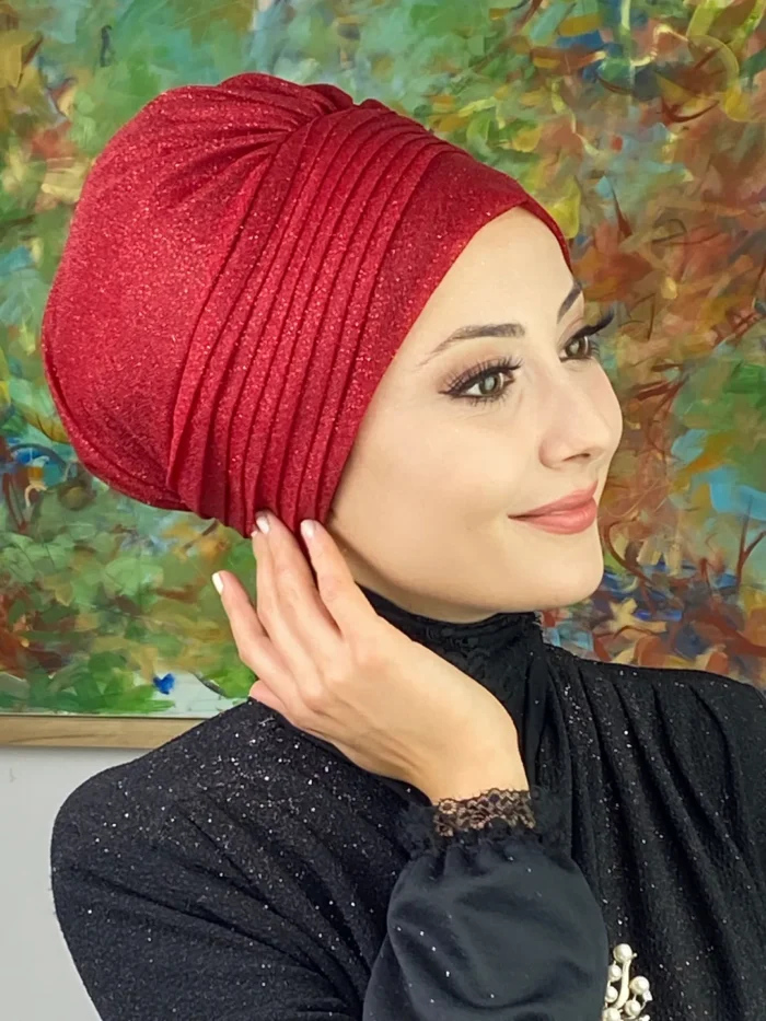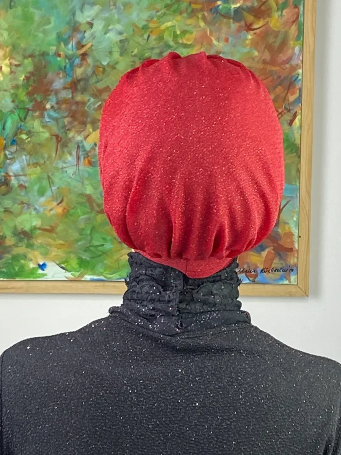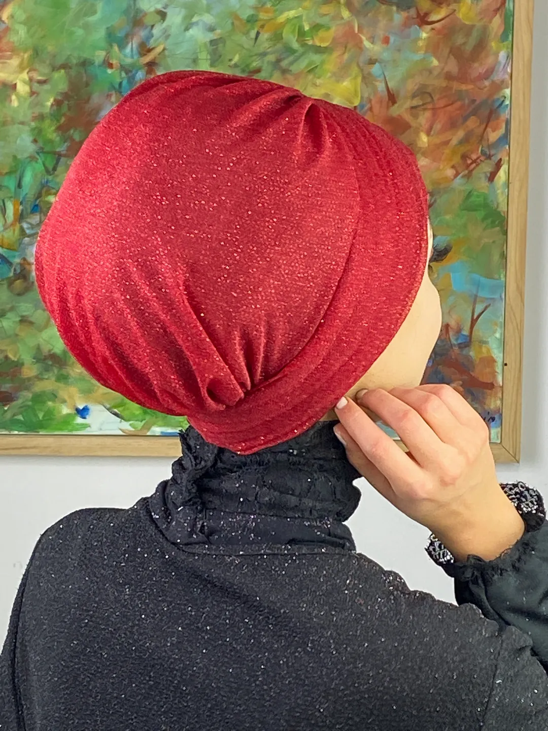 Göz alıcı kırmızı tonu ile dikkat çeken yan drapeli bone, zarafeti cesur bir tarzla buluşturuyor.