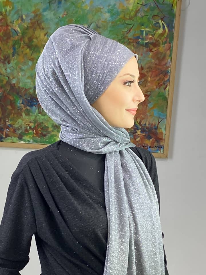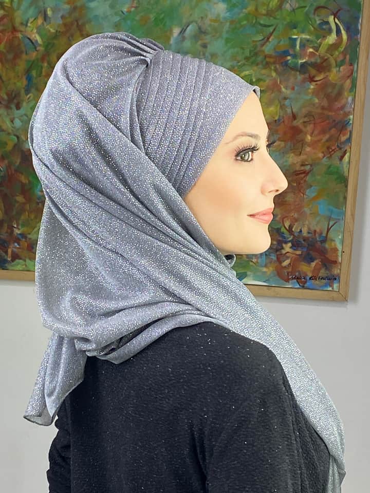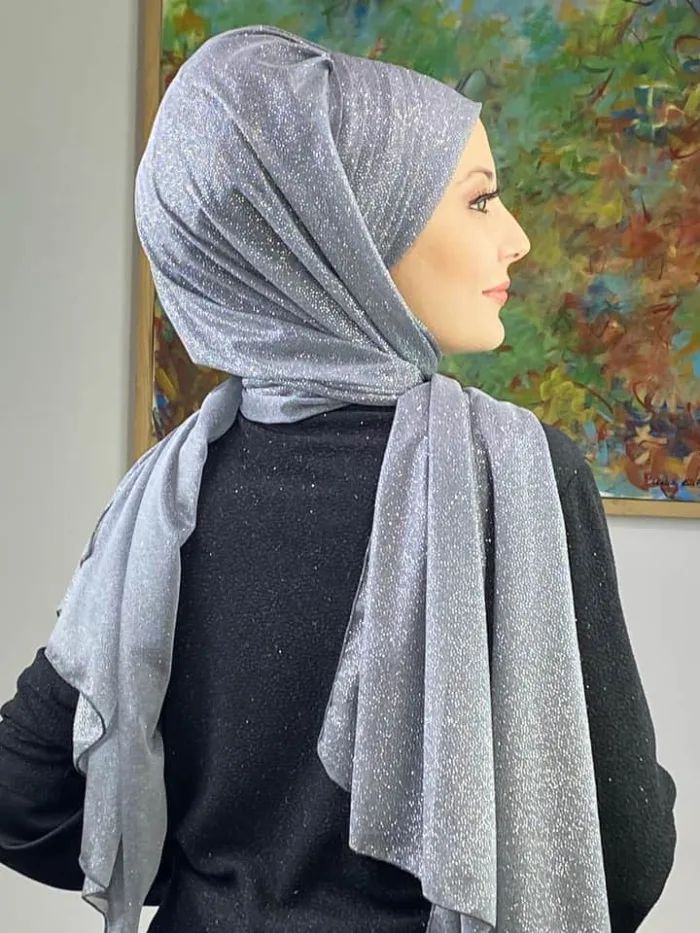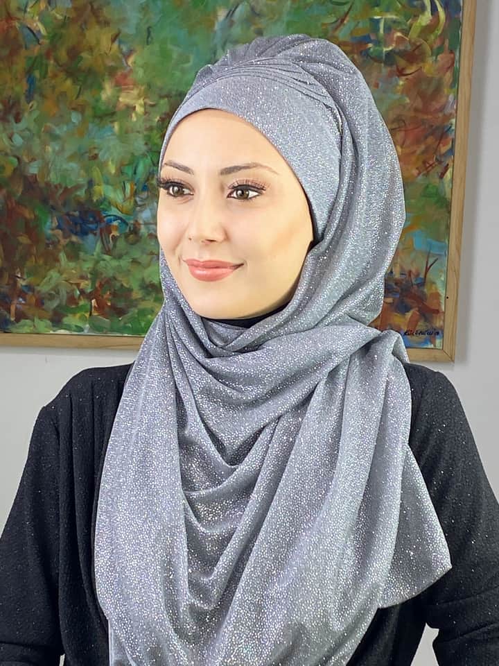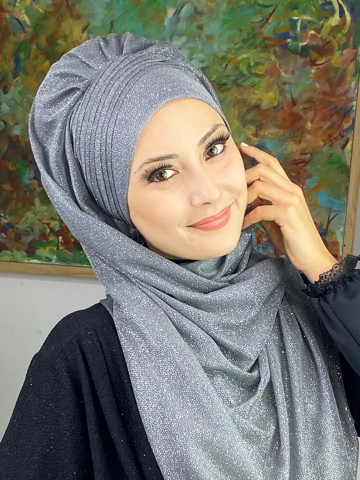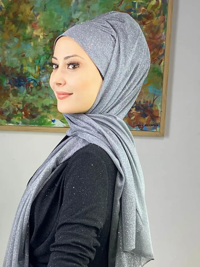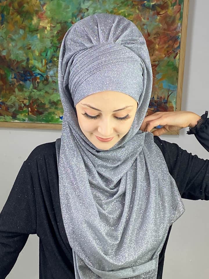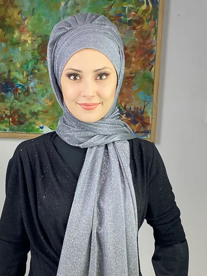 Saray Model Simli Yan Drapeli Şal – Gri, klasik güzelliği çağdaş detaylarla yeniden yorumluyor. Gri tonunun asil ve nötr duruşu, simli kumaşın büyüleyici ışıltısıyla birleşerek göz kamaştırıcı bir denge oluşturur. Bu model; hem gündüz ofis şıklığında hem de akşam davetlerinde tarzınızı tamamlayacak kusursuz bir parçadır.
