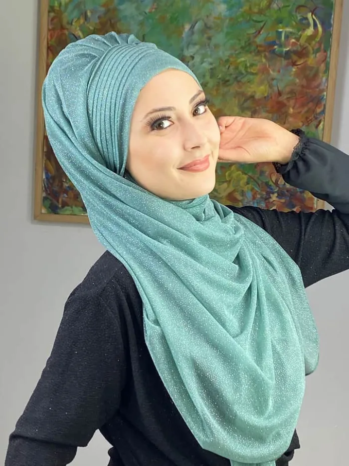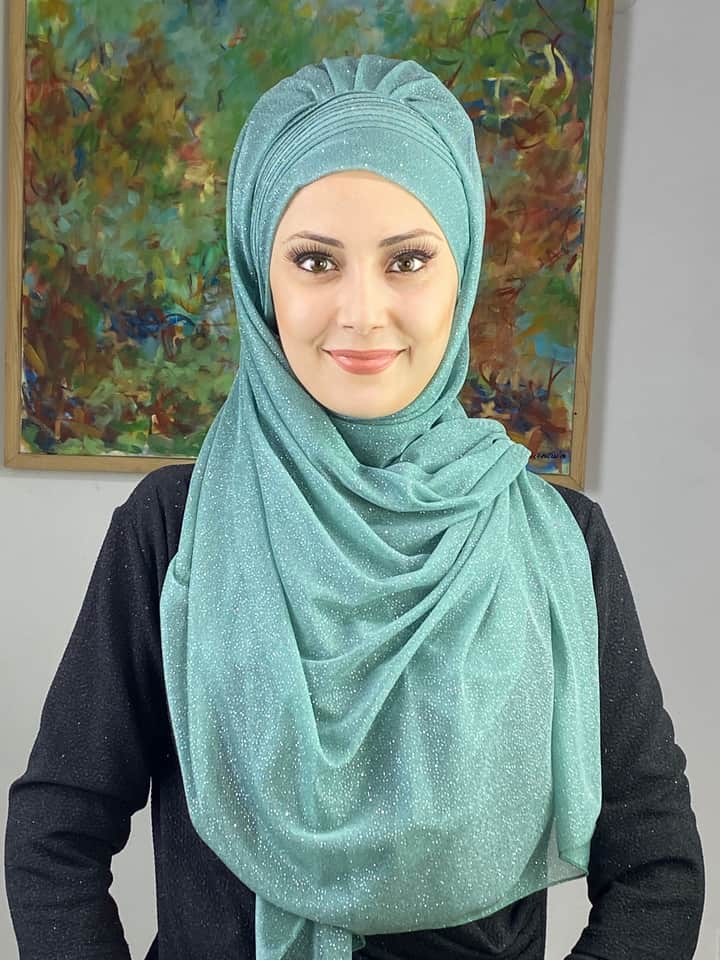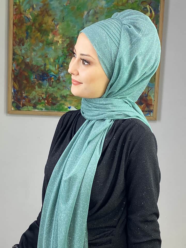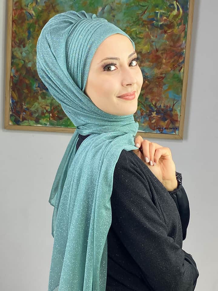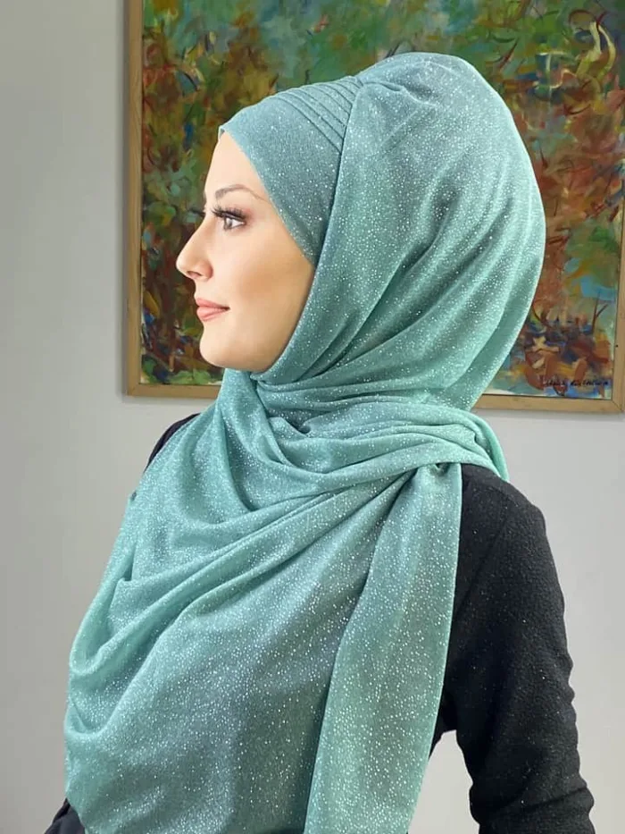 Saray Model Simli Yan Drapeli Şal – Su Yeşili, yumuşak ve zarif tonuyla her mevsime uygun, modern ve güçlü bir tarz sunar. Pastel tonlu bir simli şal arayanlar için benzersiz bir seçenektir. Sim detayları, hem gündüz hem de gece kullanımına uyum sağlayacak şekilde hazırlanmıştır.