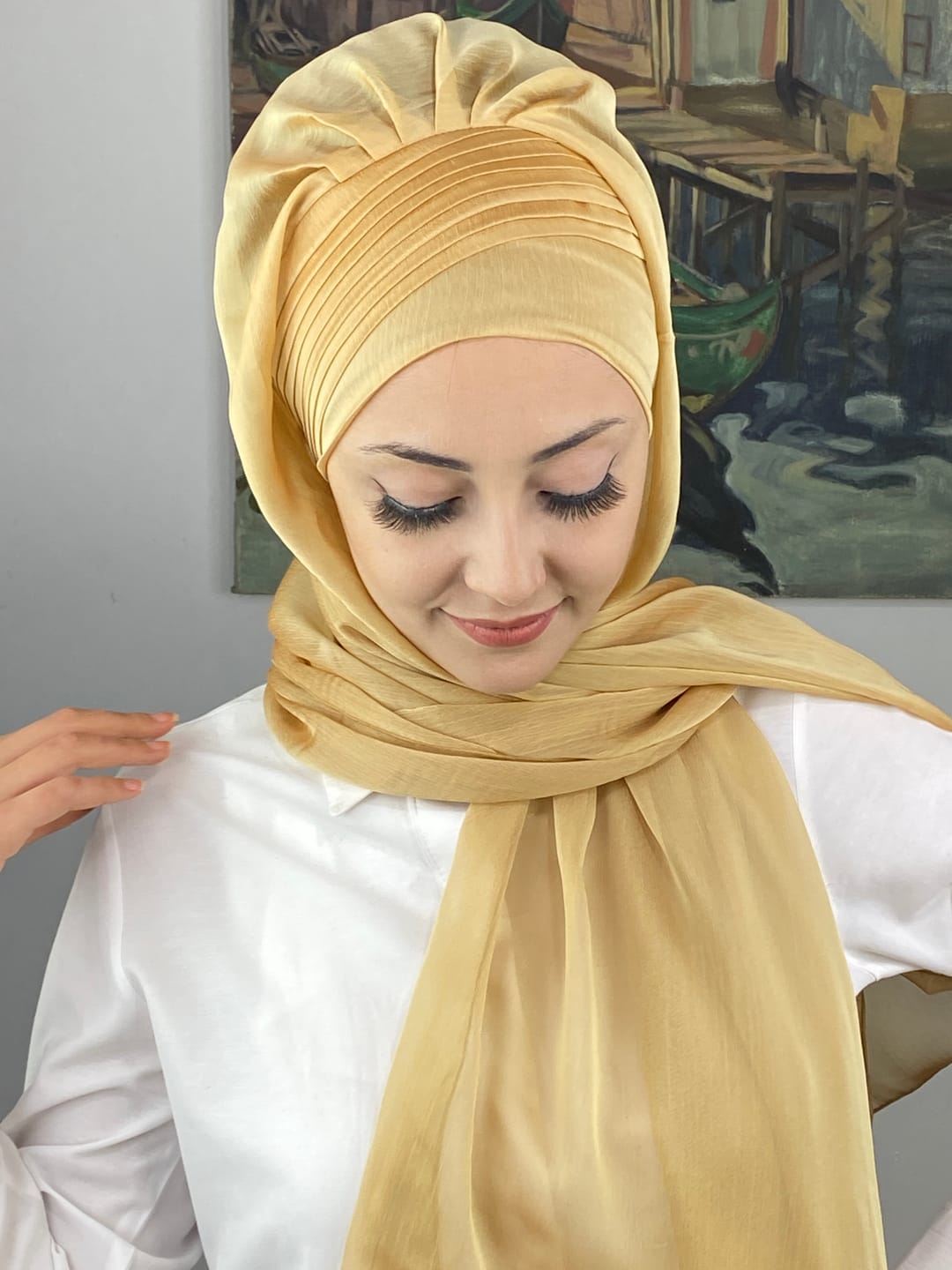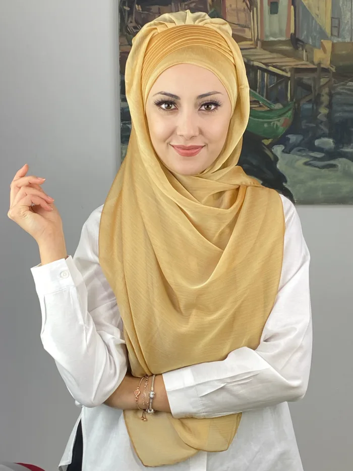 Saray Model Yan Drapeli Fransız Şifon Hazır Şal – Altın, gardırobunuzda mutlaka bulunması gereken lüks ve zarif bir parçadır.