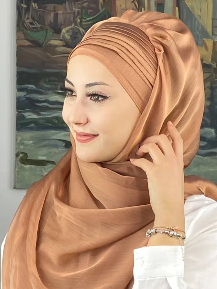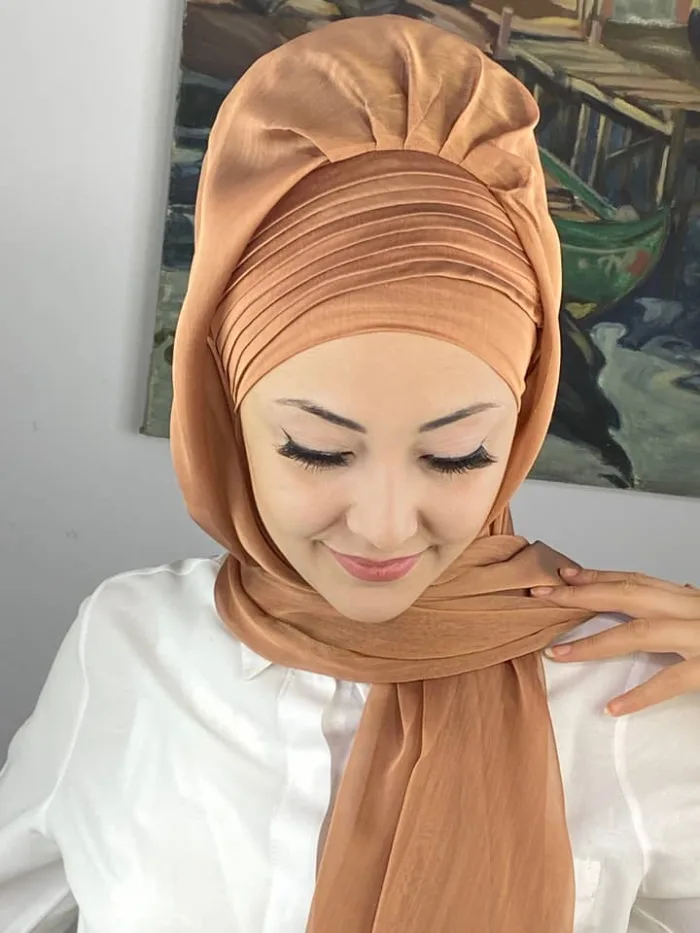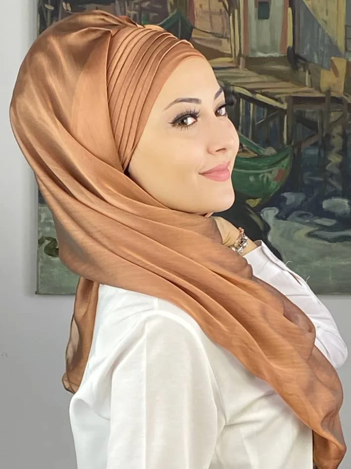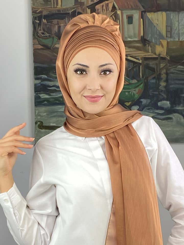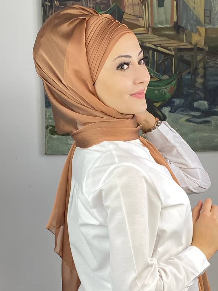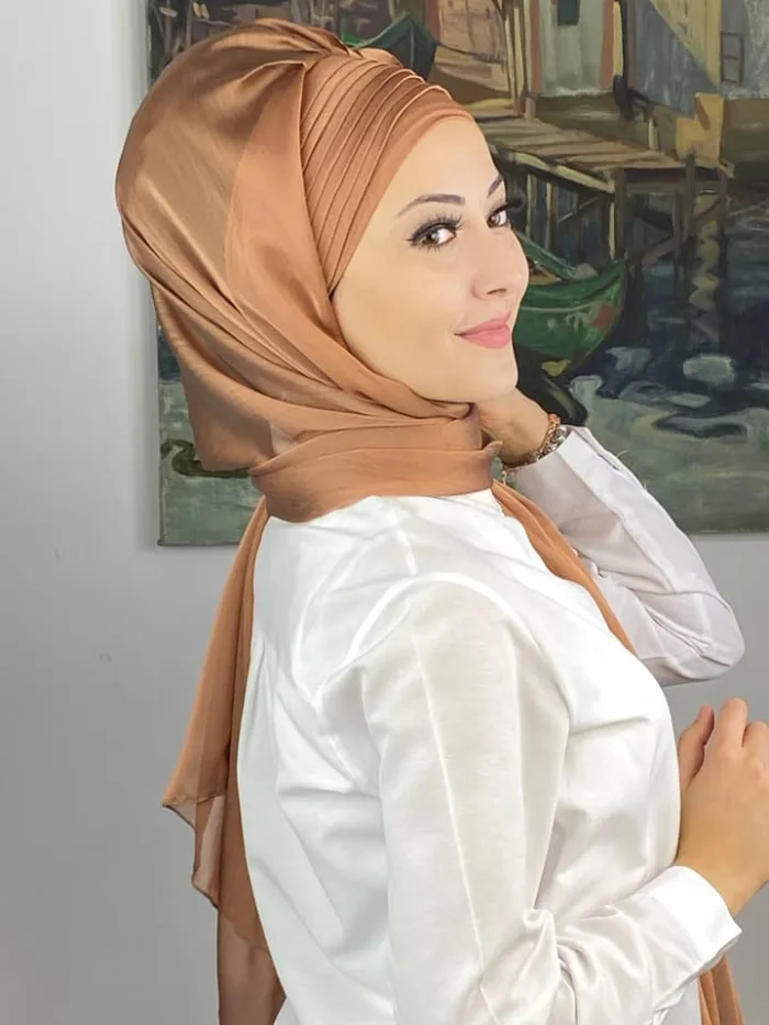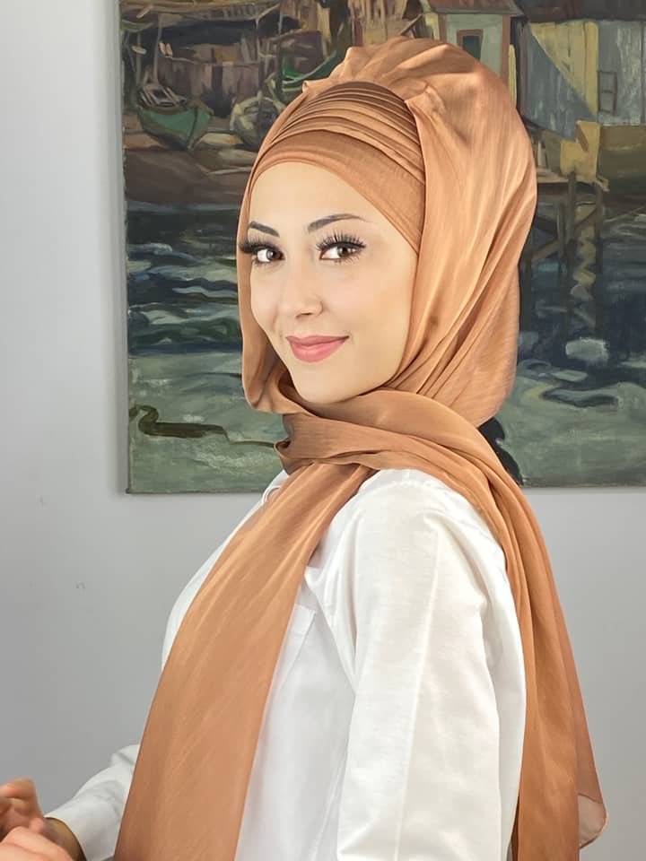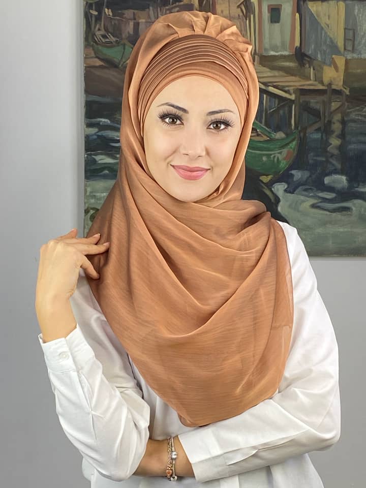 Saray Model Yan Drapeli Fransız Şifon Hazır Şal – Açık Bakır, gardırobunuzda mutlaka bulunması gereken modern ve zarif bir parçadır.