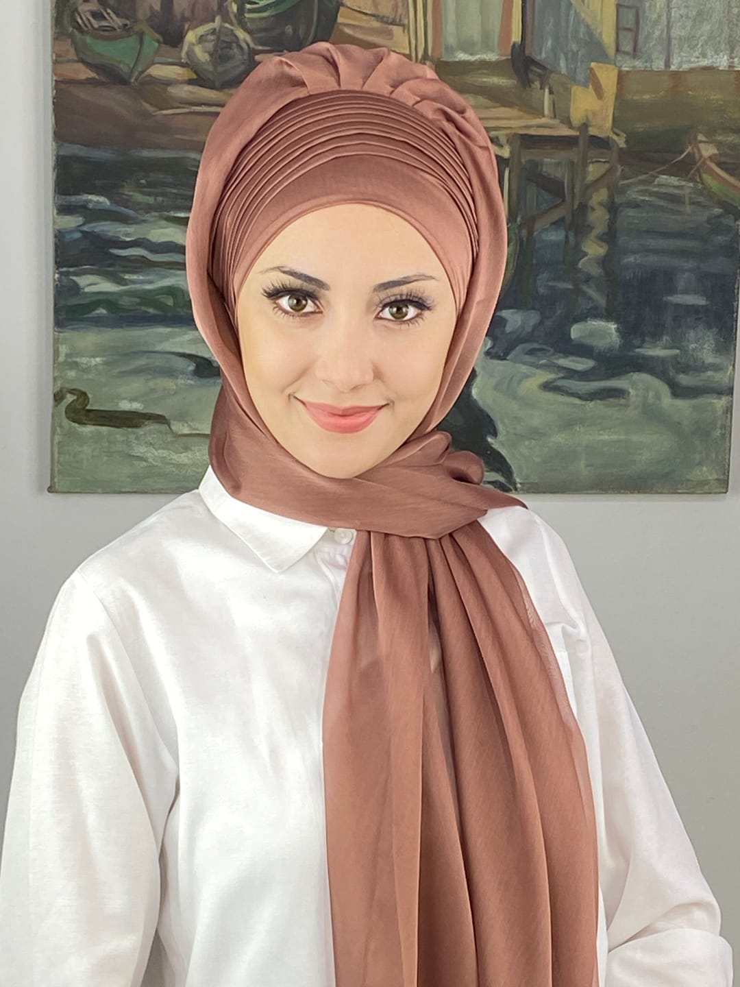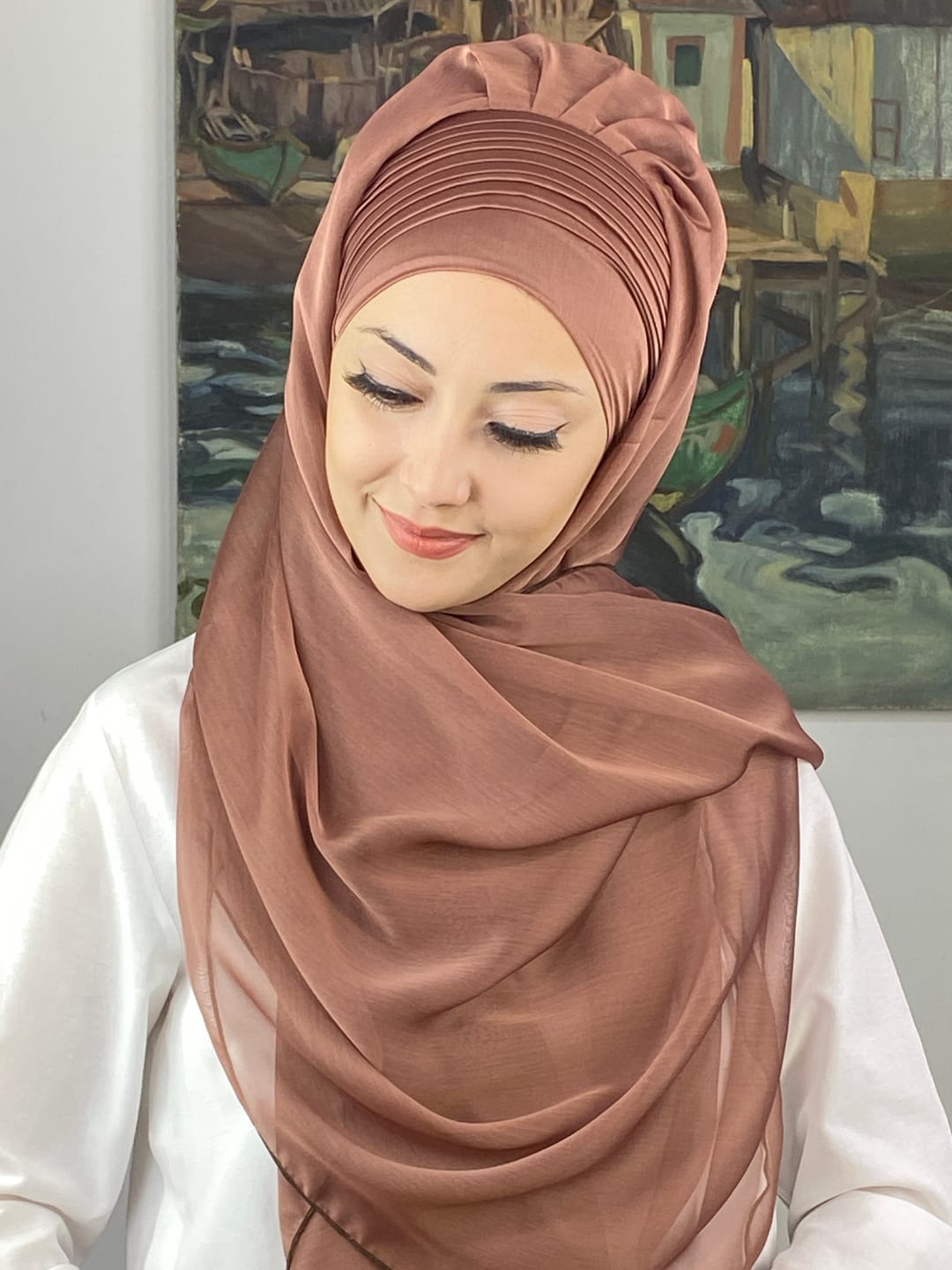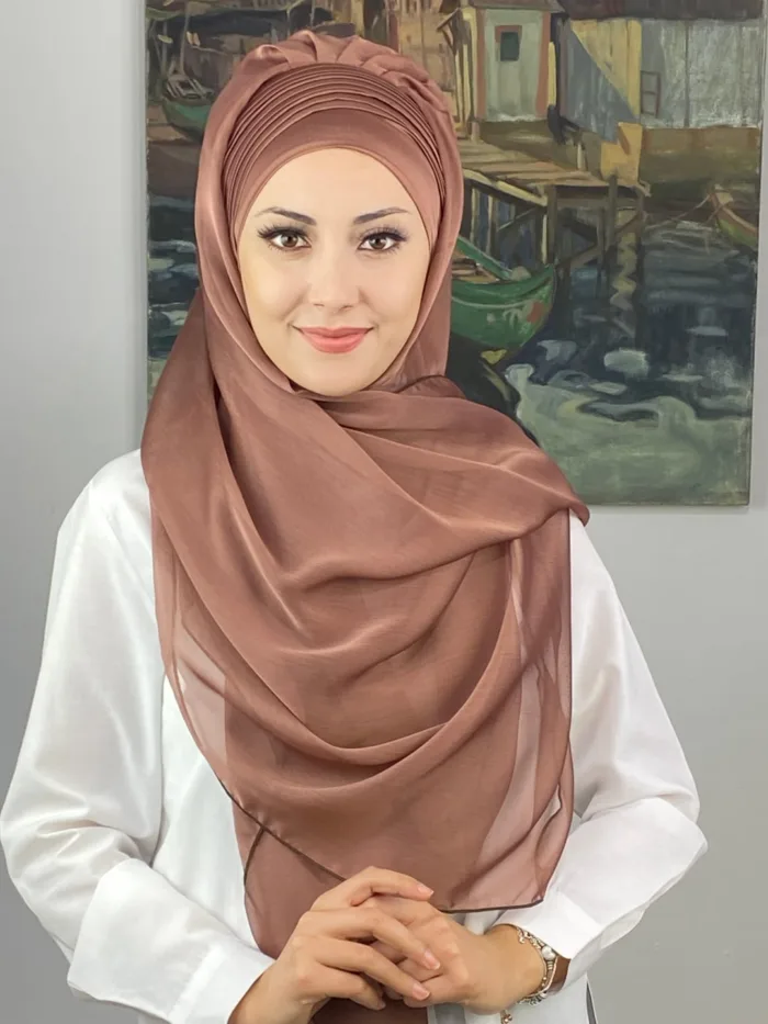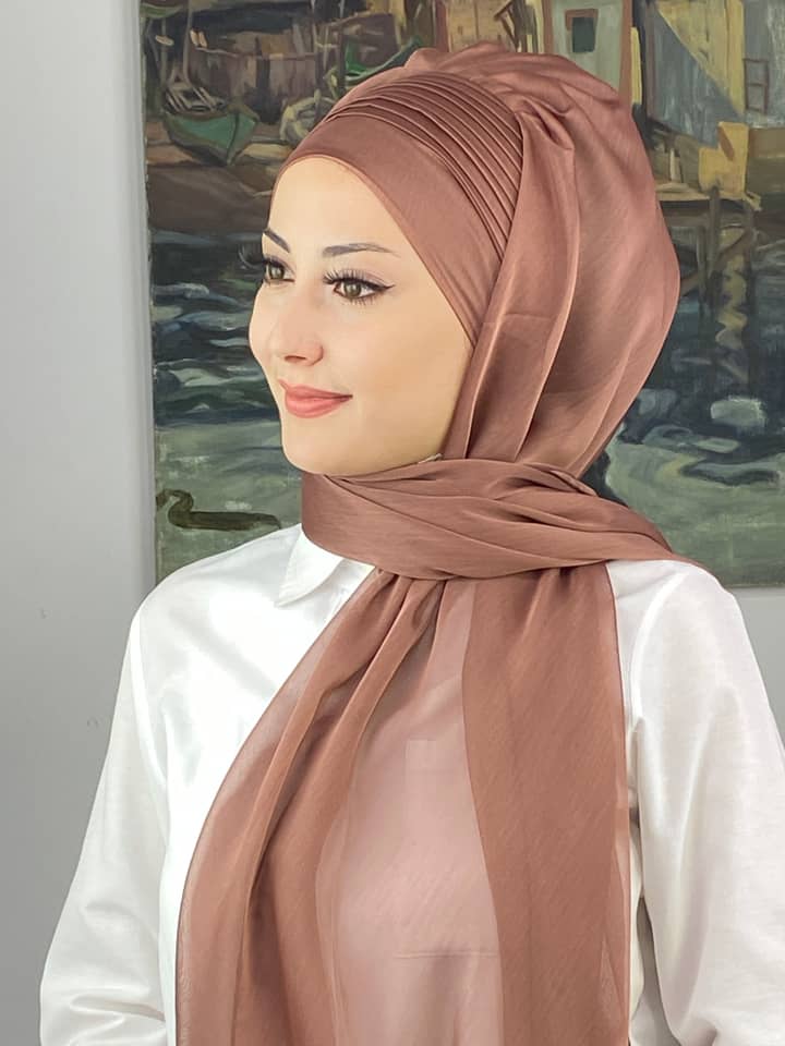 Saray Model Yan Drapeli Fransız Şifon Hazır Şal – Sütlü Kahve, gardırobunuzda mutlaka bulunması gereken zarif ve sofistike bir parçadır.