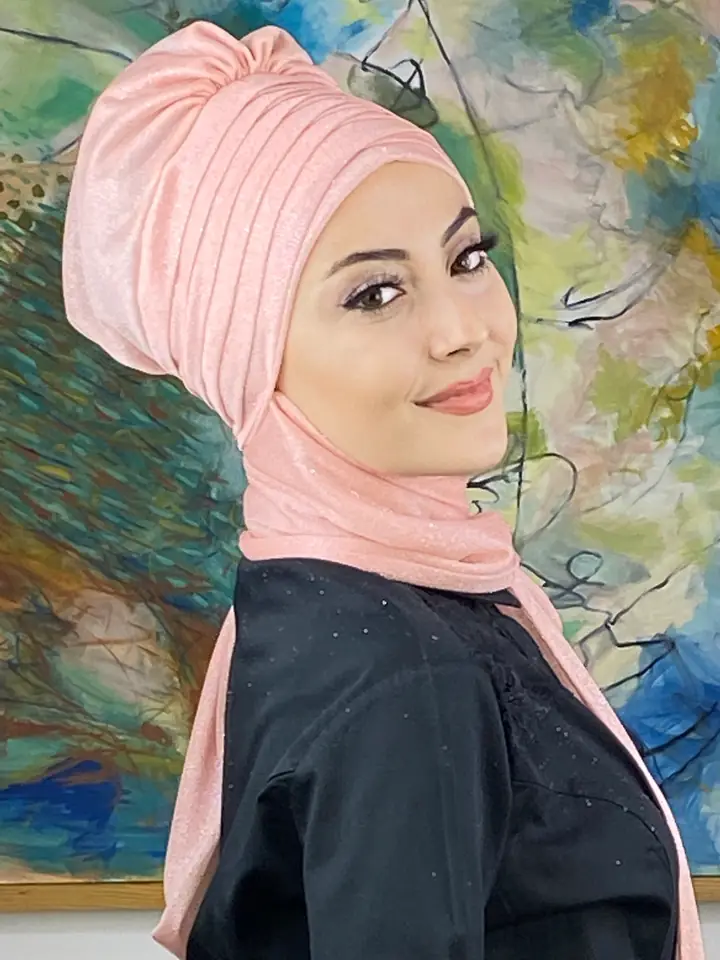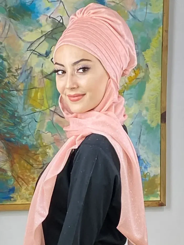 Açık somon şıklığını yakalamak için Simli Atkılı Bone Şal – Açık Somon’u hemen sipariş edin!