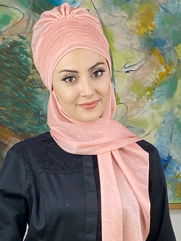 • Zarif Tasarım: Atkılı tasarım ve simli kumaş, şalınıza şıklık ve zarafet katarken, açık somon rengi ile canlı bir görünüm oluşturur.
