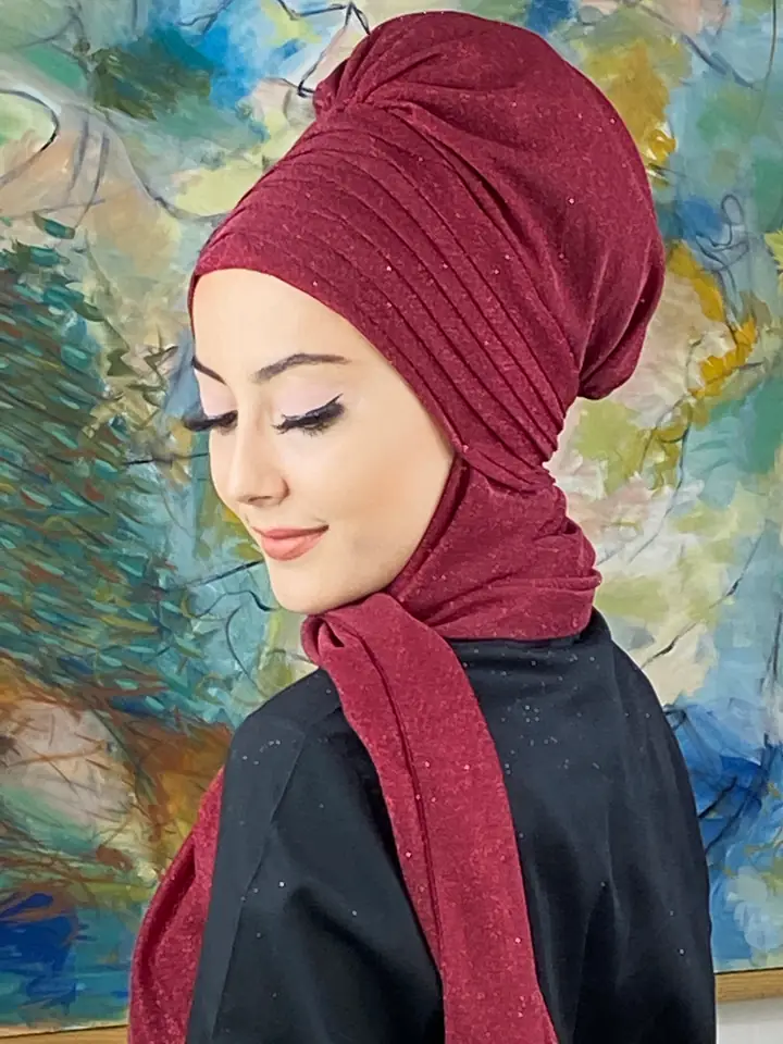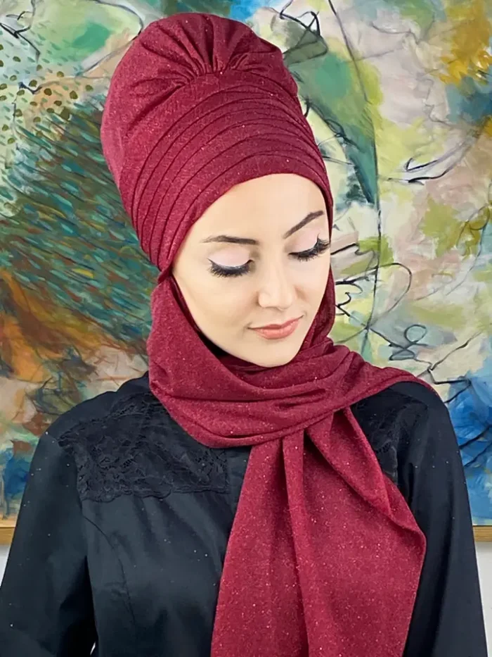 Şıklığınızı tamamlamak için Simli Atkılı Bone Şal – Bordo’yu hemen sipariş edin!