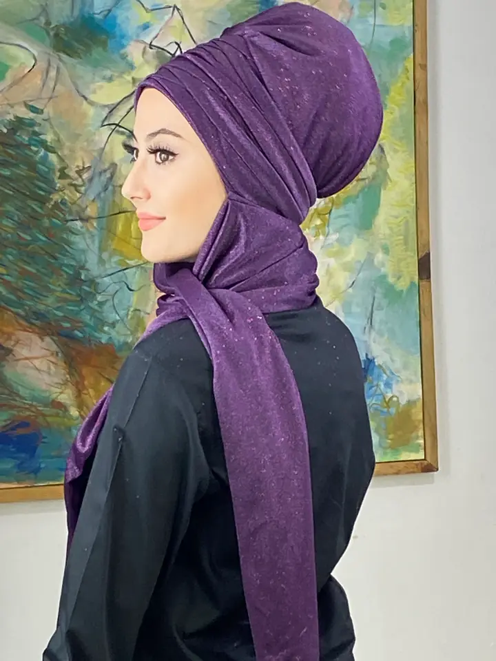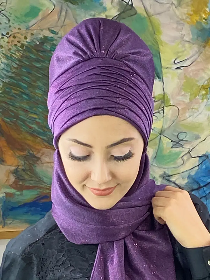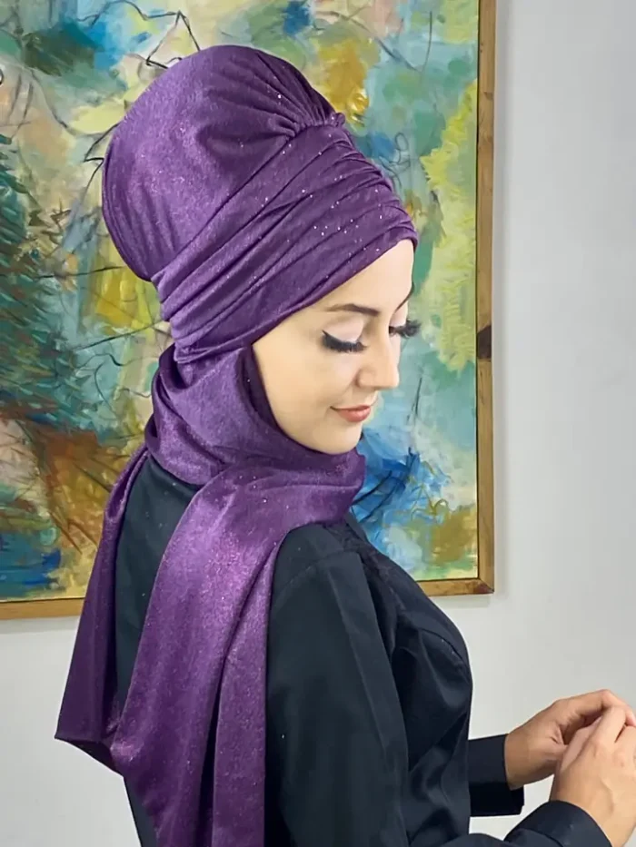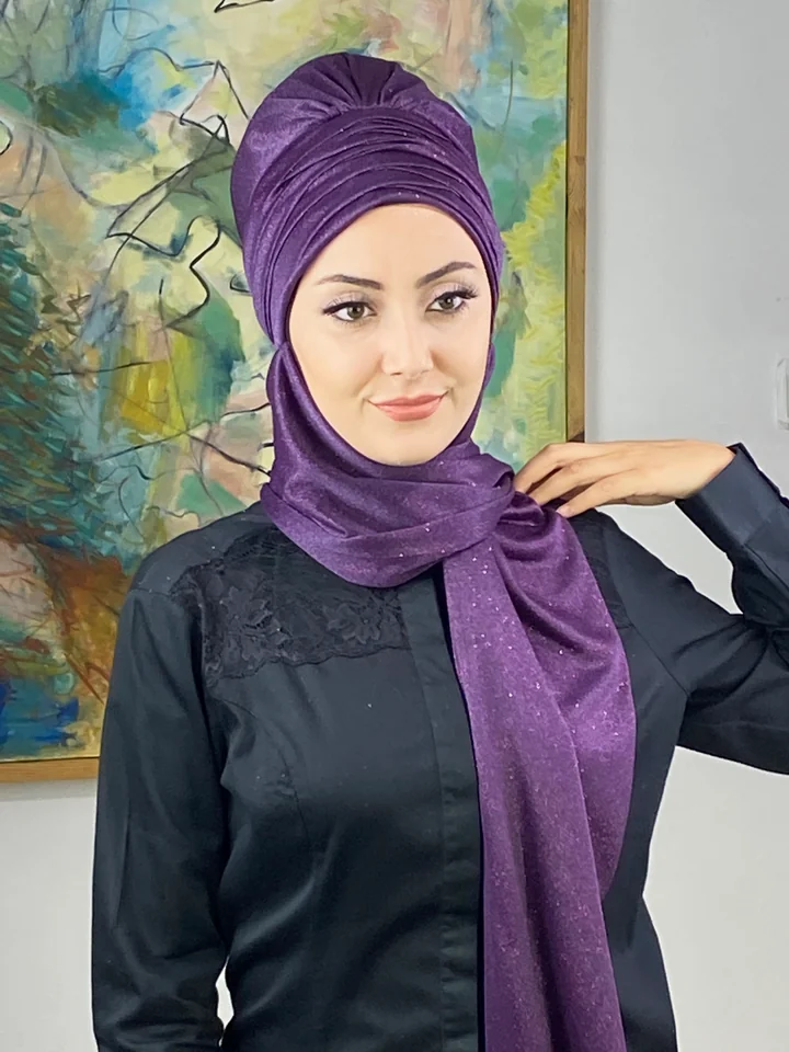 Mor şıklığını yakalamak için Simli Atkılı Bone Şal – Mor’yu hemen sipariş edin!