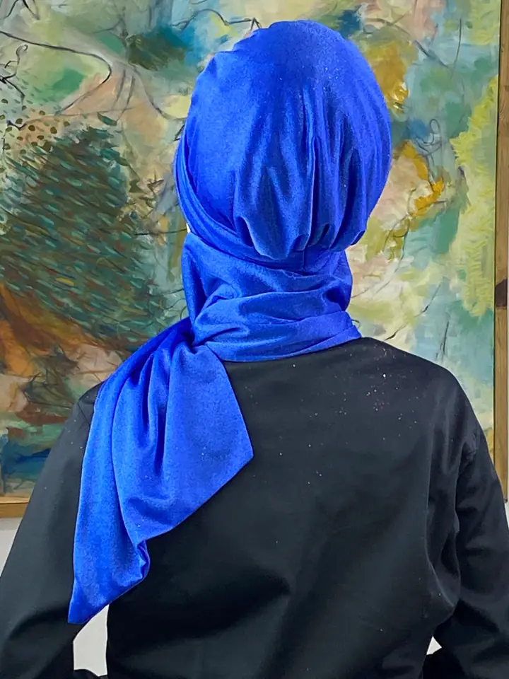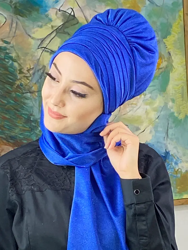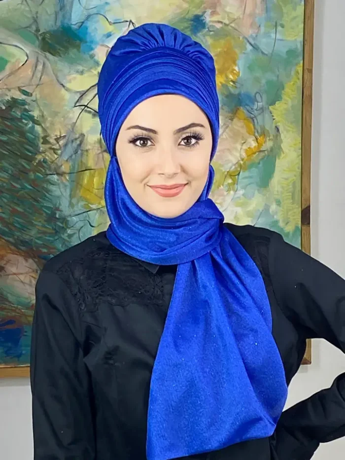 Etkileyici Tasarım: Atkılı tasarım ve simli kumaş, şalınıza şıklık ve zarafet katarken, saks mavisi ile göz alıcı bir görünüm oluşturur.