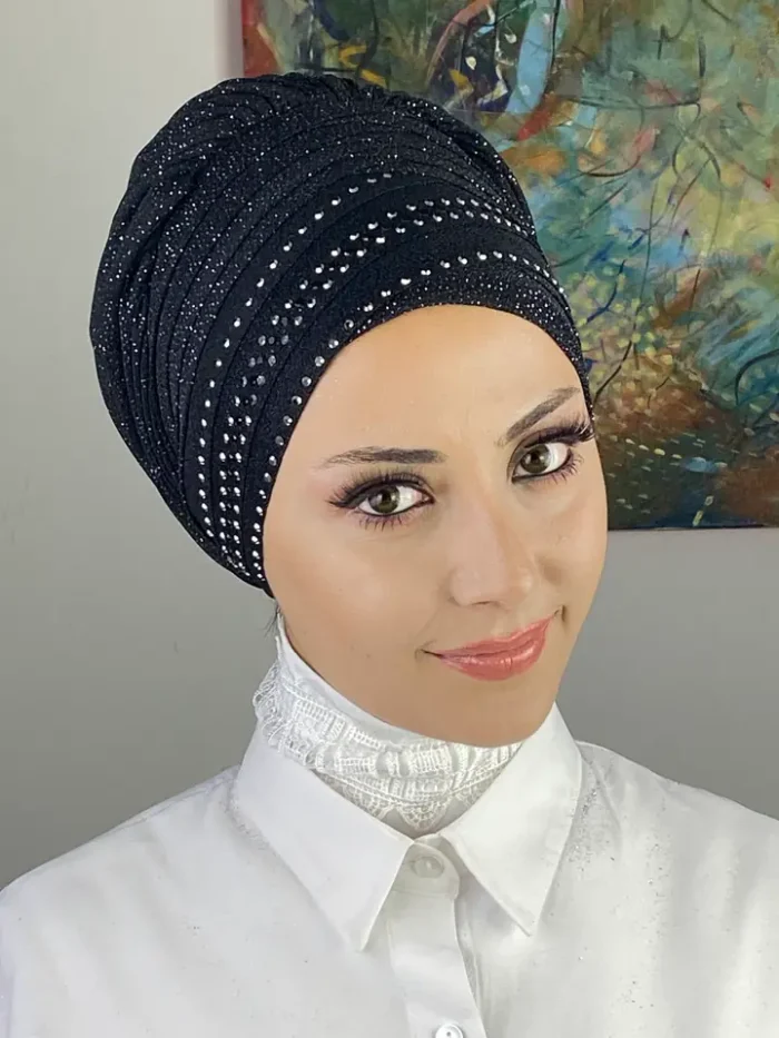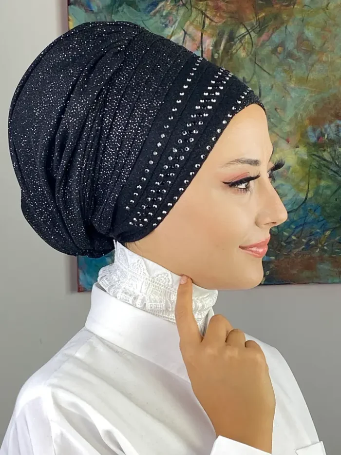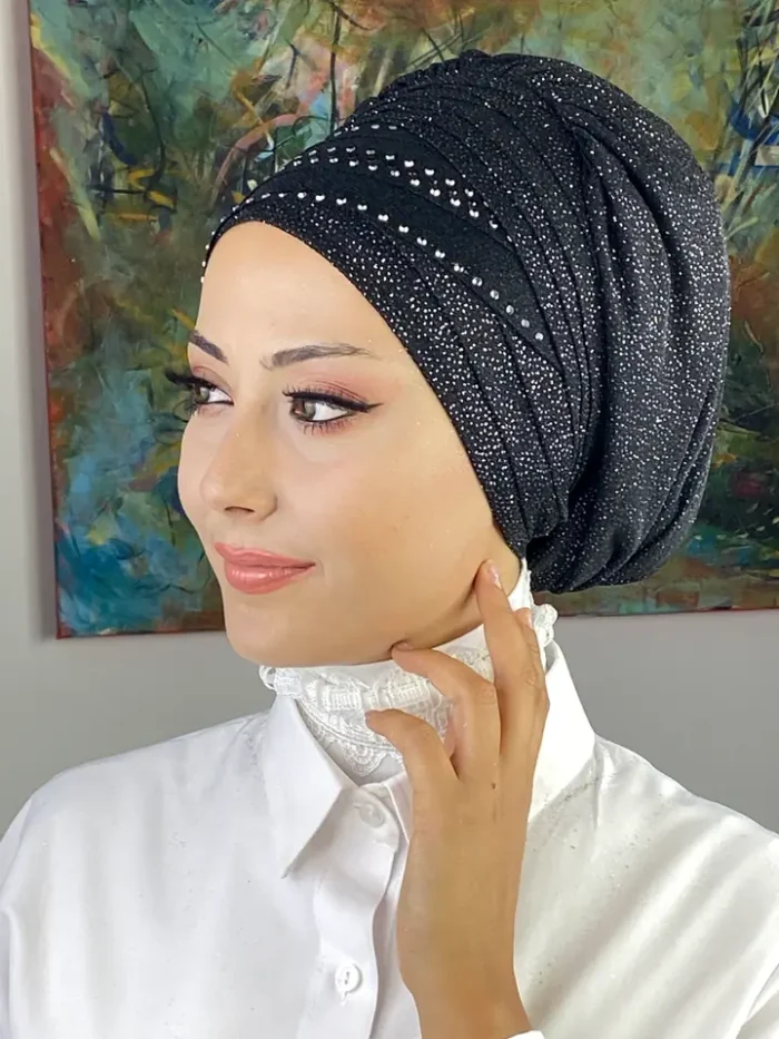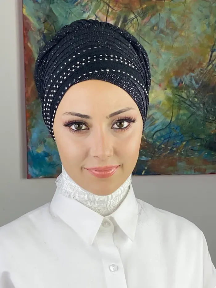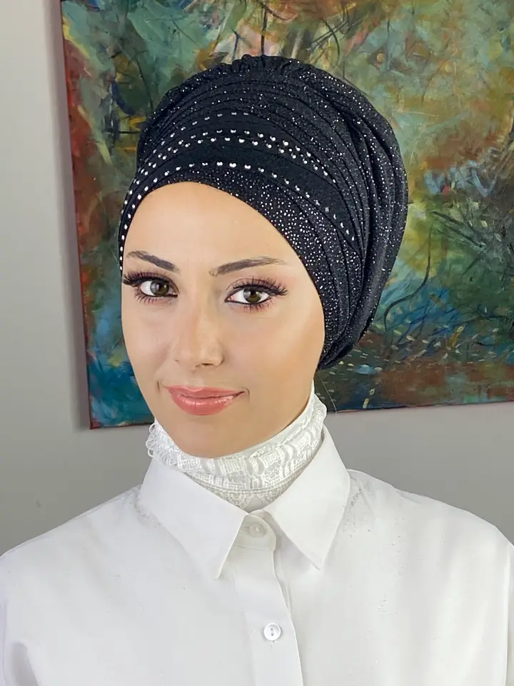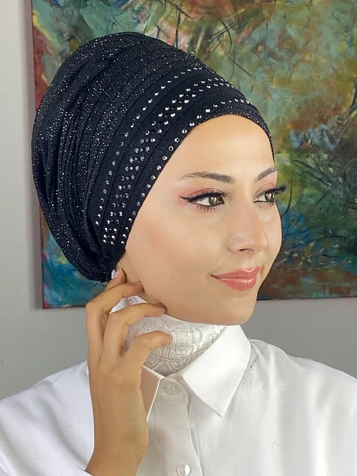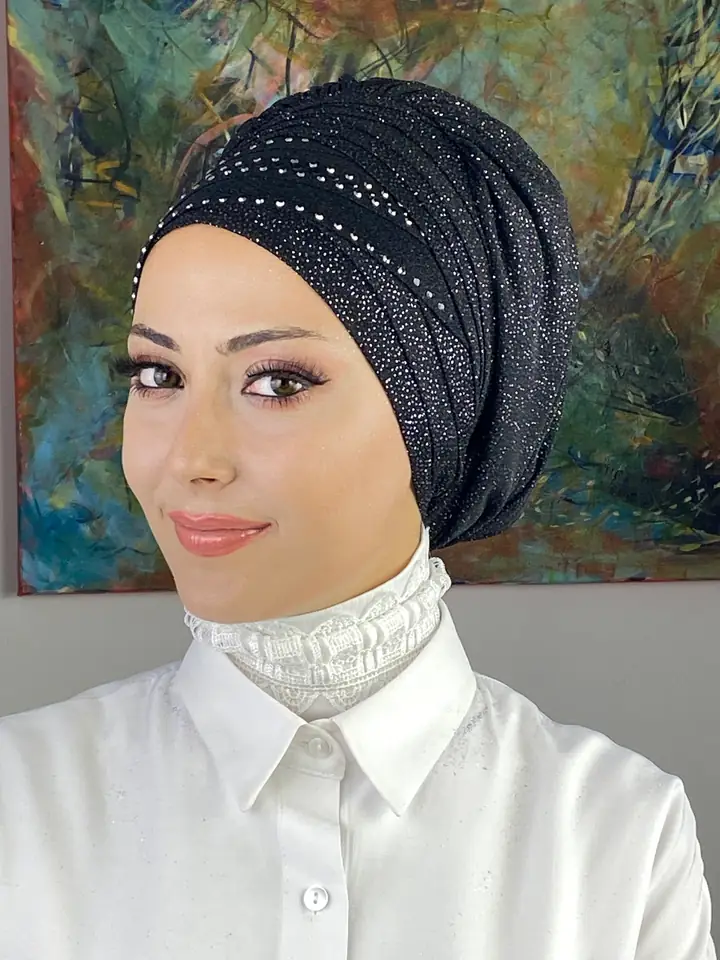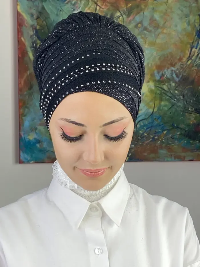 Konik Ortası Siyah Taş Detaylı Üç Şeritli Simli Şifon Bone Şal – Siyah 🖤