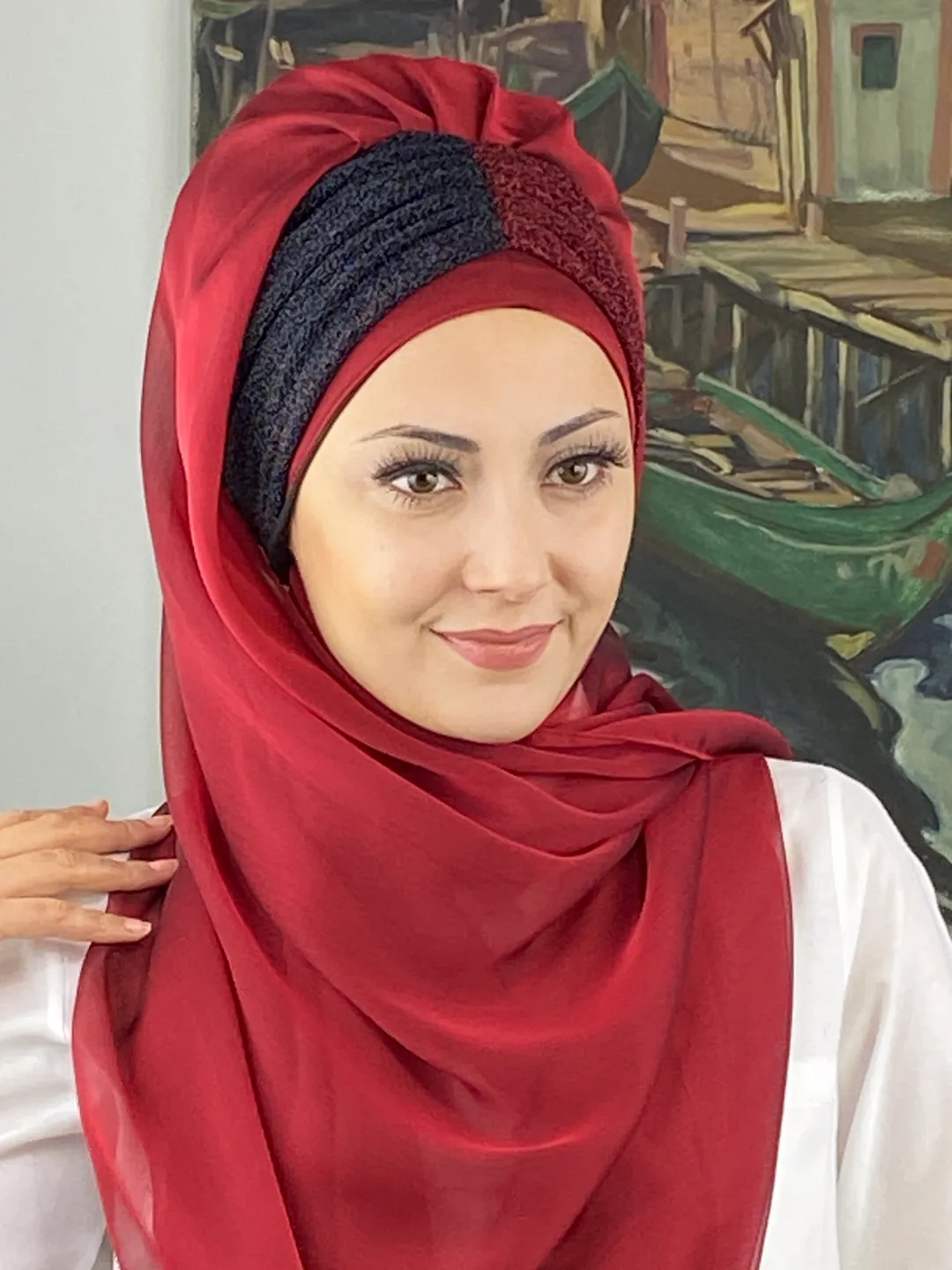 Sultan Büzgülü Oskar Fransız Şifon Hazır Şal – Bordo / Lacivert 🍷