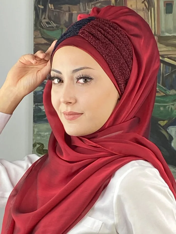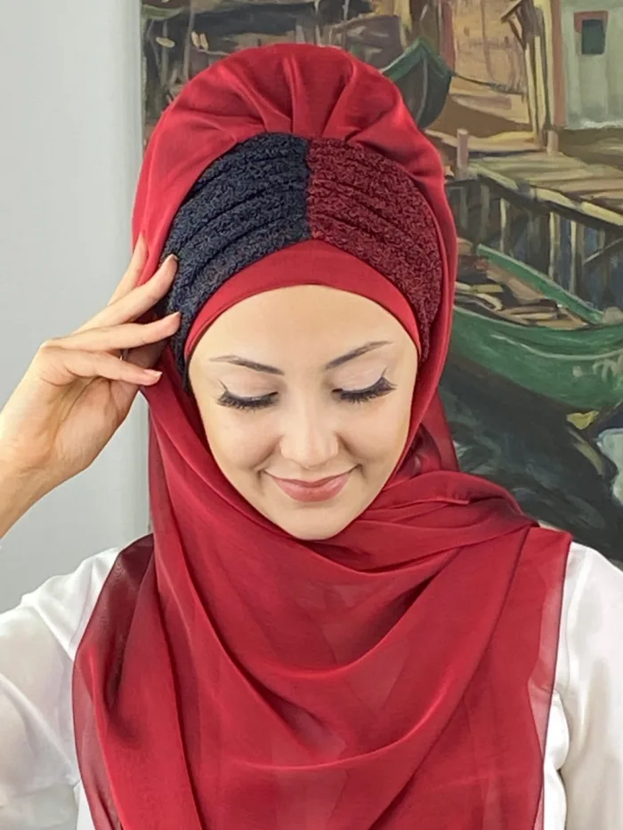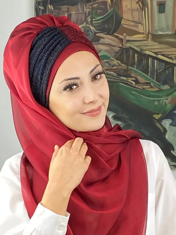 Sultan Büzgülü Oskar Fransız Şifon Hazır Şal – Bordo / Lacivert