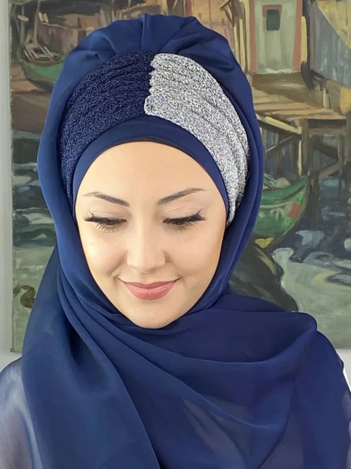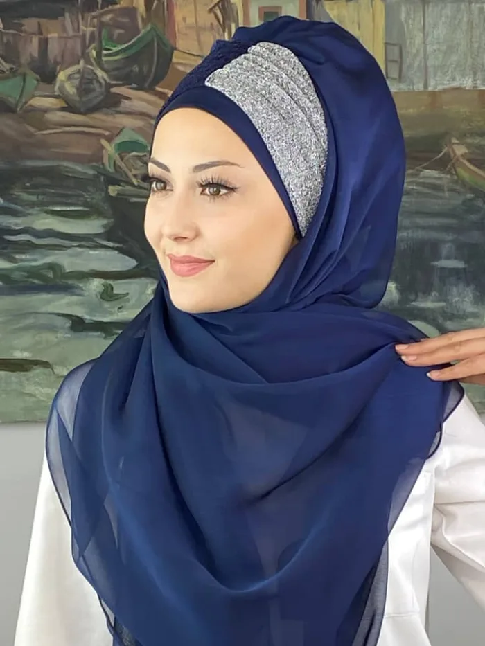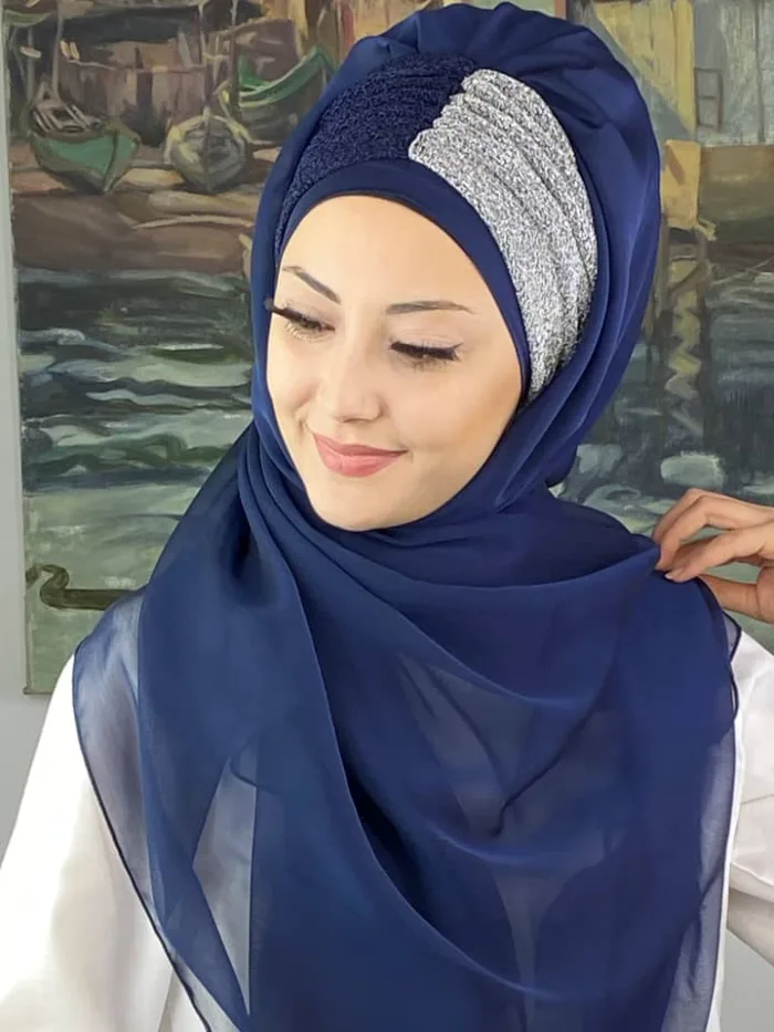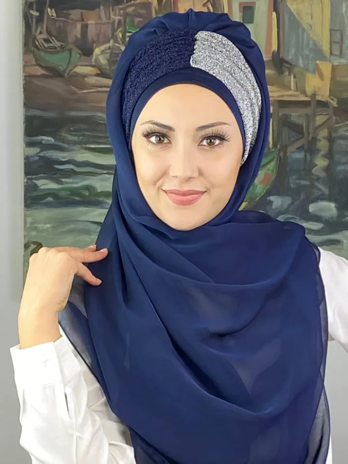 Sultan Büzgülü Oskar Fransız Şifon Hazır Şal – Lacivert / Açık Gri