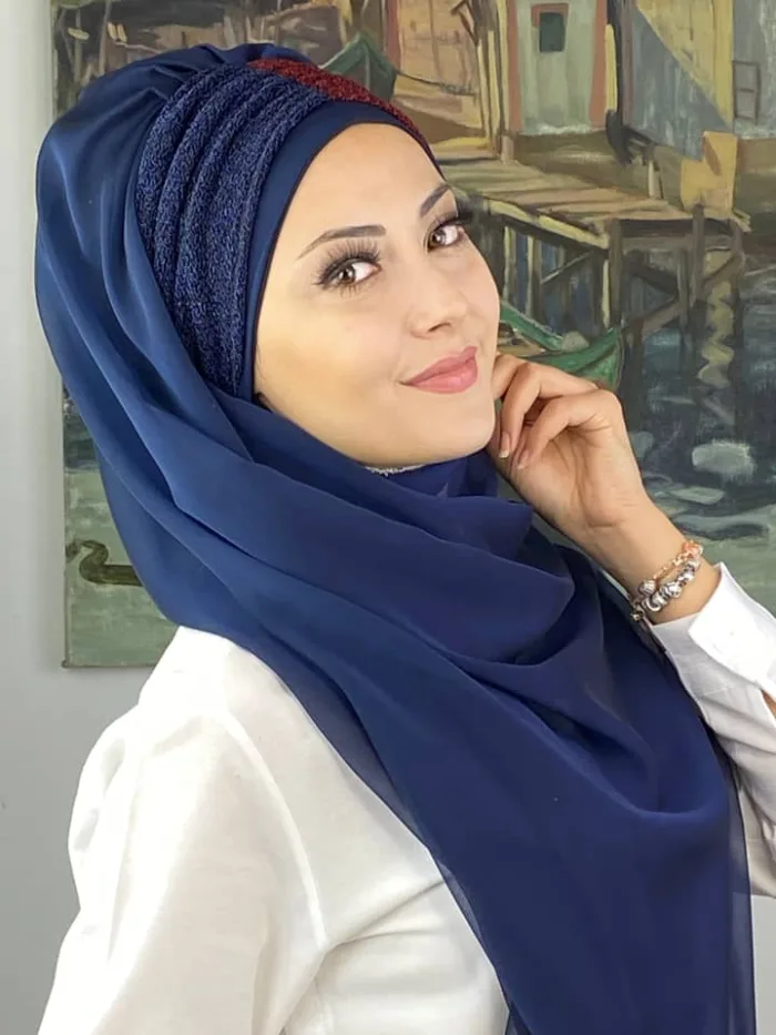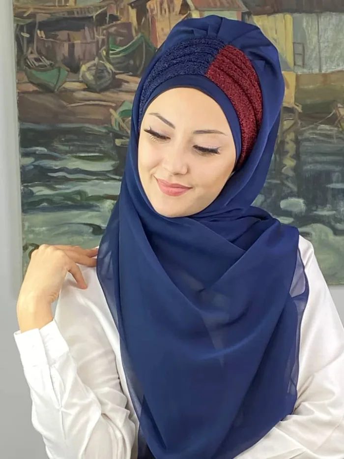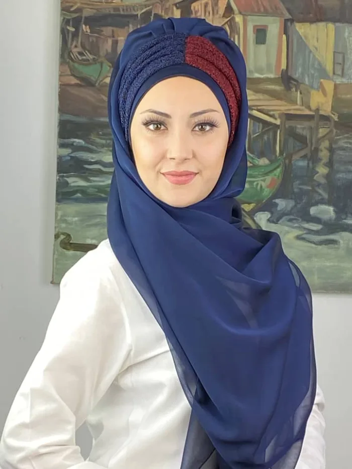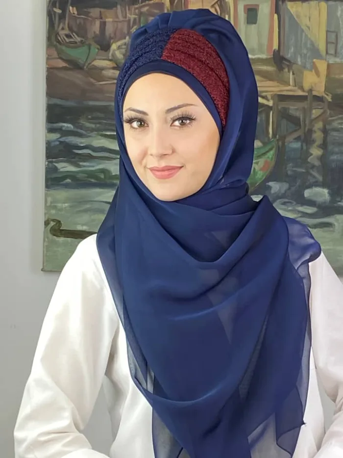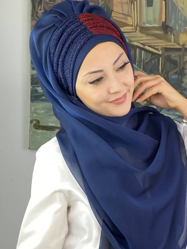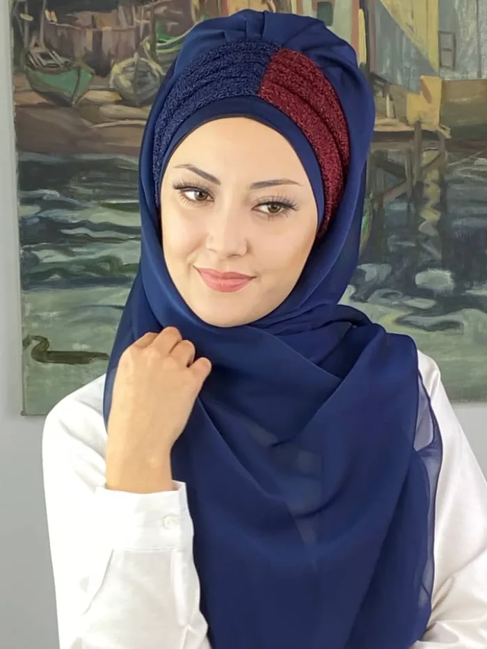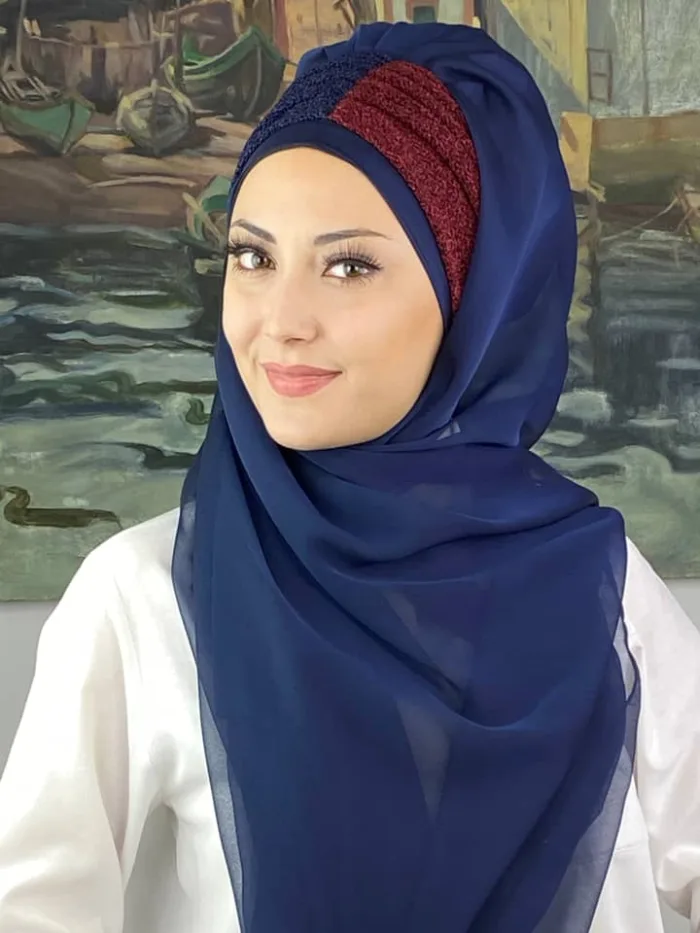 Sultan Büzgülü Oskar Fransız Şifon Hazır Şal – Lacivert / Bordo