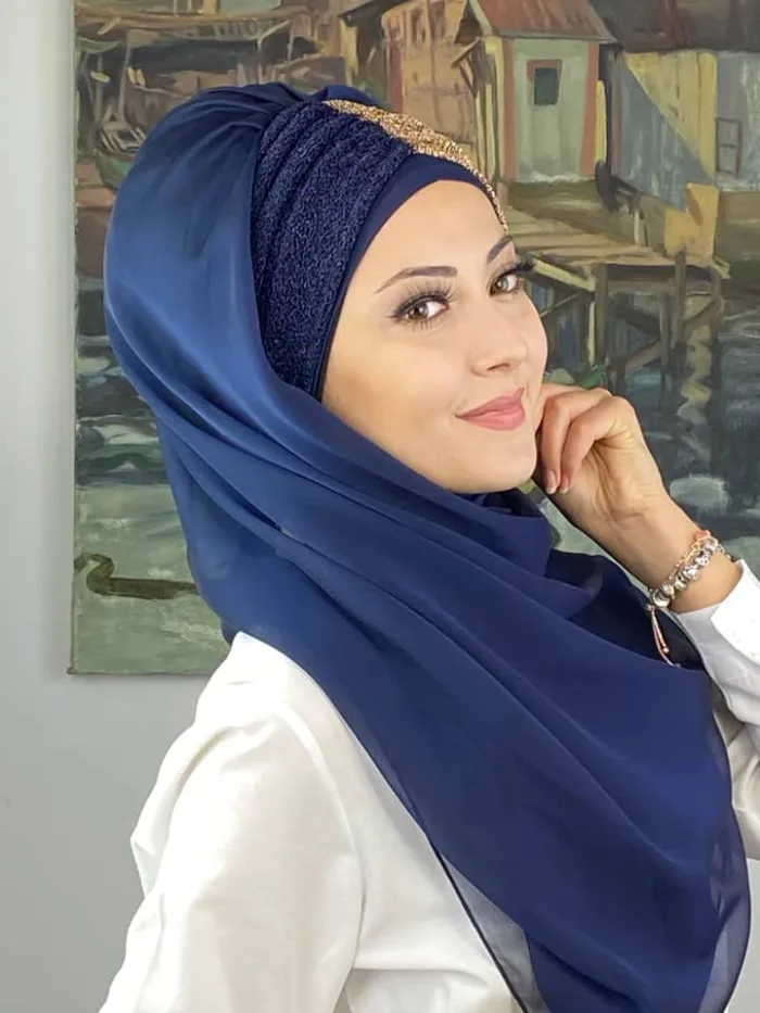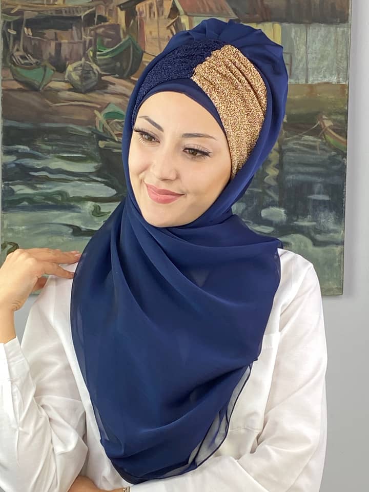 Sultan Büzgülü Oskar Fransız Şifon Hazır Şal – Lacivert / Sütlü Kahve