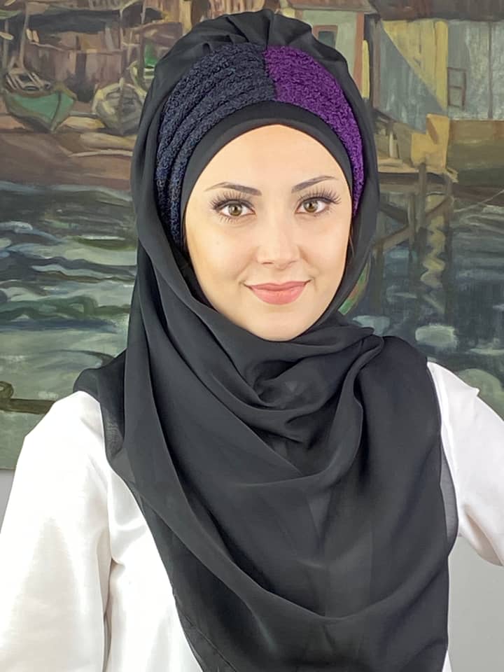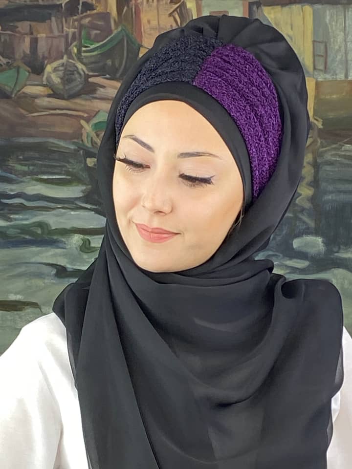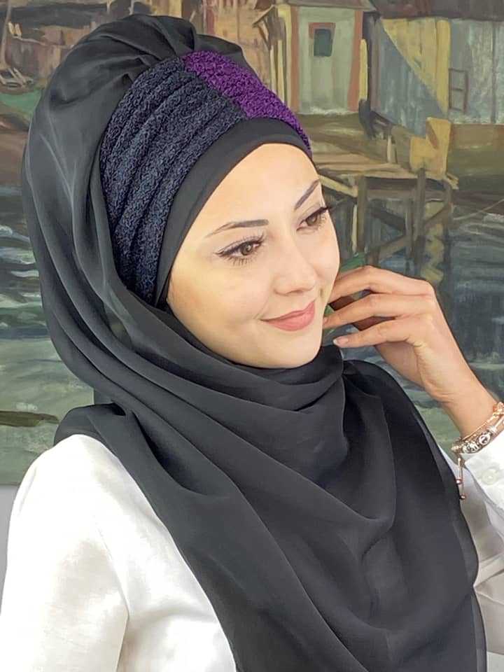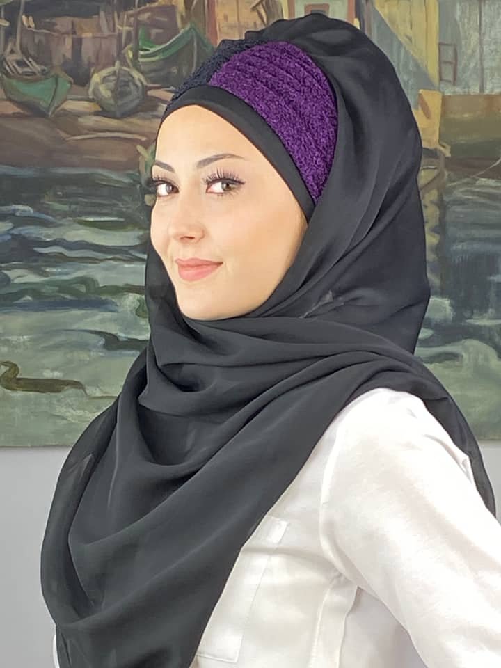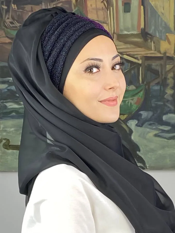 Özenle tasarlanmış büzgü formu, başın doğal hatlarına oturarak rahat bir kullanım sağlar. Gün boyu kaymadan formunu koruyan bu yapı, pratikliği şıklıkla bir araya getirir. Morun canlılığı, siyahın asil havasıyla birleştiğinde özel davetlerde göz kamaştırıcı bir denge yaratır.