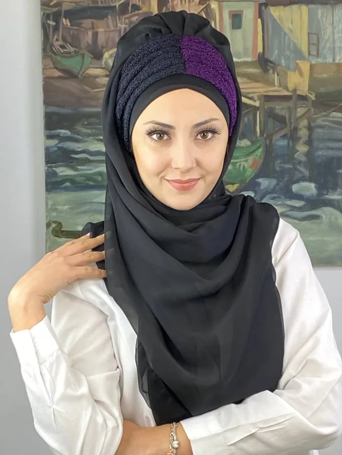 Siyah ve morun güçlü birlikteliği, her kadının gardırobunda bulunması gereken nadir bir zarafeti temsil eder. Sultan Büzgülü Oskar Fransız Şifon Hazır Şal – Siyah / Mor, klasik tonları modern detaylarla harmanlayarak sofistike bir görünüm sunar. Fransız şifonun zarif akışı, morun ihtişamıyla birleşerek etkileyici bir duruş oluşturur.