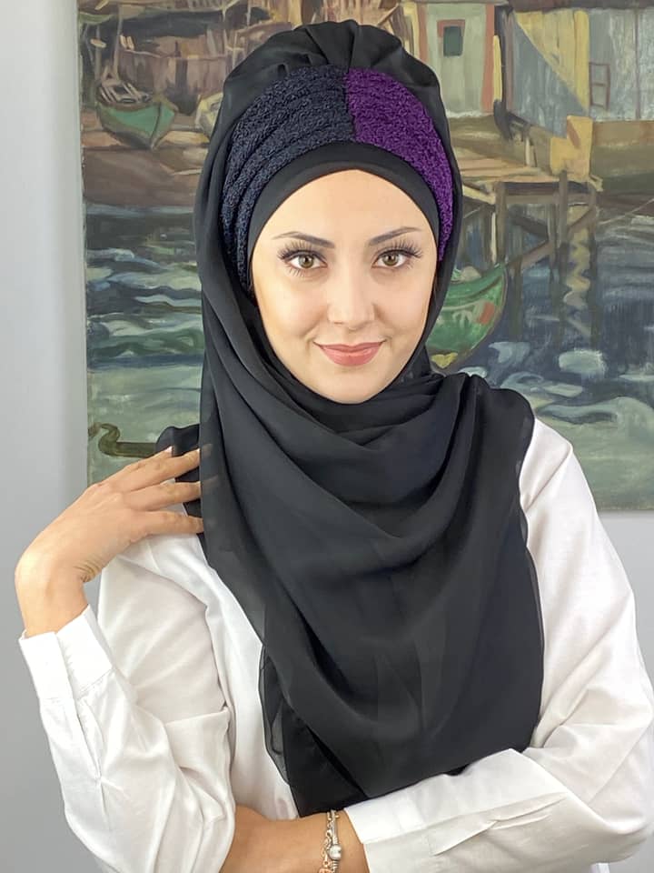 Sultan Büzgülü Oskar Fransız Şifon Hazır Şal – Siyah / Mor