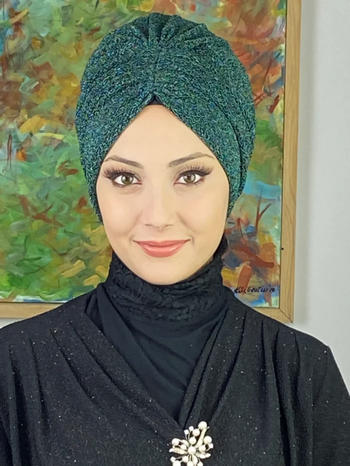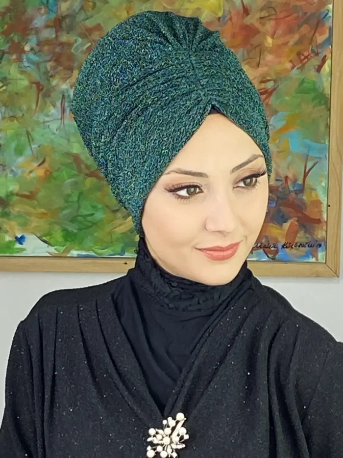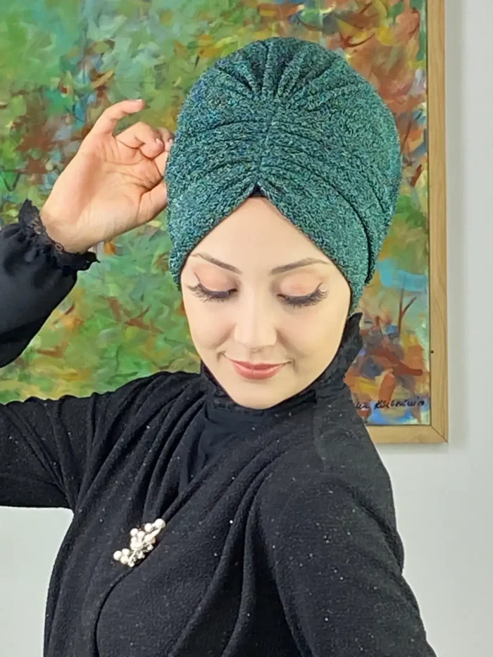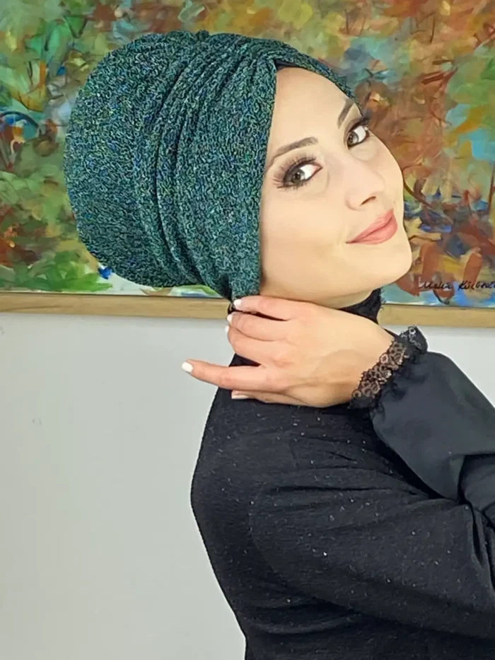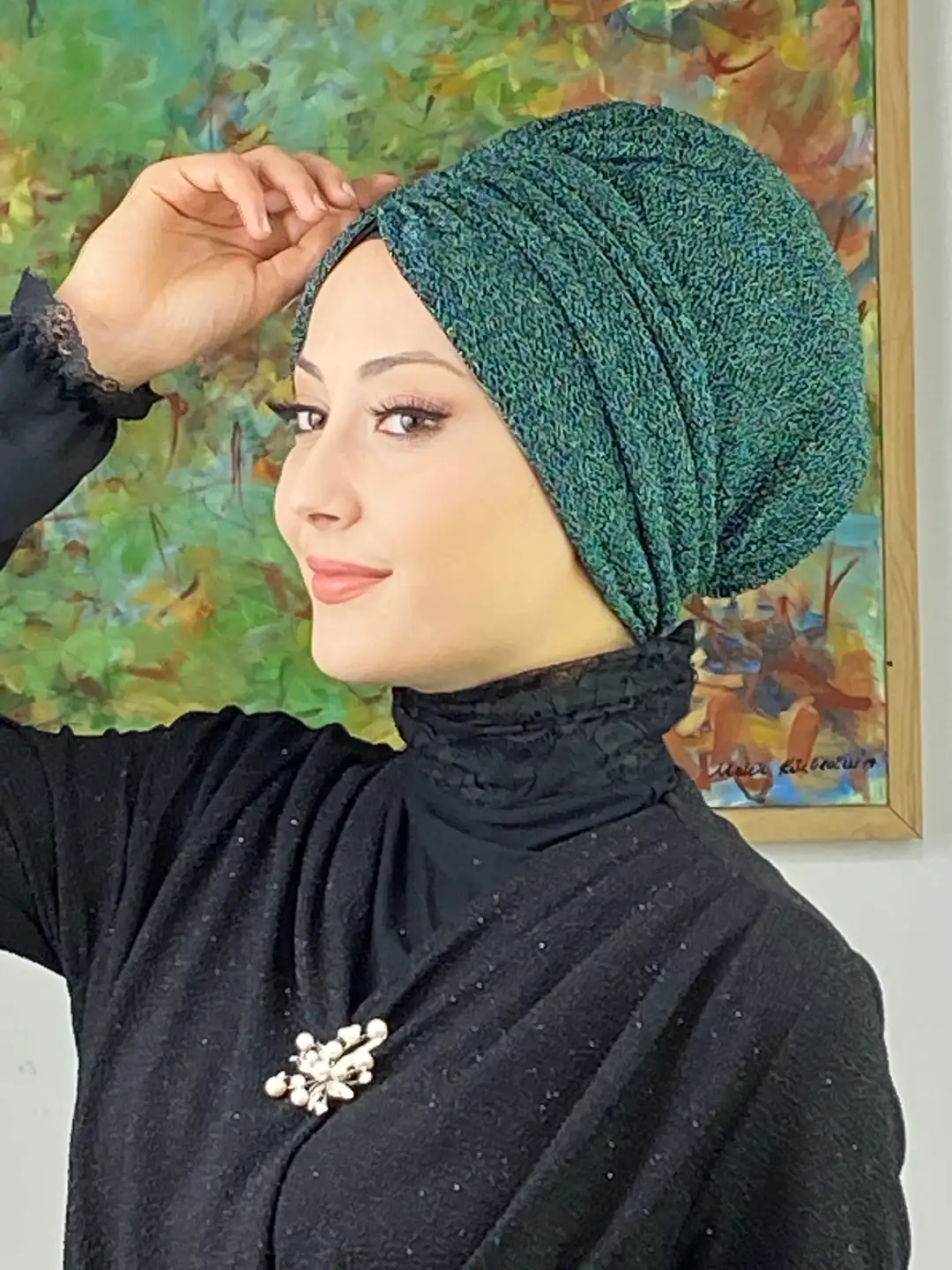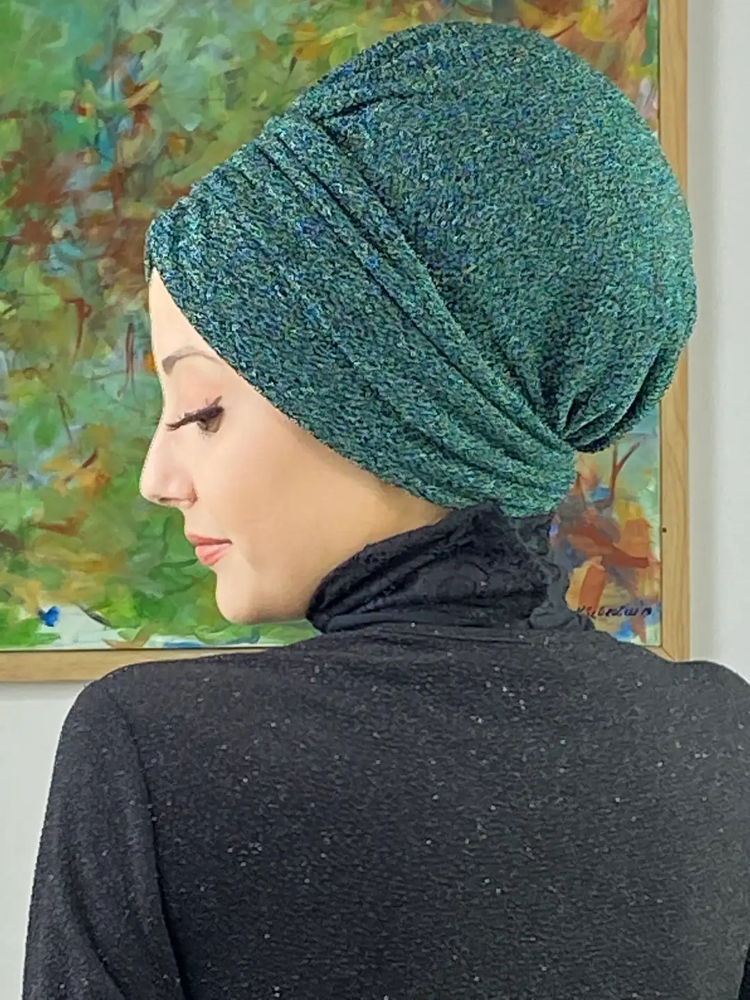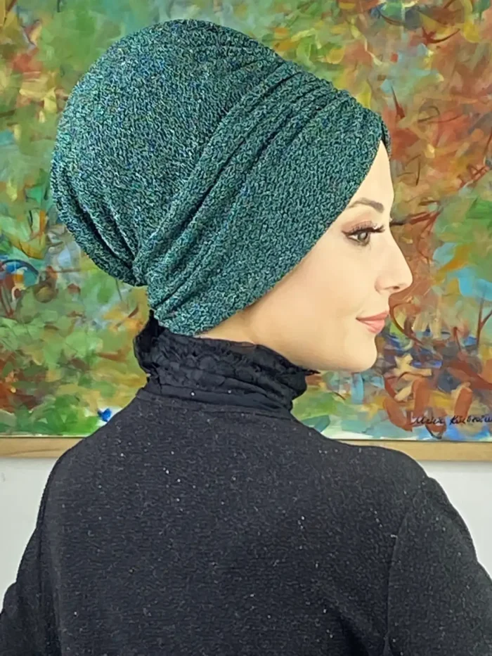 Koyu zümrüt büzgülü tesettür bone, zarafet ve doğallığı aynı potada eriten, asil tonuyla dikkat çeken bir parçadır.