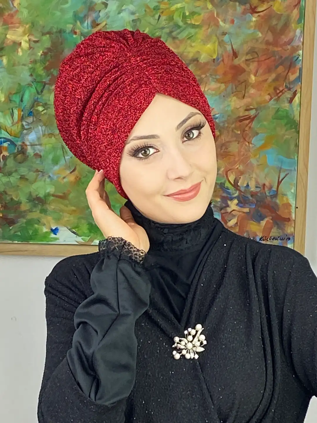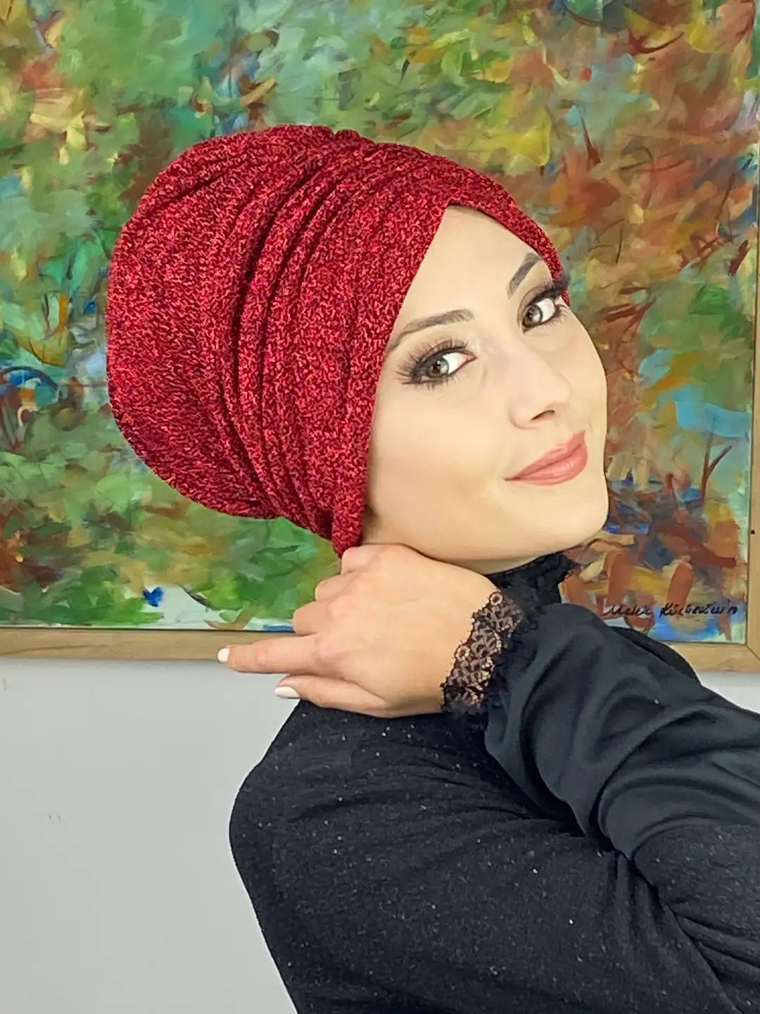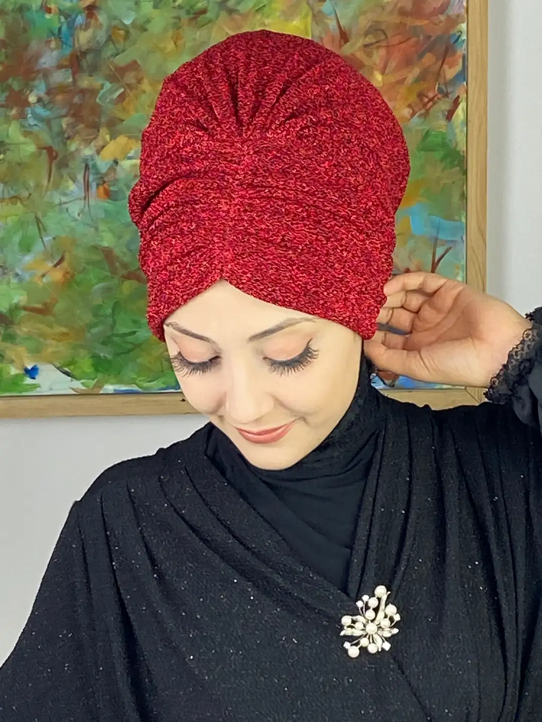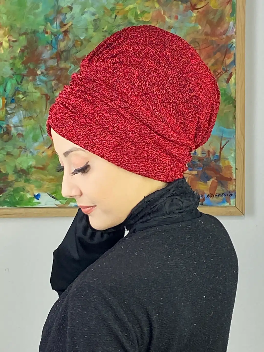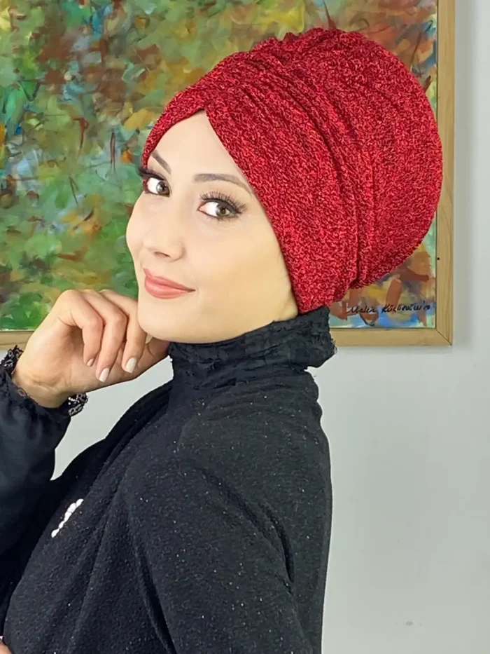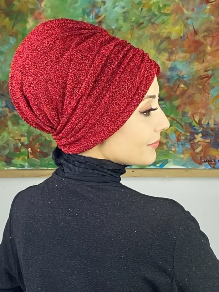 Canlı kırmızı büzgülü tesettür bone, şıklığı, konforu ve enerjiyi bir araya getiriyor.