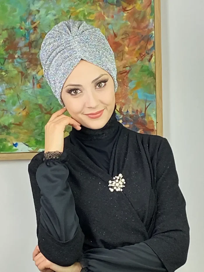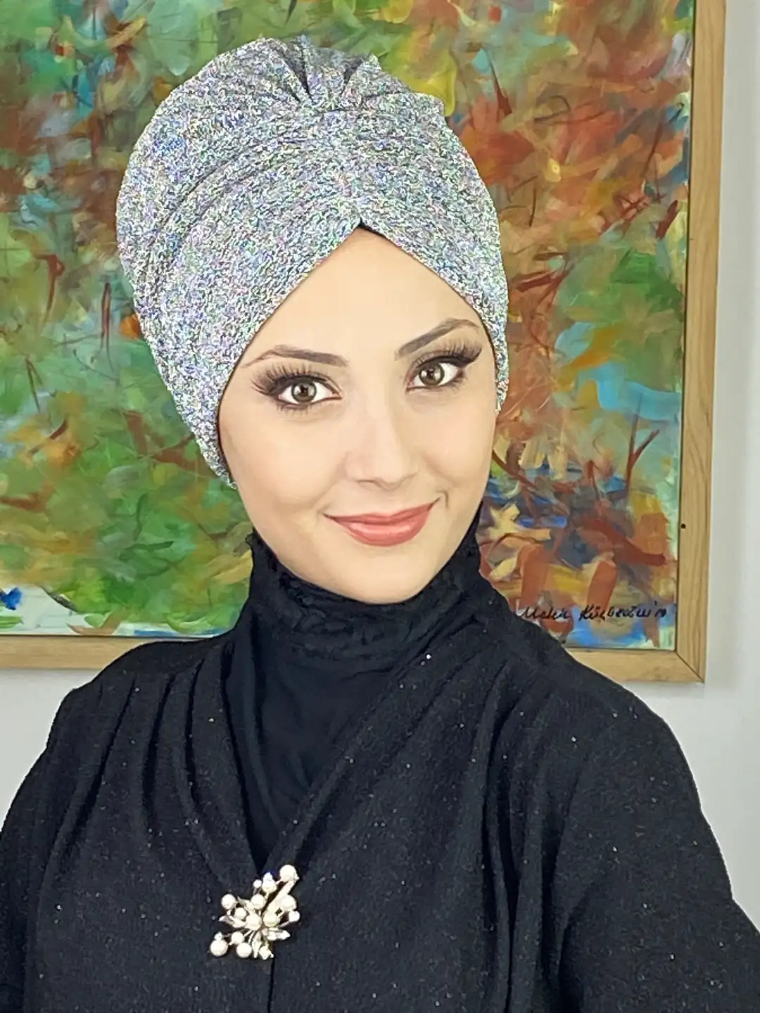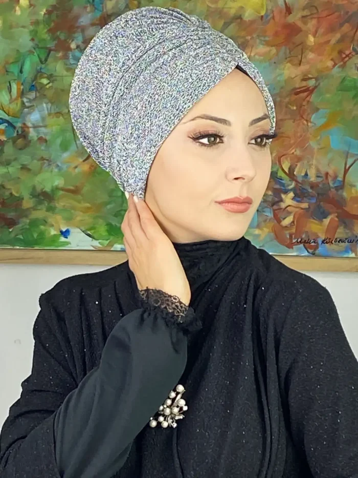 Gümüş renkli büzgülü tesettür bone, şıklığı ve modernliği bir araya getiren göz alıcı bir parçadır.