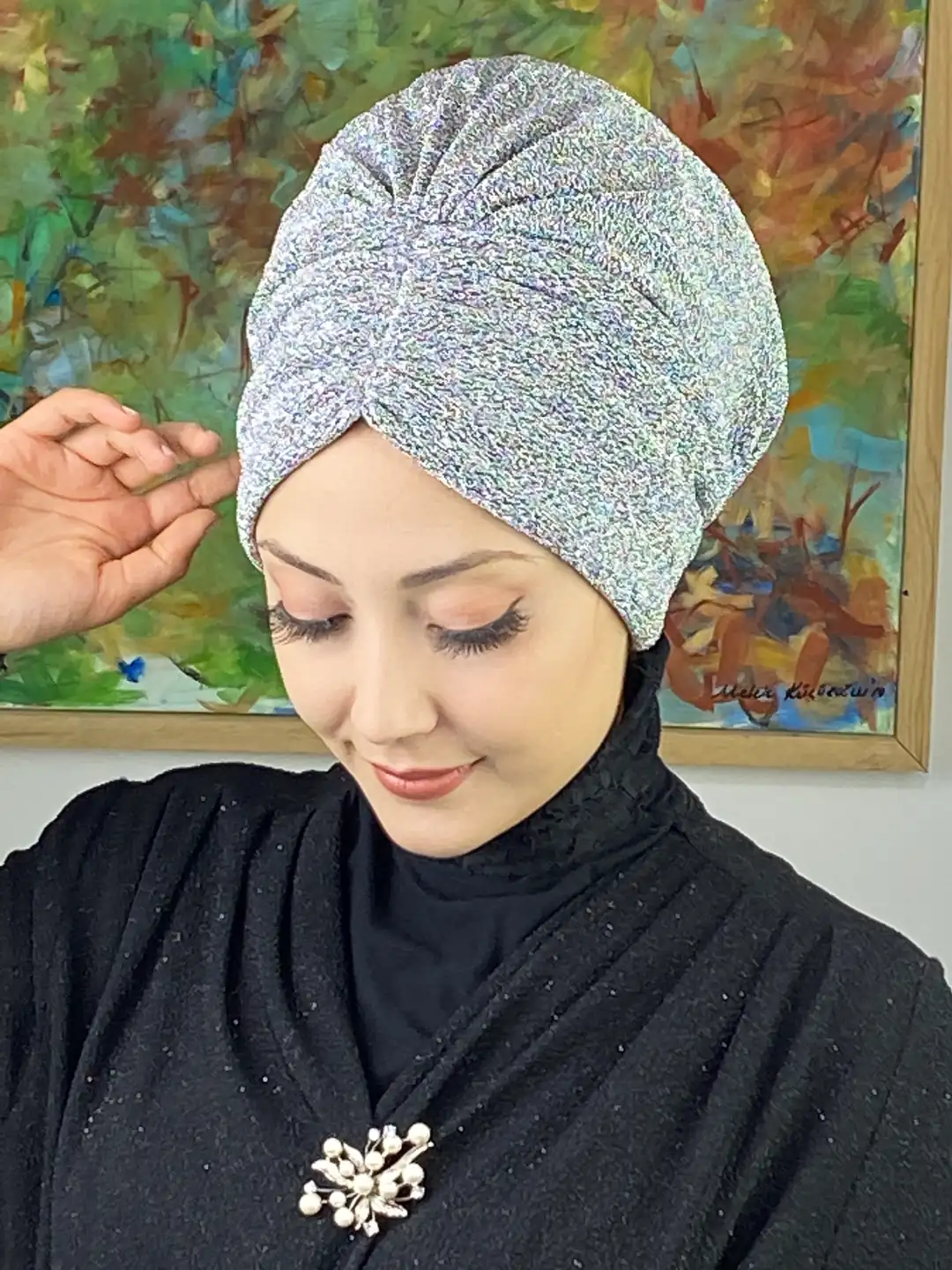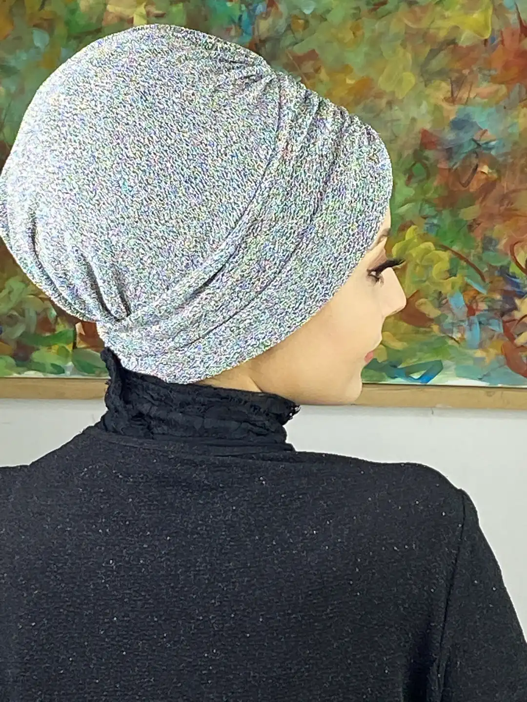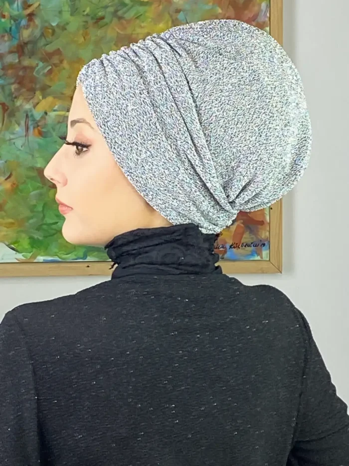 Gümüş renkli büzgülü tesettür bone, konforu ve şıklığı bir araya getirir.