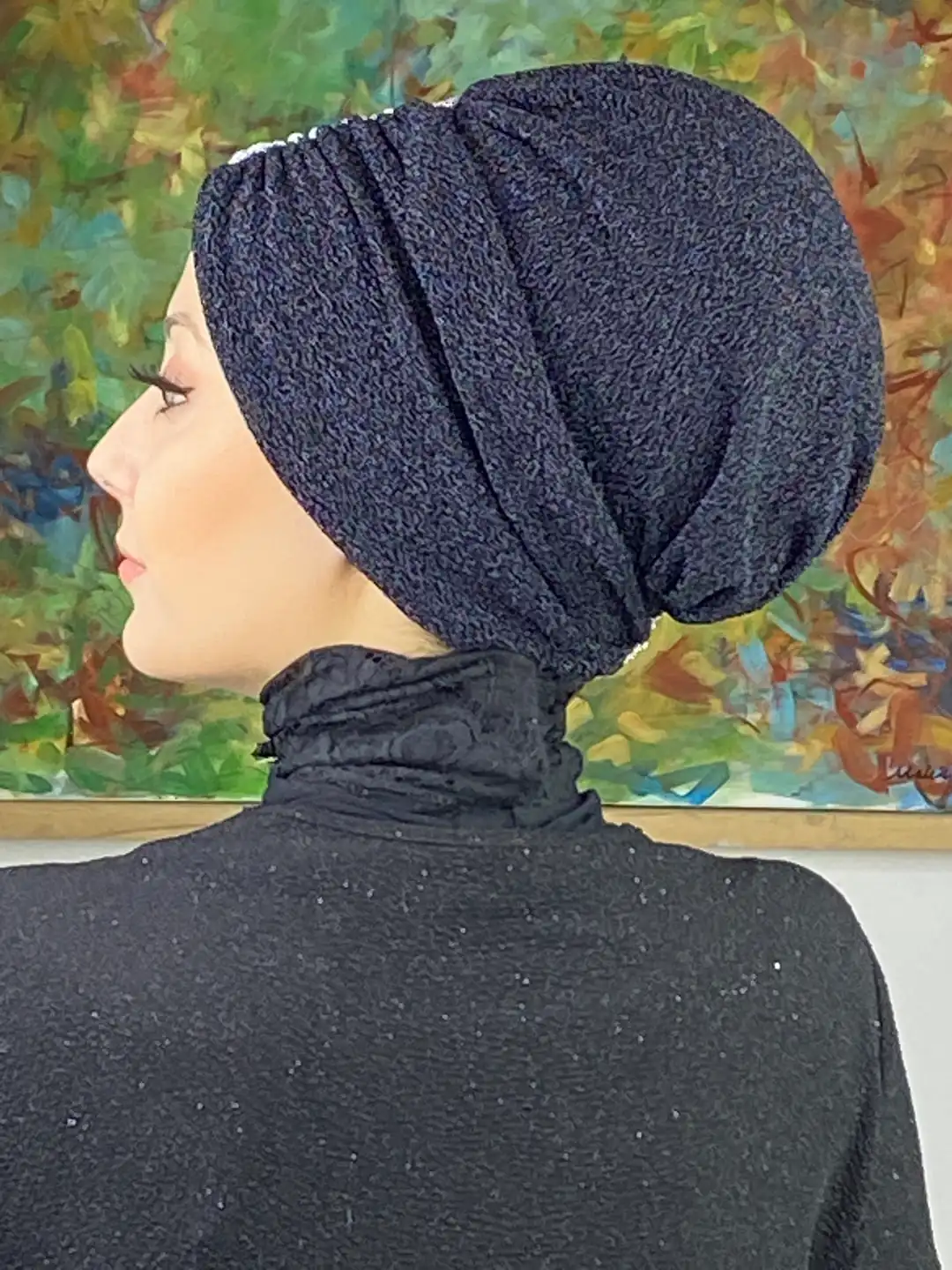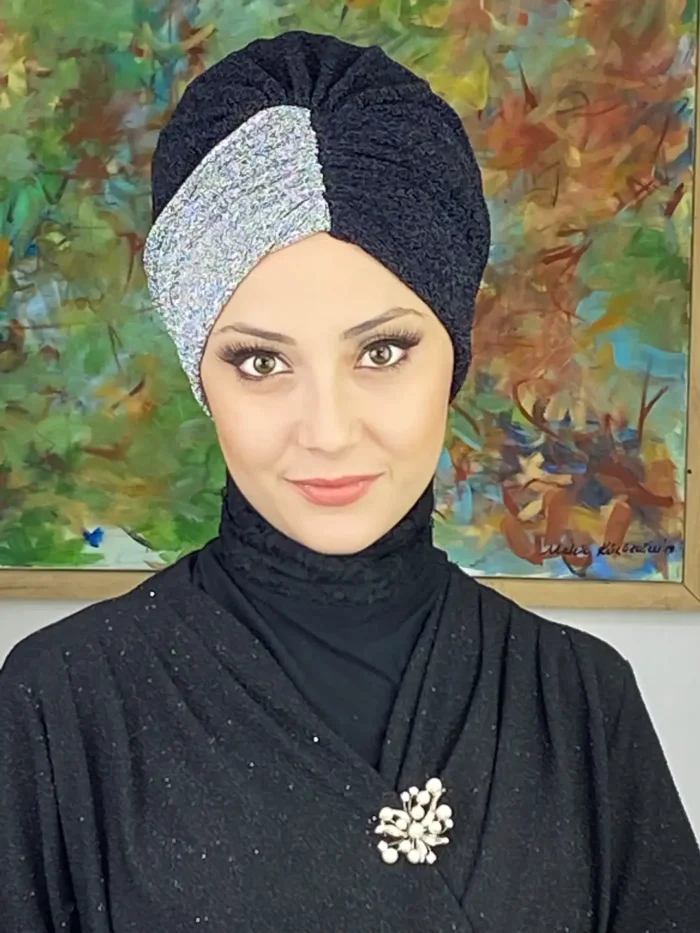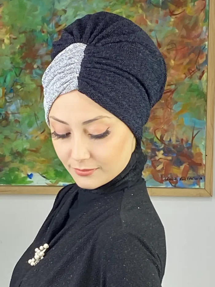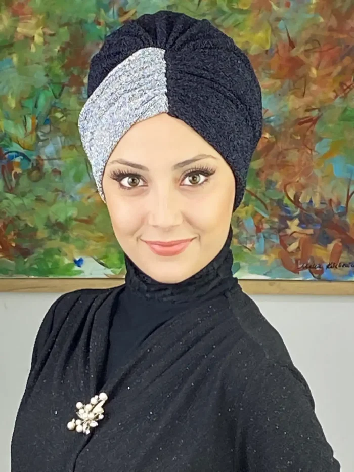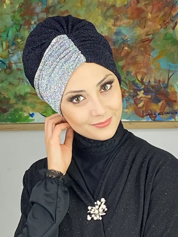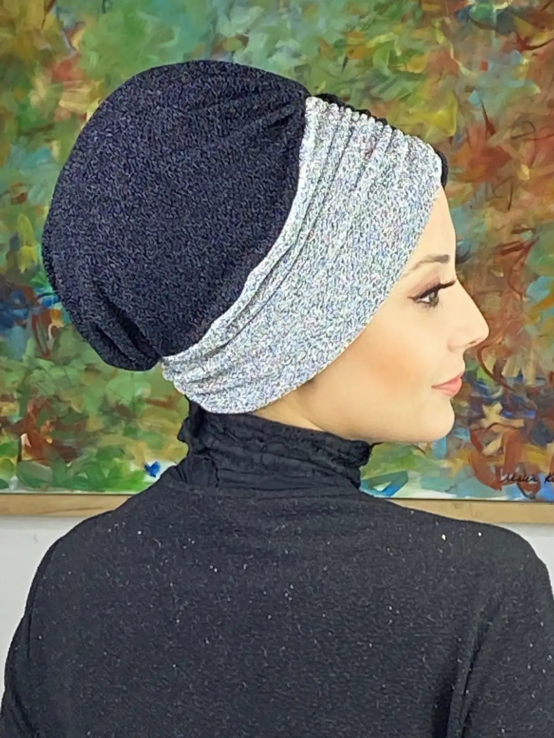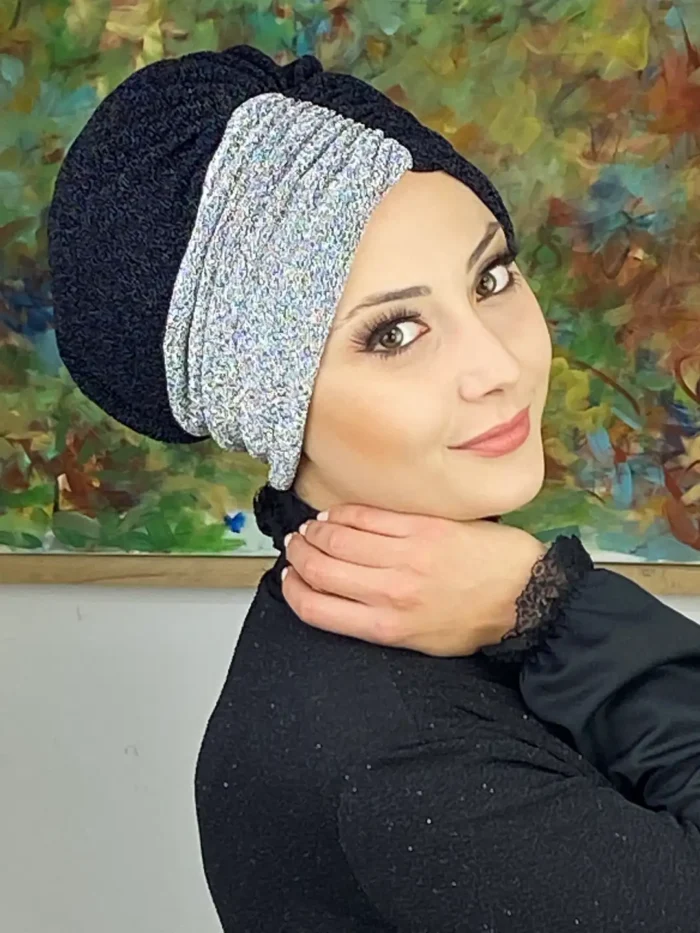Gümüş ve siyah renkli büzgülü tesettür bone, konforu, modernliği ve ışıltıyı bir araya getirir.