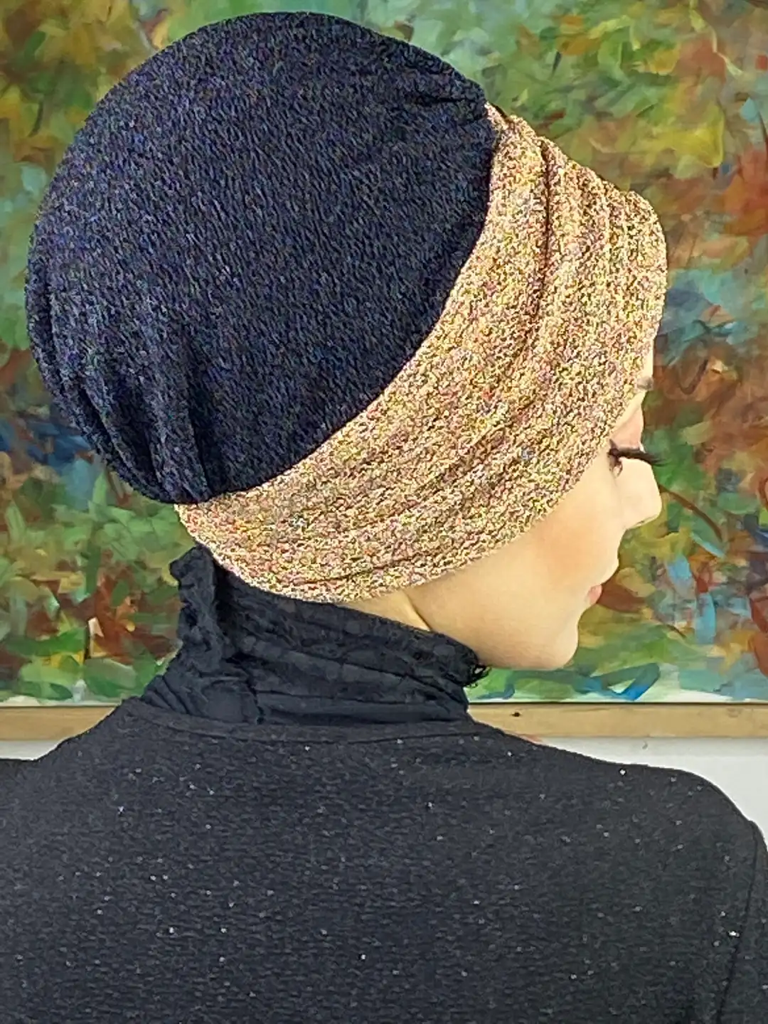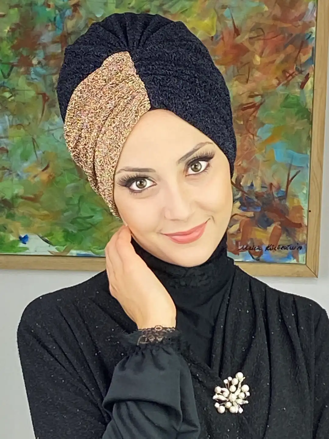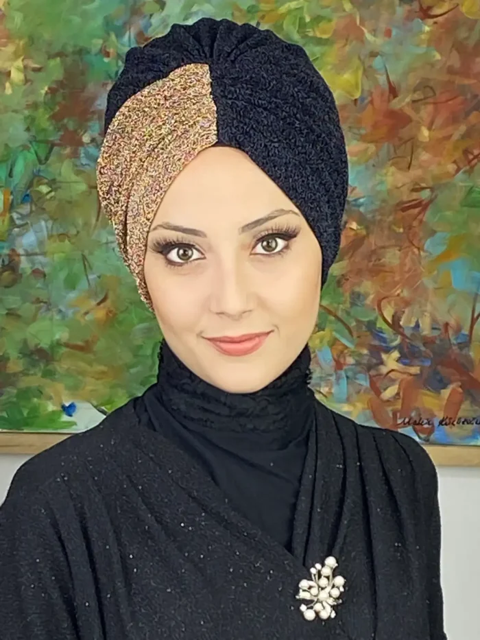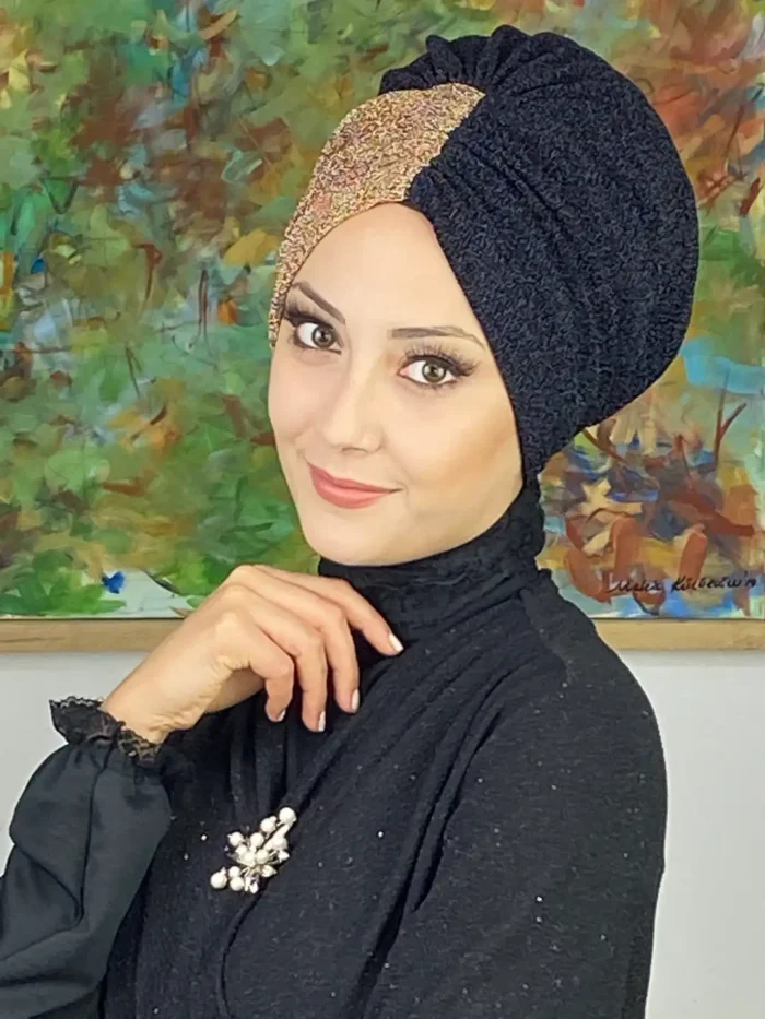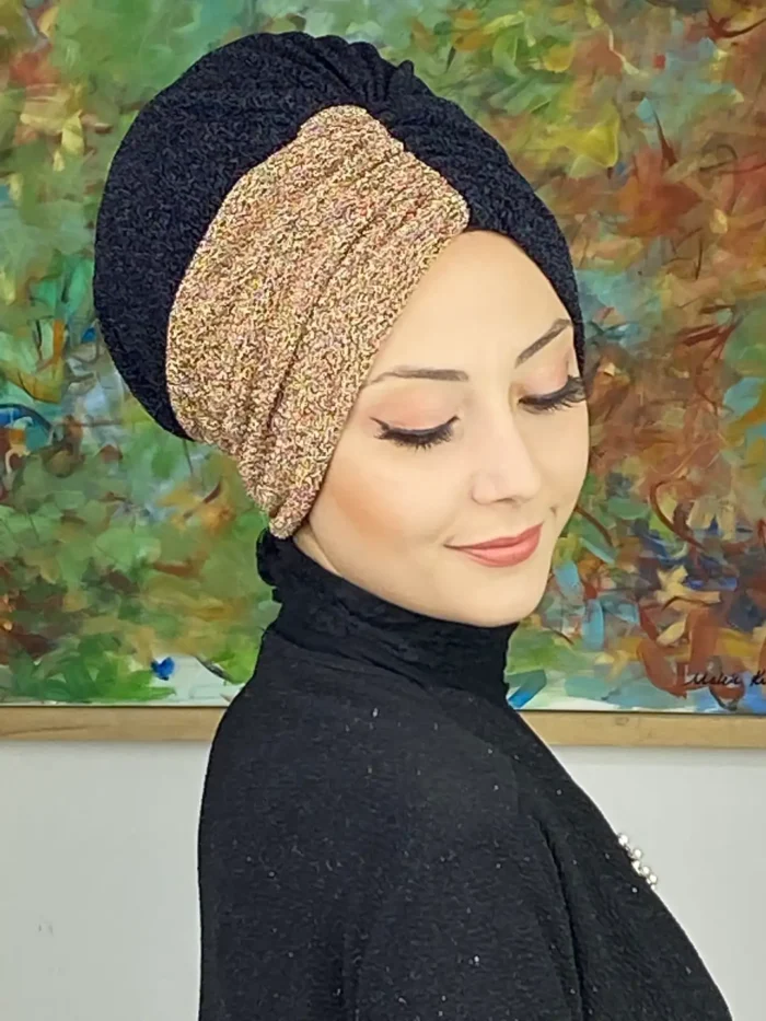 Siyah ve altın renkli büzgülü tesettür bone, klasik zarafeti modern bir ışıltıyla buluşturur.
