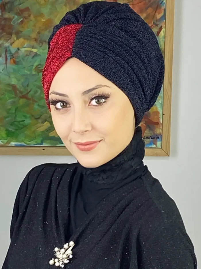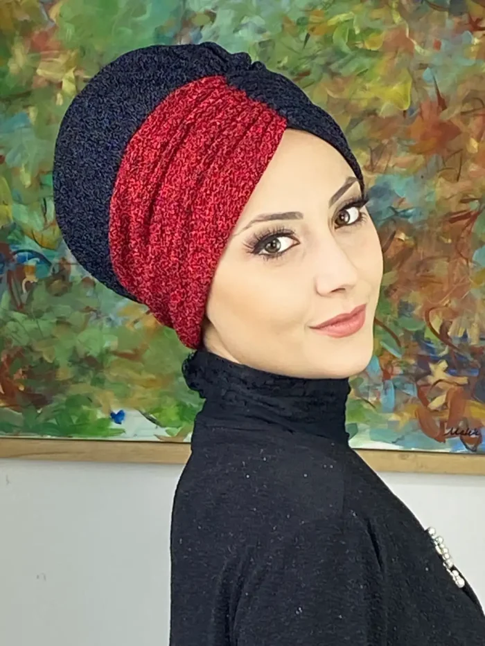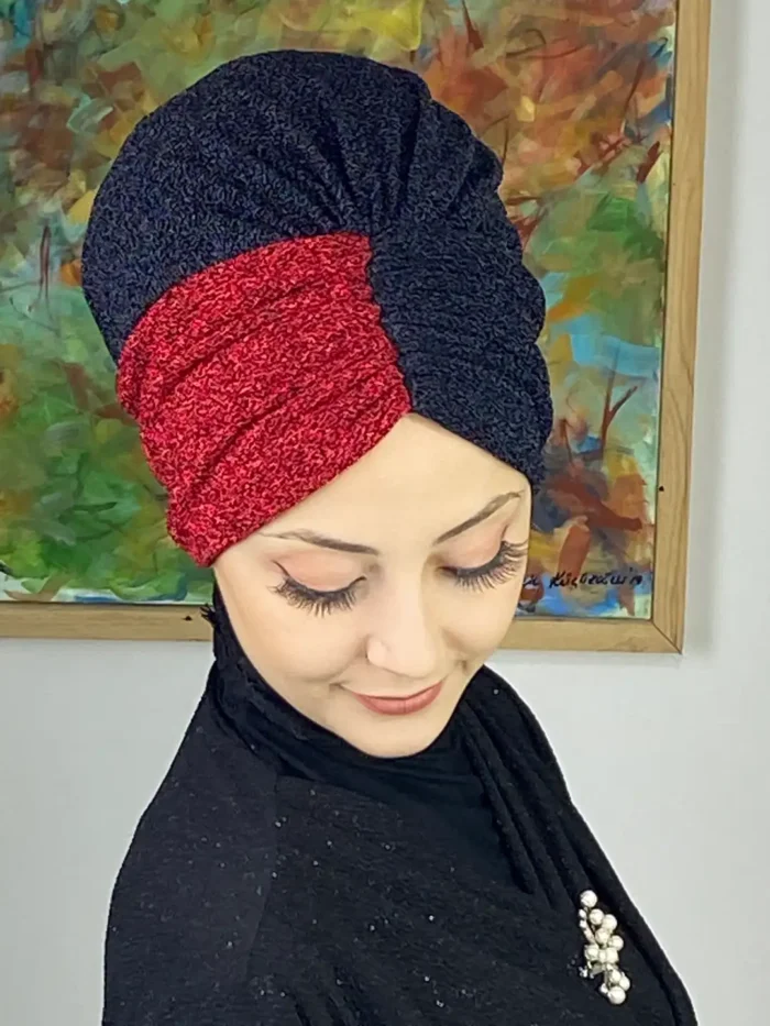 Kırmızı ve siyah renkli büzgülü tesettür bone, güçlü kadınların stilini tamamlayan özel bir parçadır.